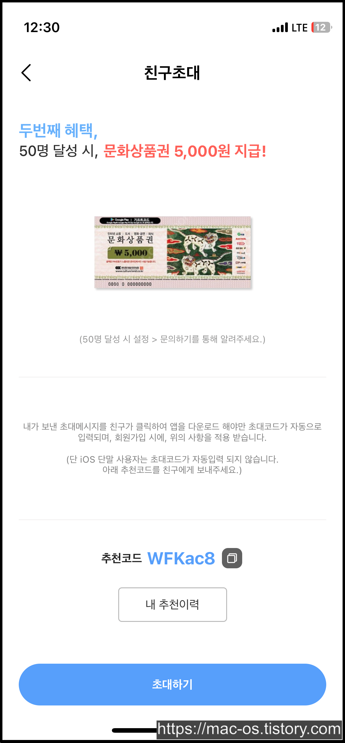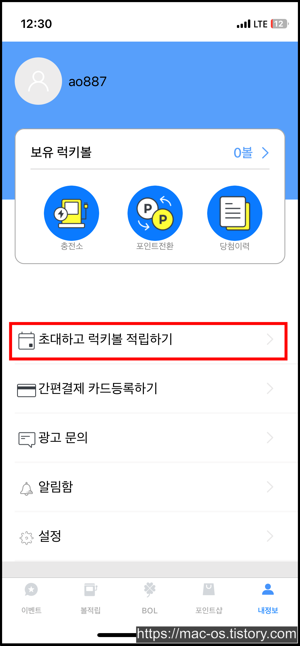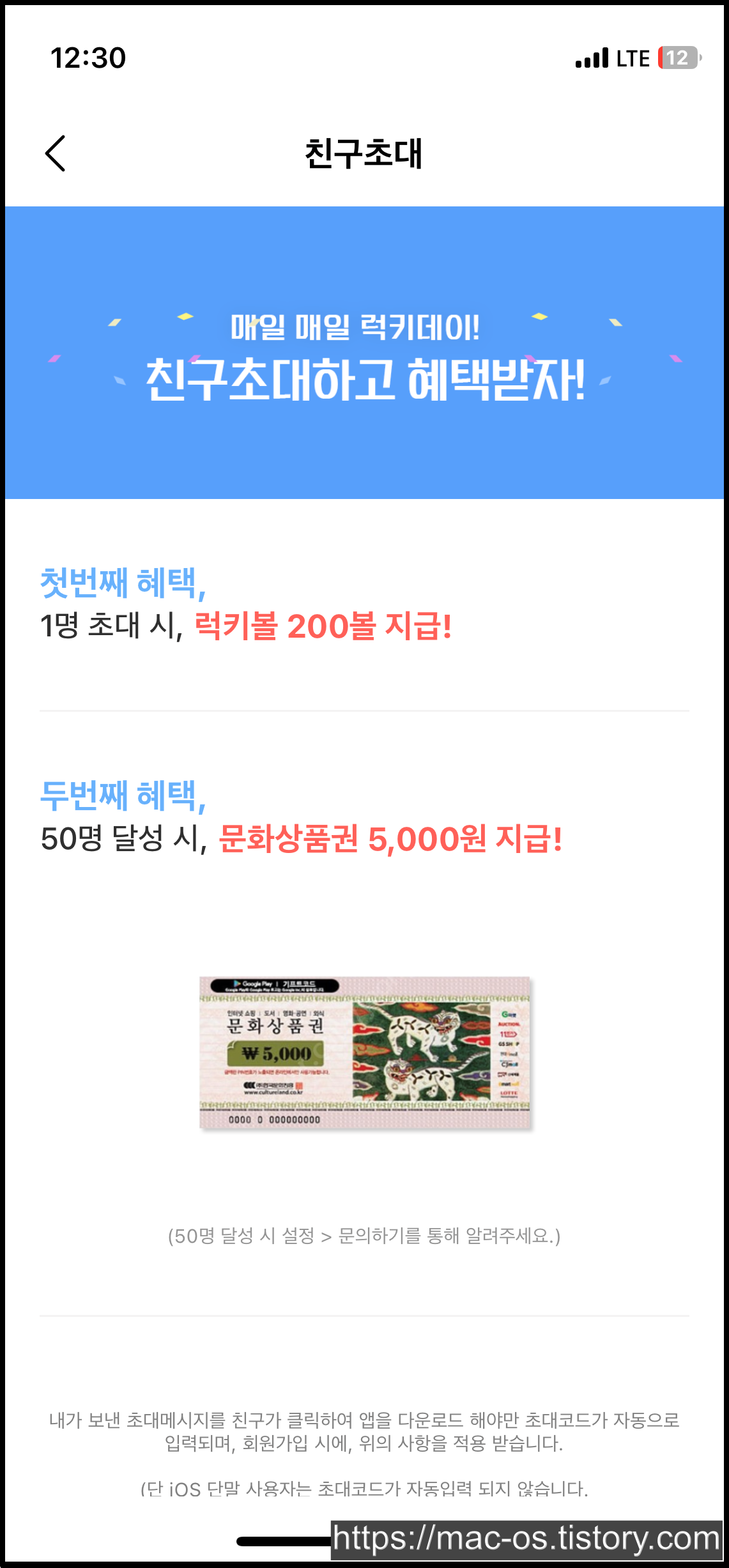내정보 페이지에서 초대하고 럭키볼 적립하기를 누르면 자신의 추천인 코드를 확인할 수 있습니다. 친구초대 이벤트는 1명 초대 시마다 럭키볼 200볼, 50명 달성 시 문화상품권 5,000원을 준다고 하네요.