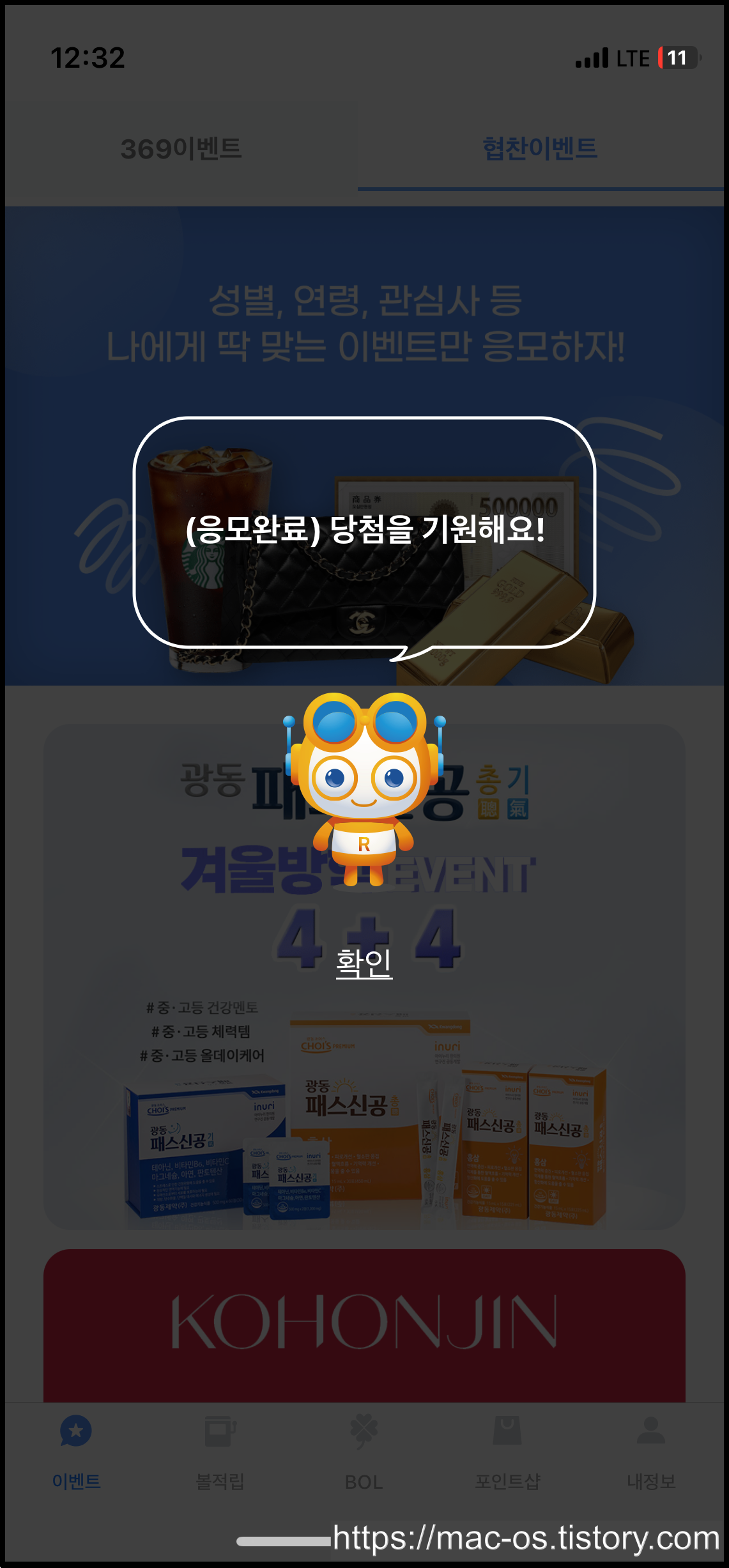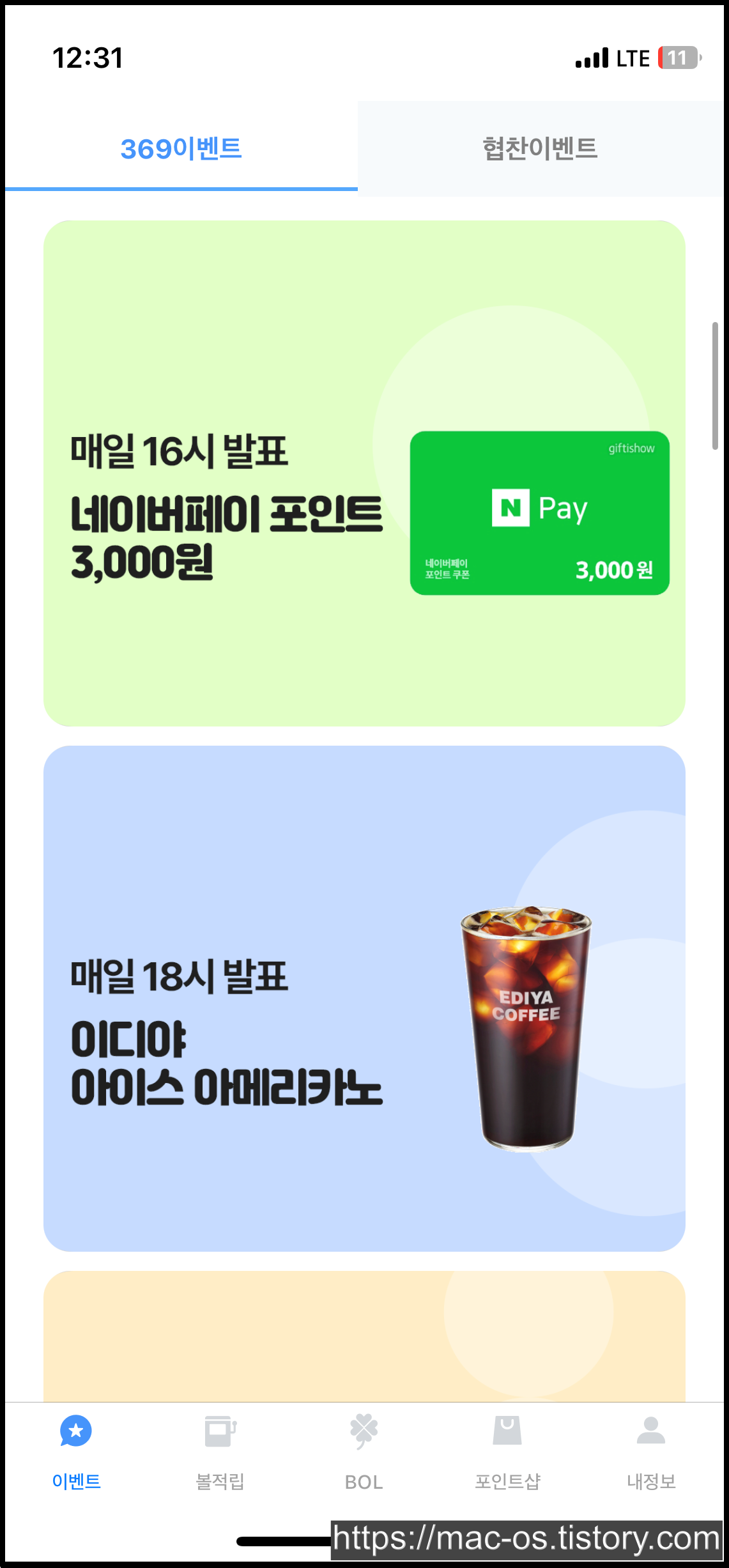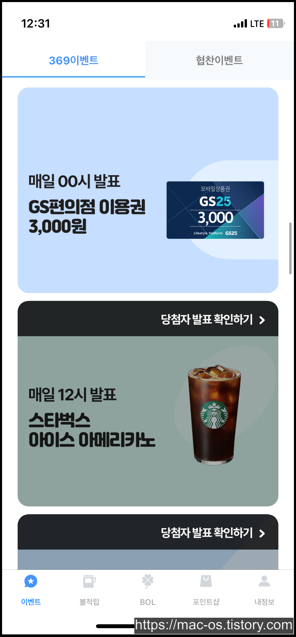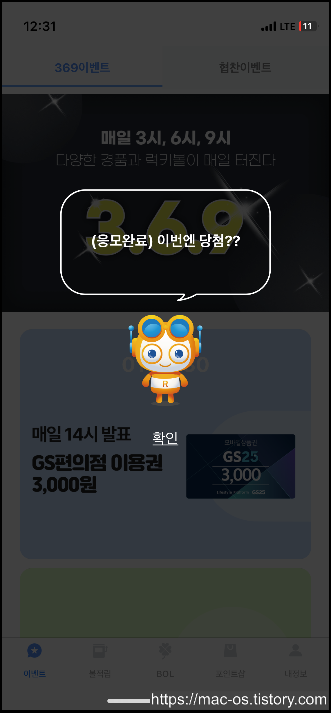 BOL 탭으로 이동하면 여러 배너가 있는데, 아무거나 눌러서 원하는 숫자를 입력하면 응모가 완료돼요. 번호를 맞추면 배너에 기재된 금액만큼 포인트를 받을 수 있고, 만약 여러 명이 맞추면 1/N 분산해서 준다고 하네요.