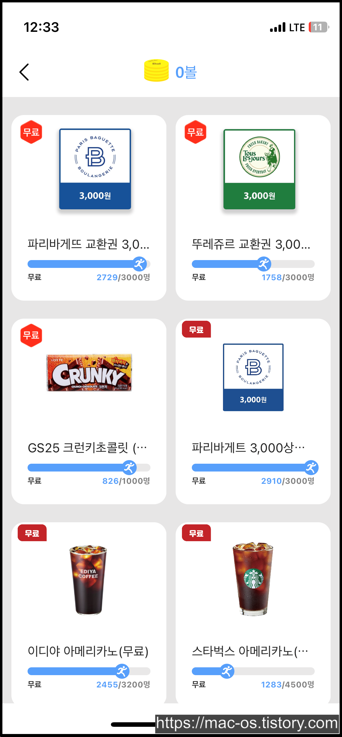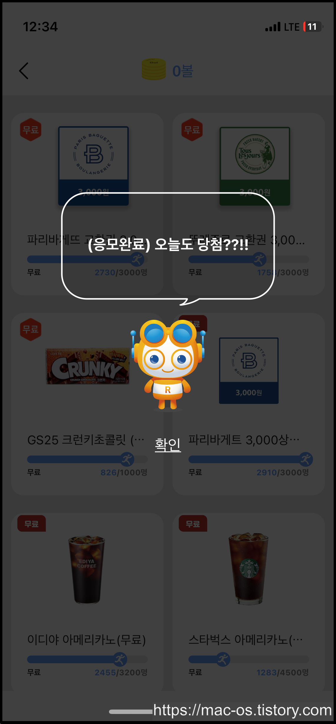 기프티콘 무료 뽑기는 럭키볼을 사용하지 않아요. 여기서도 아까처럼 그냥 마음에 드는걸 터치하면 응모가 바로 끝나요.
