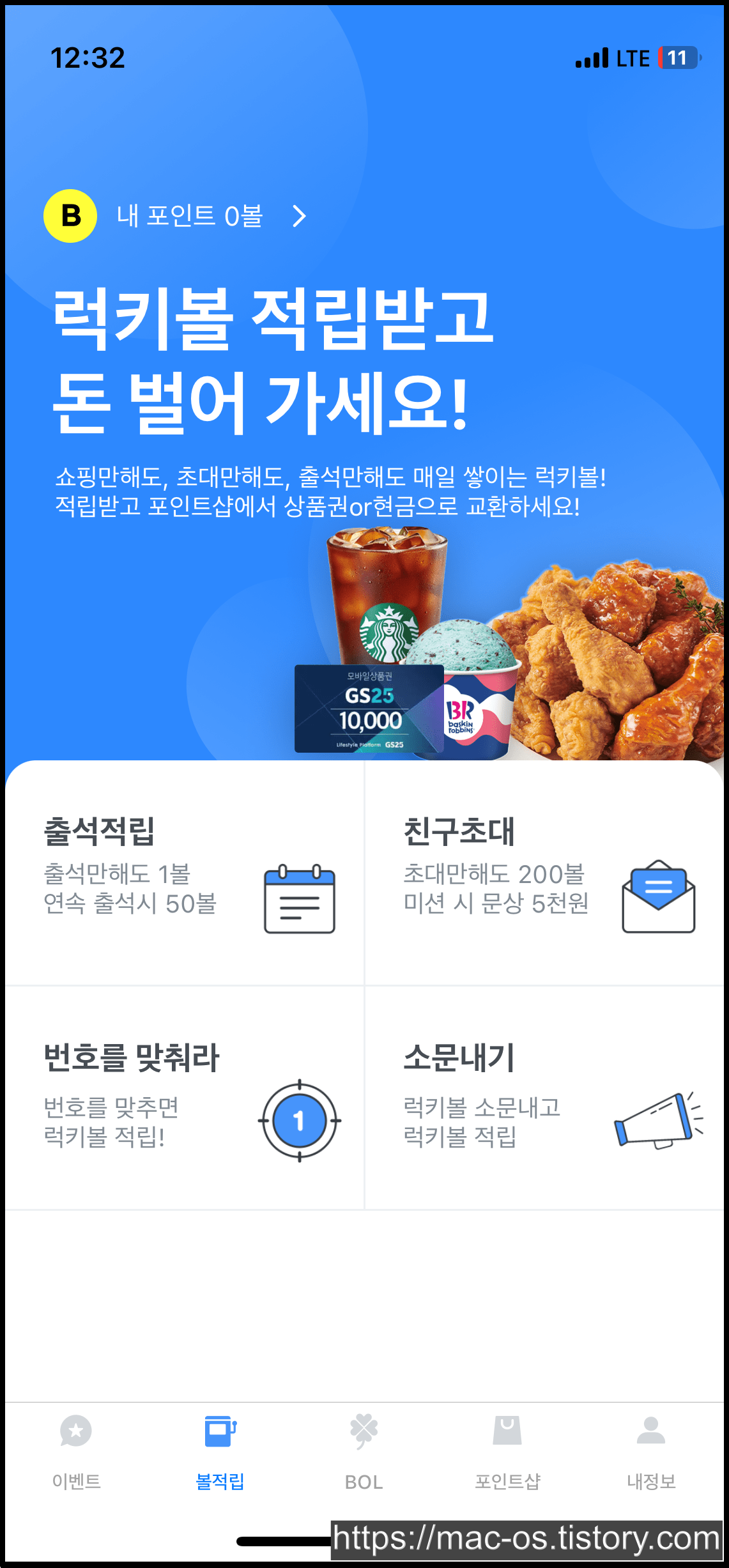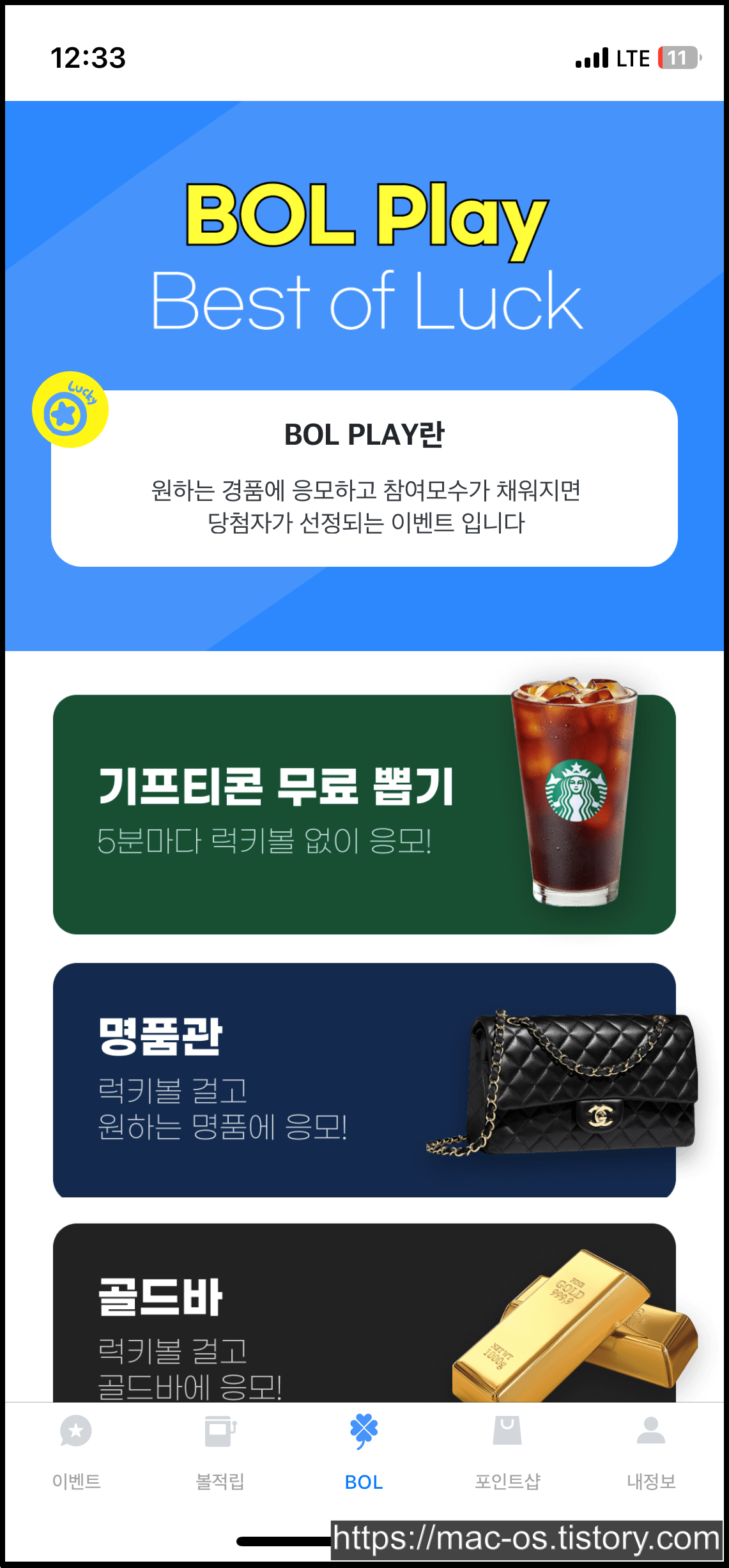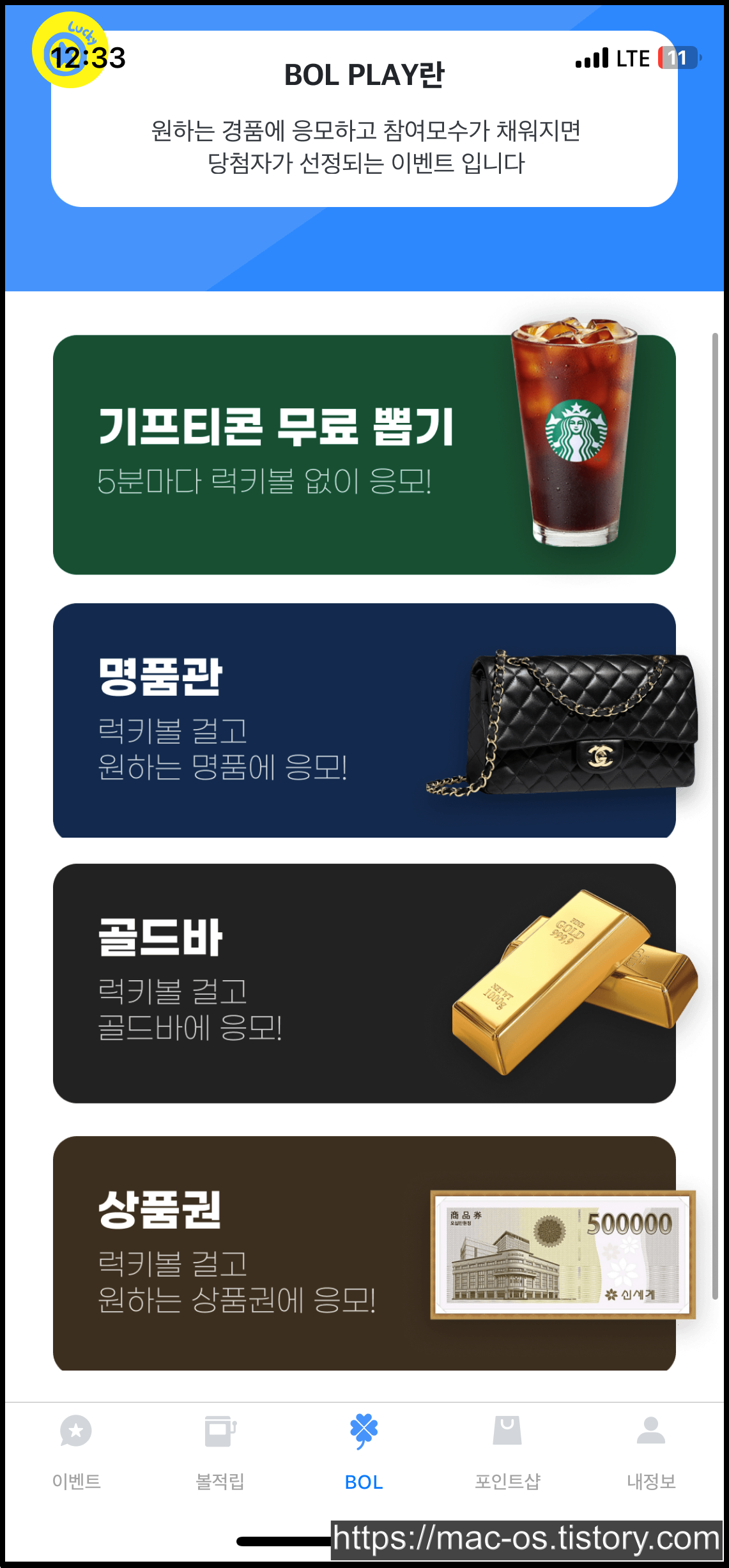BOL Play로 이동해보면 기프티콘 무료 뽑기, 명품관, 골드바 이런 것들도 있어요. 럭키볼을 사용하면 조금 더 비싼 경품에 도전할 수 있는 구조네요.