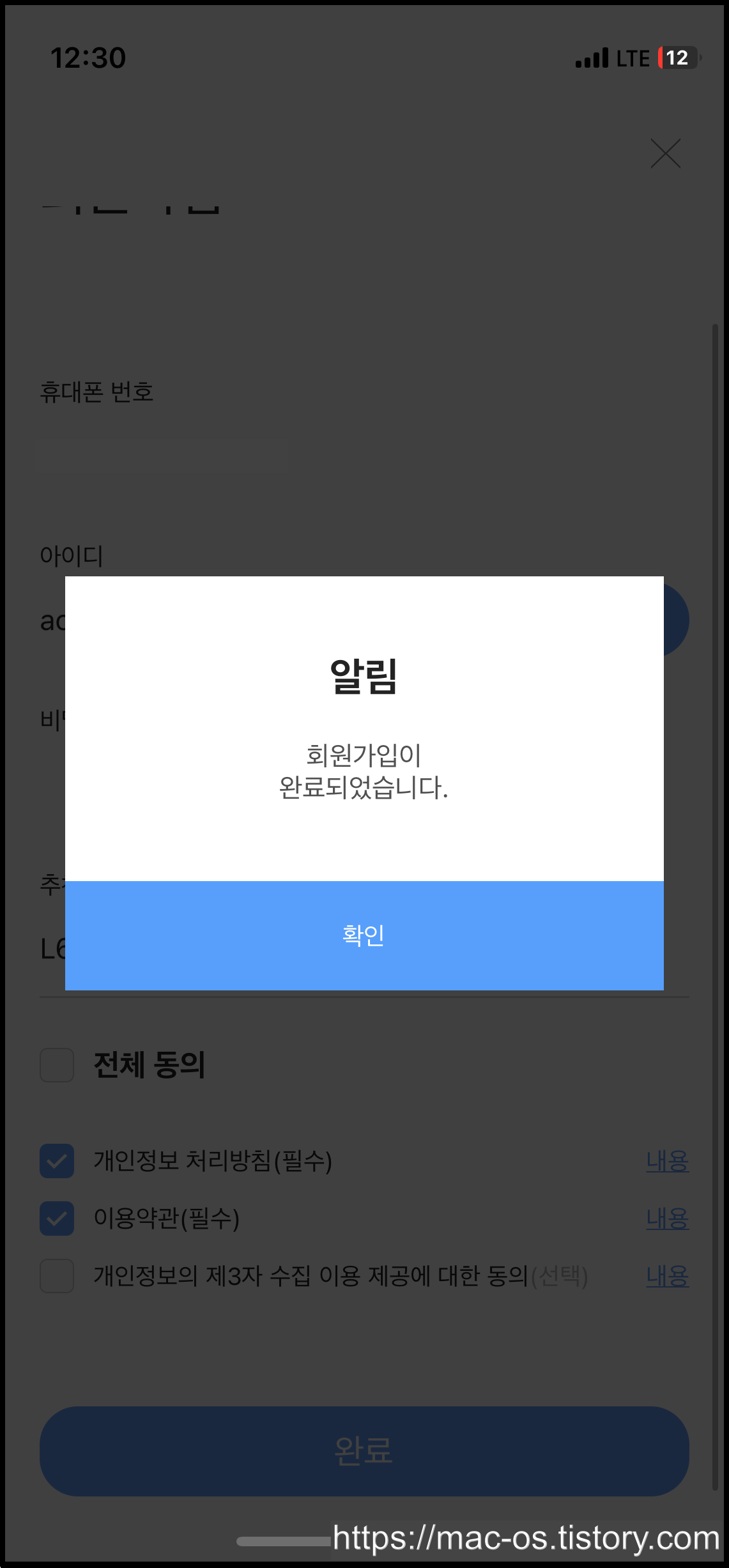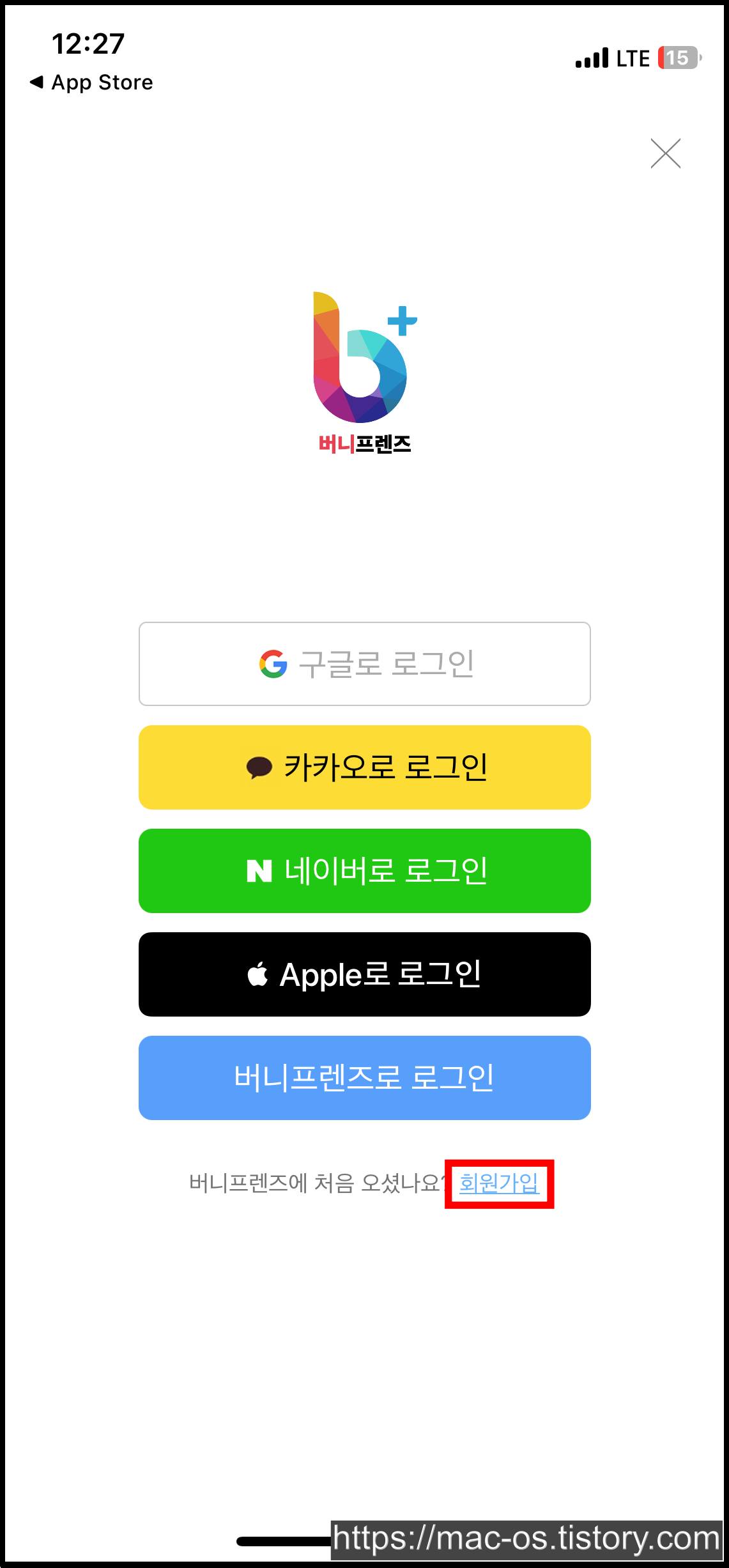 로그인 페이지에서 회원가입을 터치해 회원가입을 진행합니다.