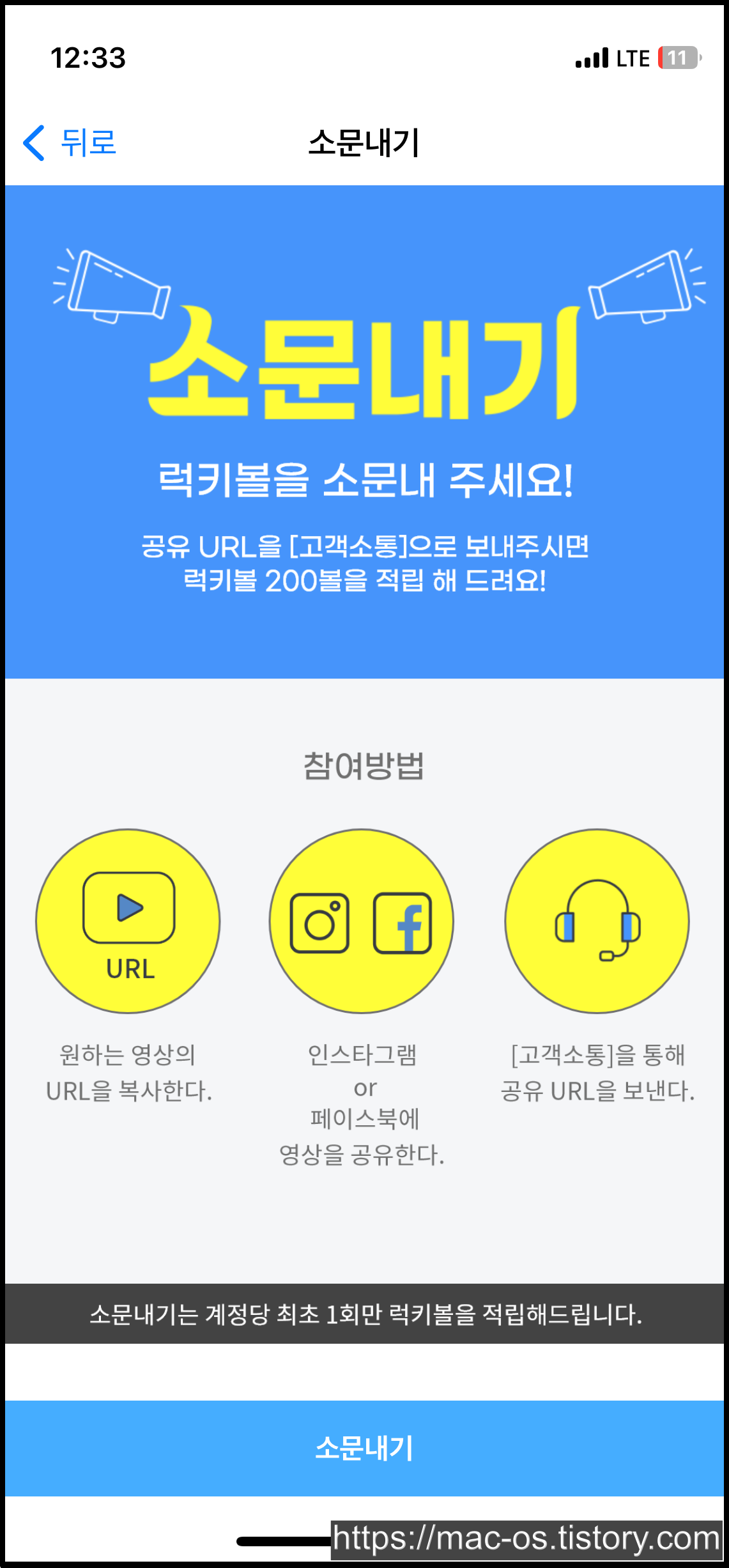 원하는 영상의 URL을 복사하고 인스타그램이나 페이스북에 공유하고 고객소통에서 공유 URL를 보내면 200볼을 주는 소문내기도 있구요.