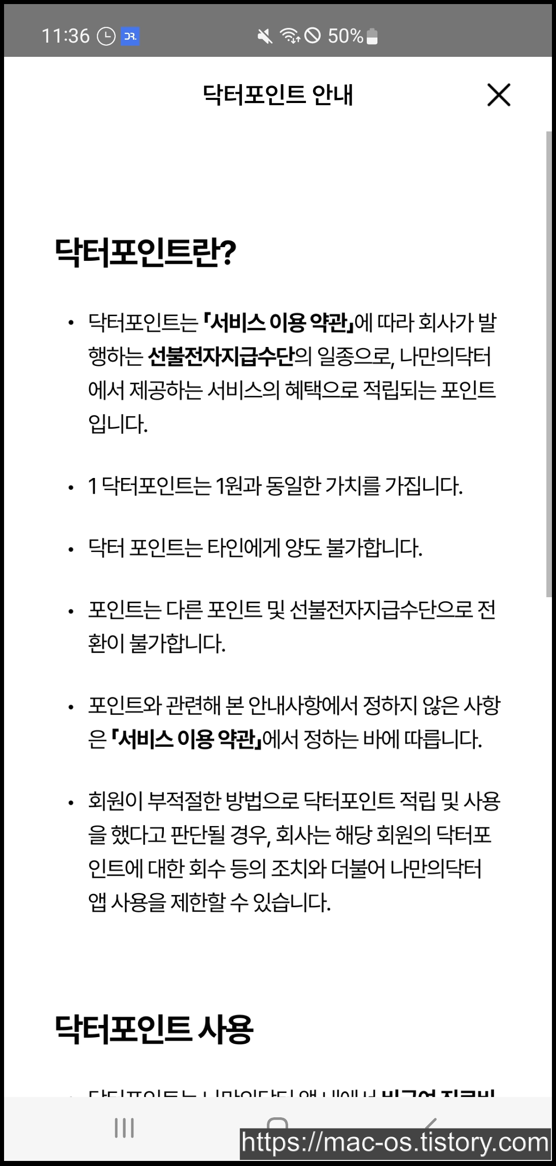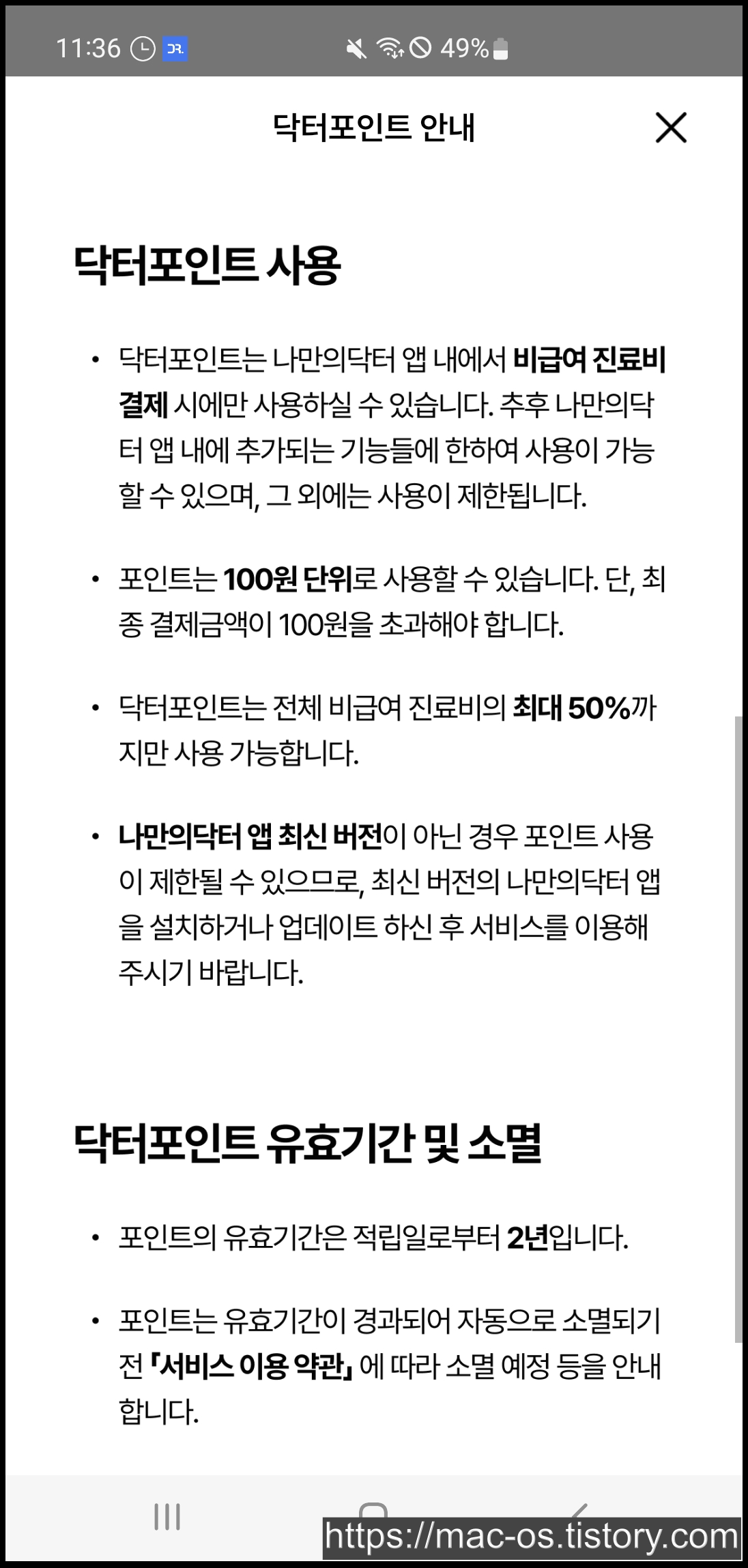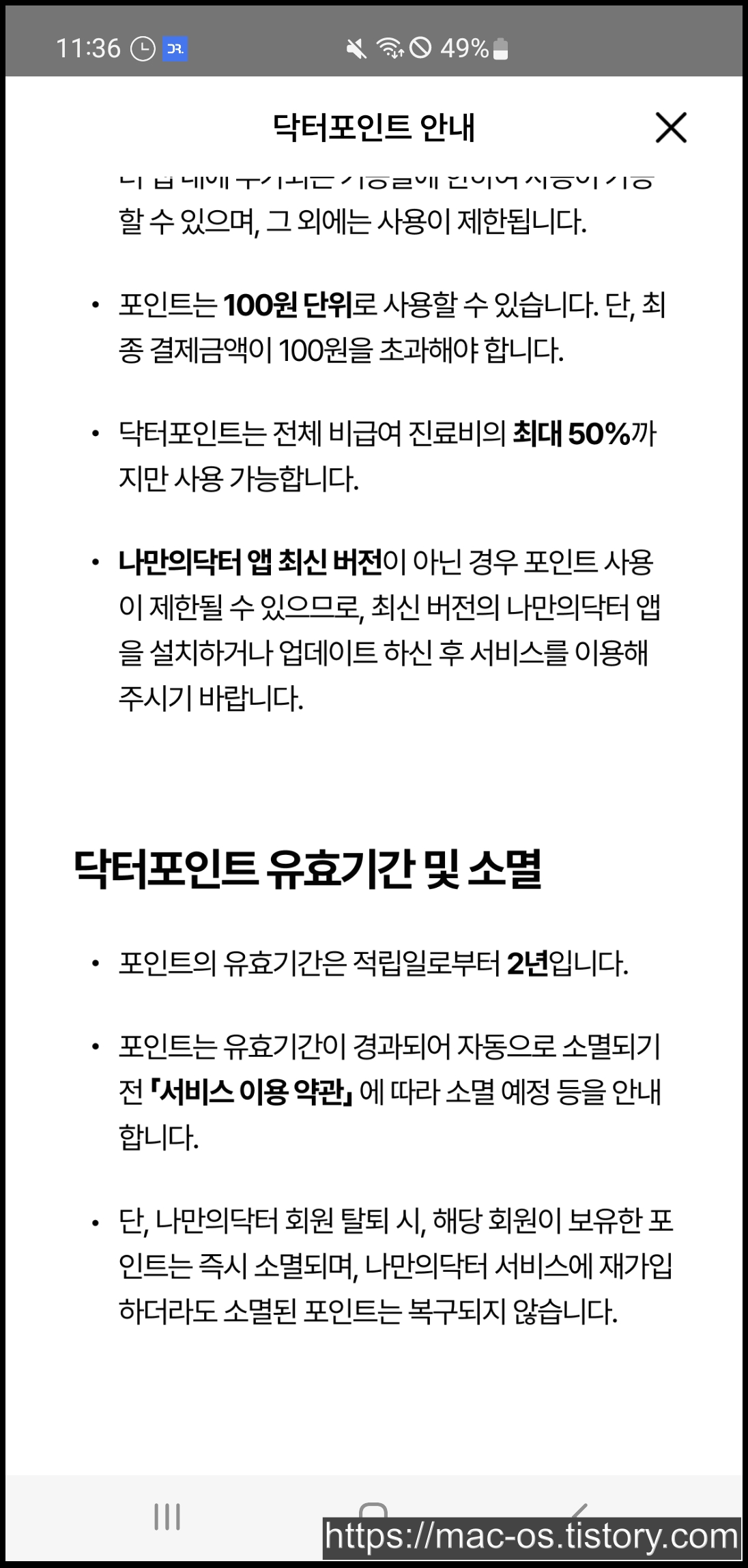 닥터포인트는 나만의닥터 앱 내에서 비급여 진료비 결제 시에만 사용이 가능하지만, 추후 앱 내에 추가되는 기능들에 한하여 사용이 가능할 수 있습니다.