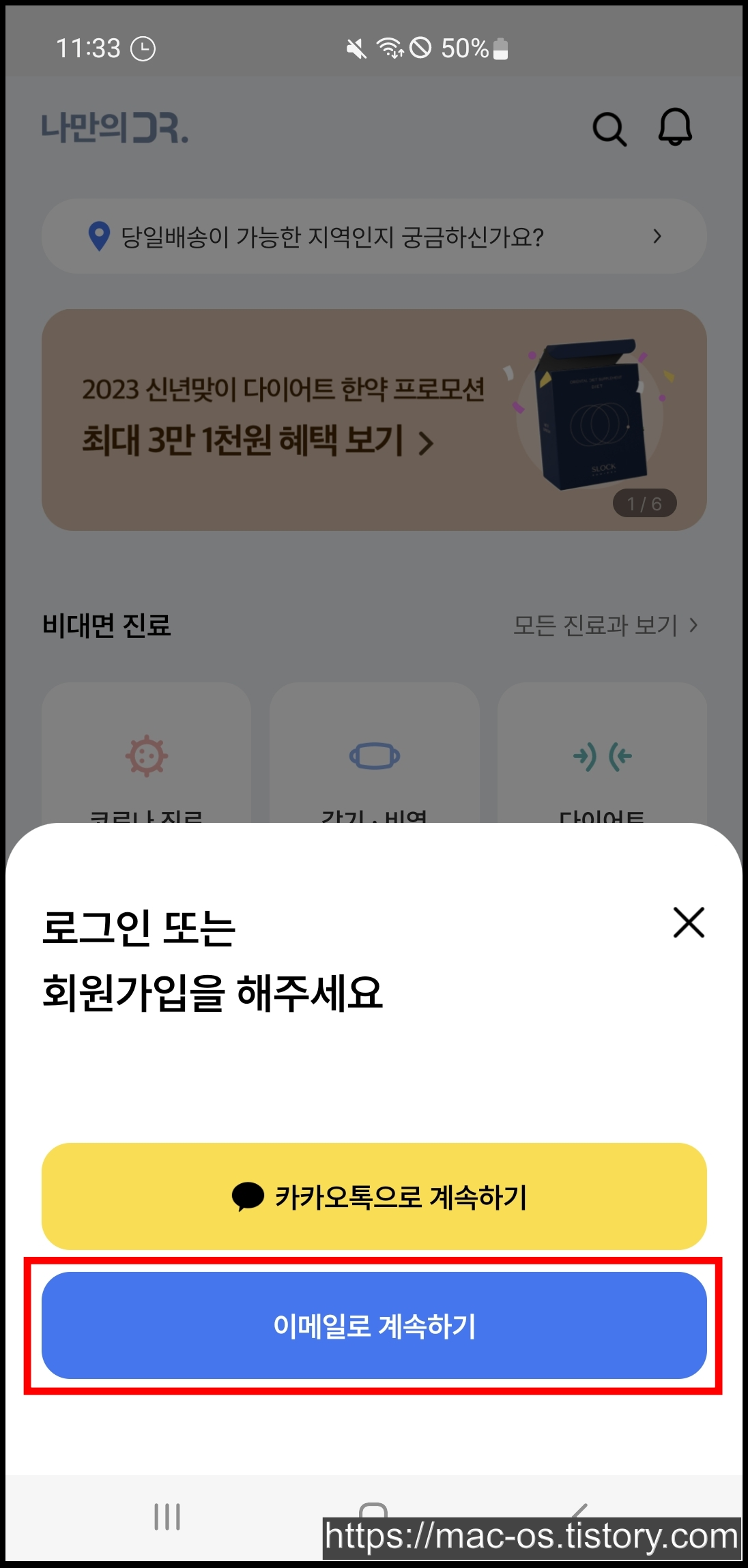 카카오톡 또는 이메일로 계속하기를 눌러 회원가입을 진행합니다.