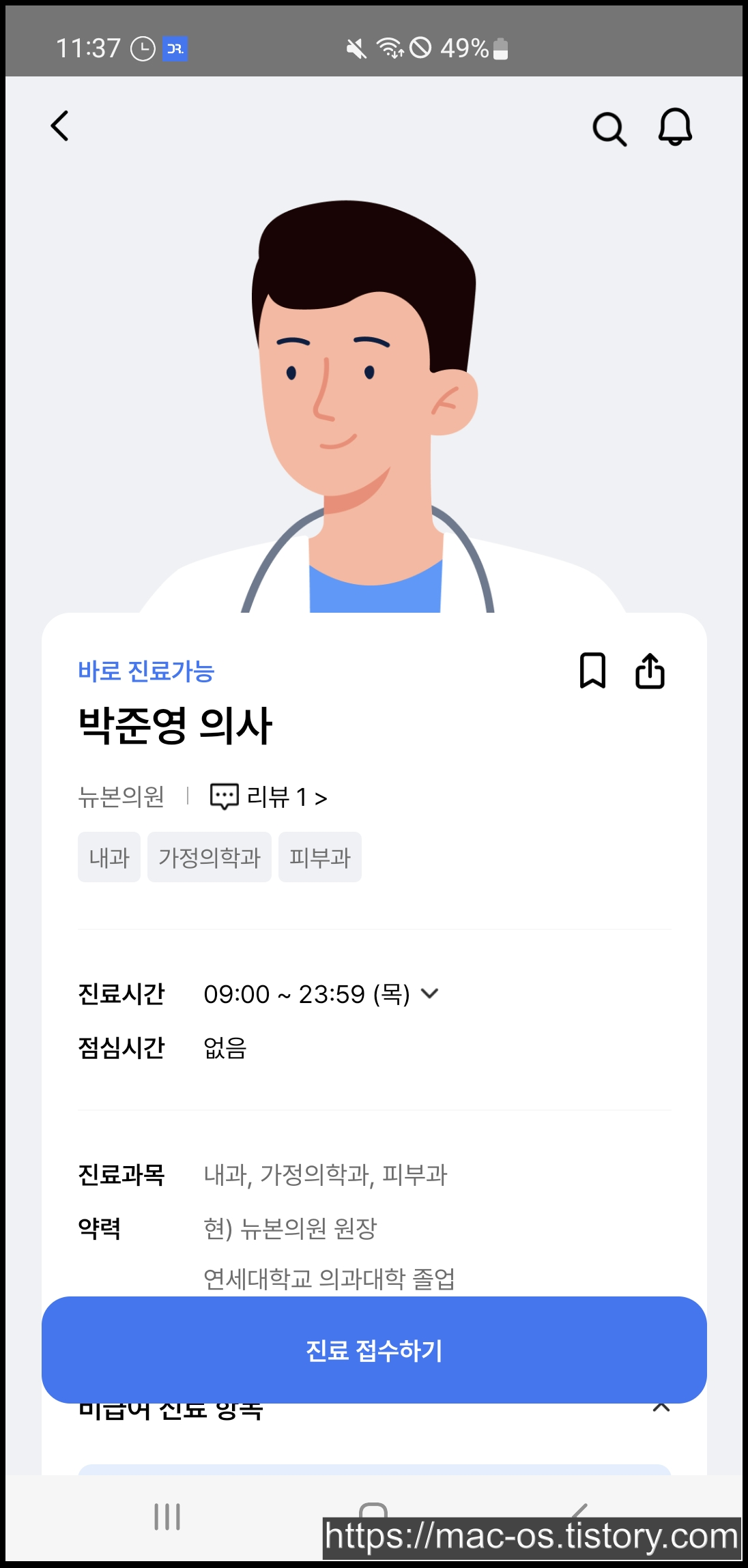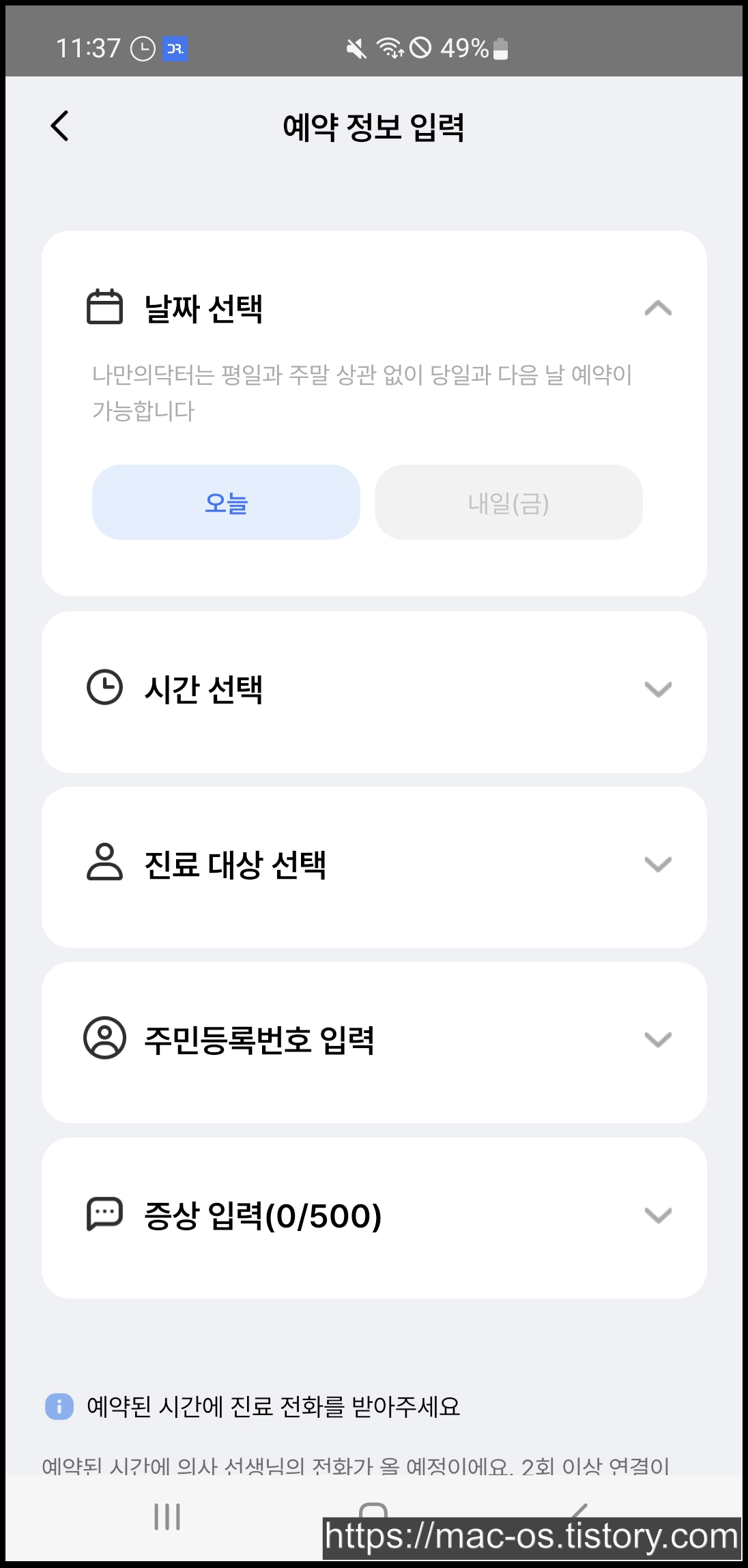 의사를 선택한 다음 하단의 [진료 접수하기] 버튼을 누르면 예약 정보 입력 페이지로 이동하게 됩니다.