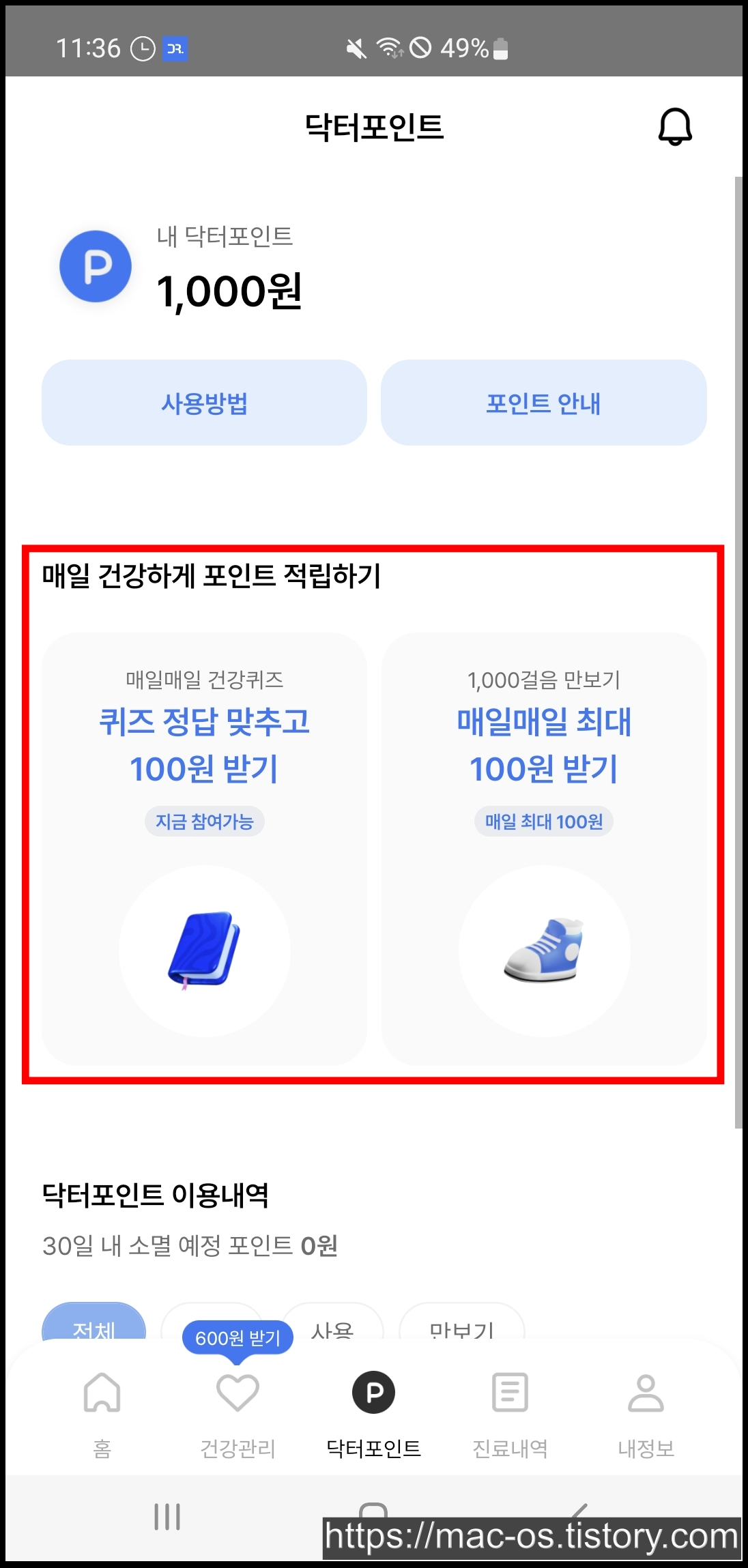 나만의닥터 닥터포인트 탭에서 매일 퀴즈 정답을 맞추거나 만보기를 통해 포인트를 적립받을 수 있습니다.