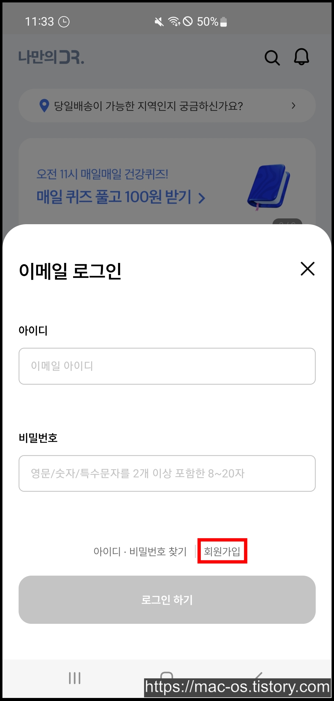 회원가입은 카카오 계정 로그인 또는 이메일 계정 가입으로 진행되는데, 가입 후 [내정보] > [친구초대]에서 초대코드를 입력하면 1,000포인트를 받으실 수 있으니 참고하세요. (가입 후 24시간 이내 입력해야 포인트 지급
