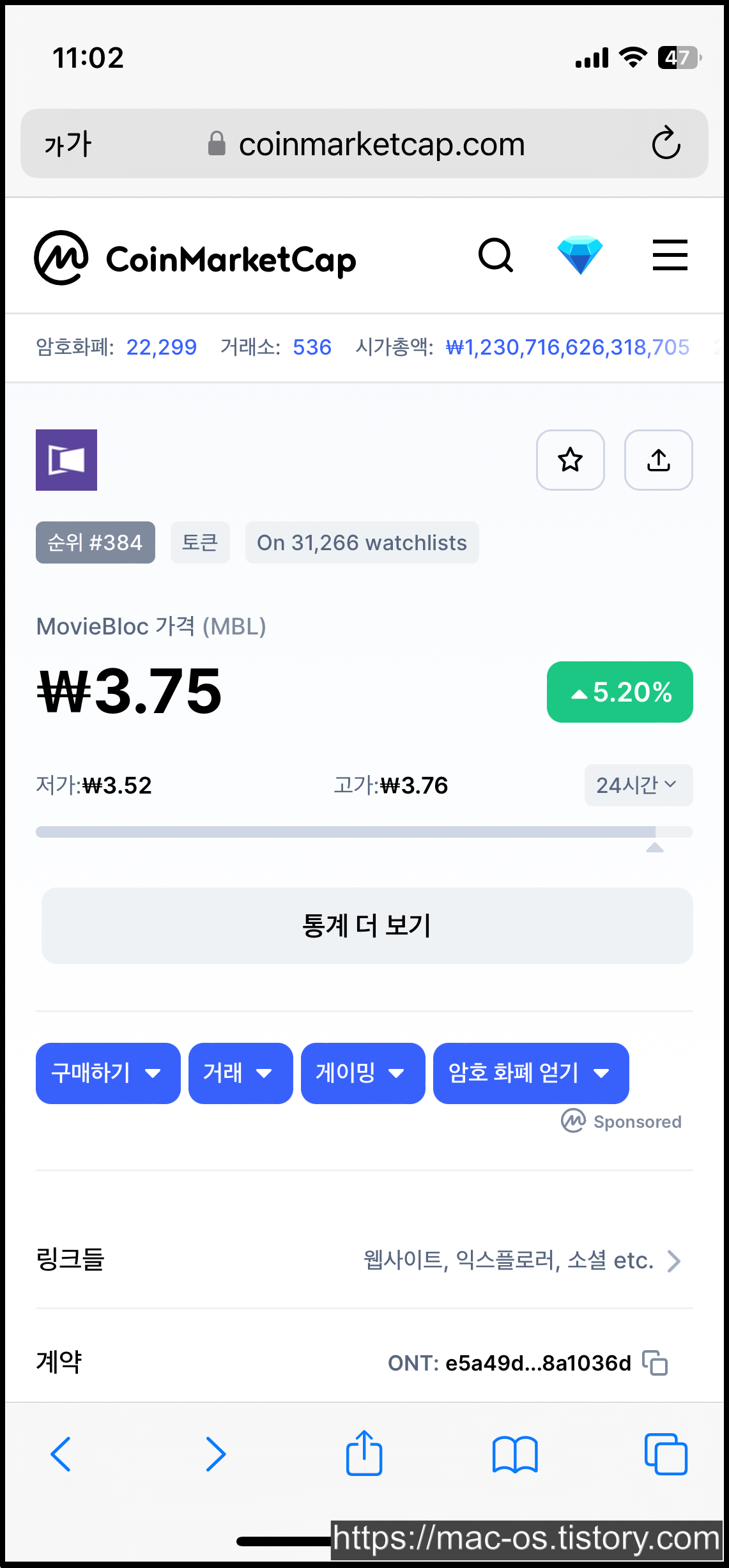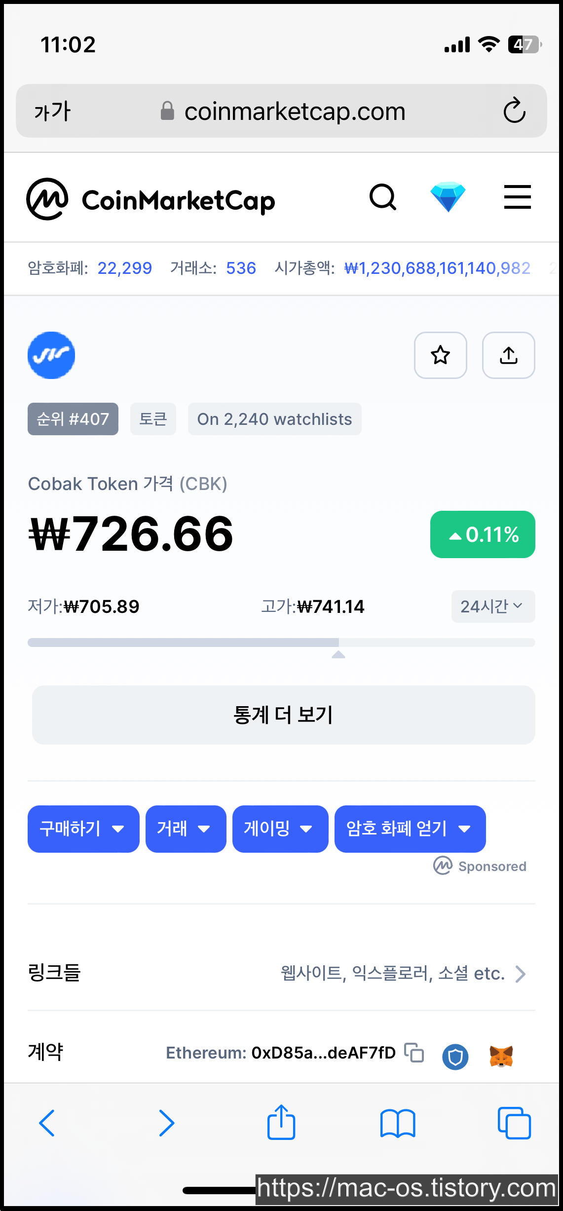 코인마켓캡에 MBL과 CBK에 대해 검색해봤습니다. MBL과 CBK는 각각 3.75원, 726.66원 정도 하네요. MBL은 26원까지 오른 적이 있고, CBK는 11,800원까지 오른 적이 있네요.