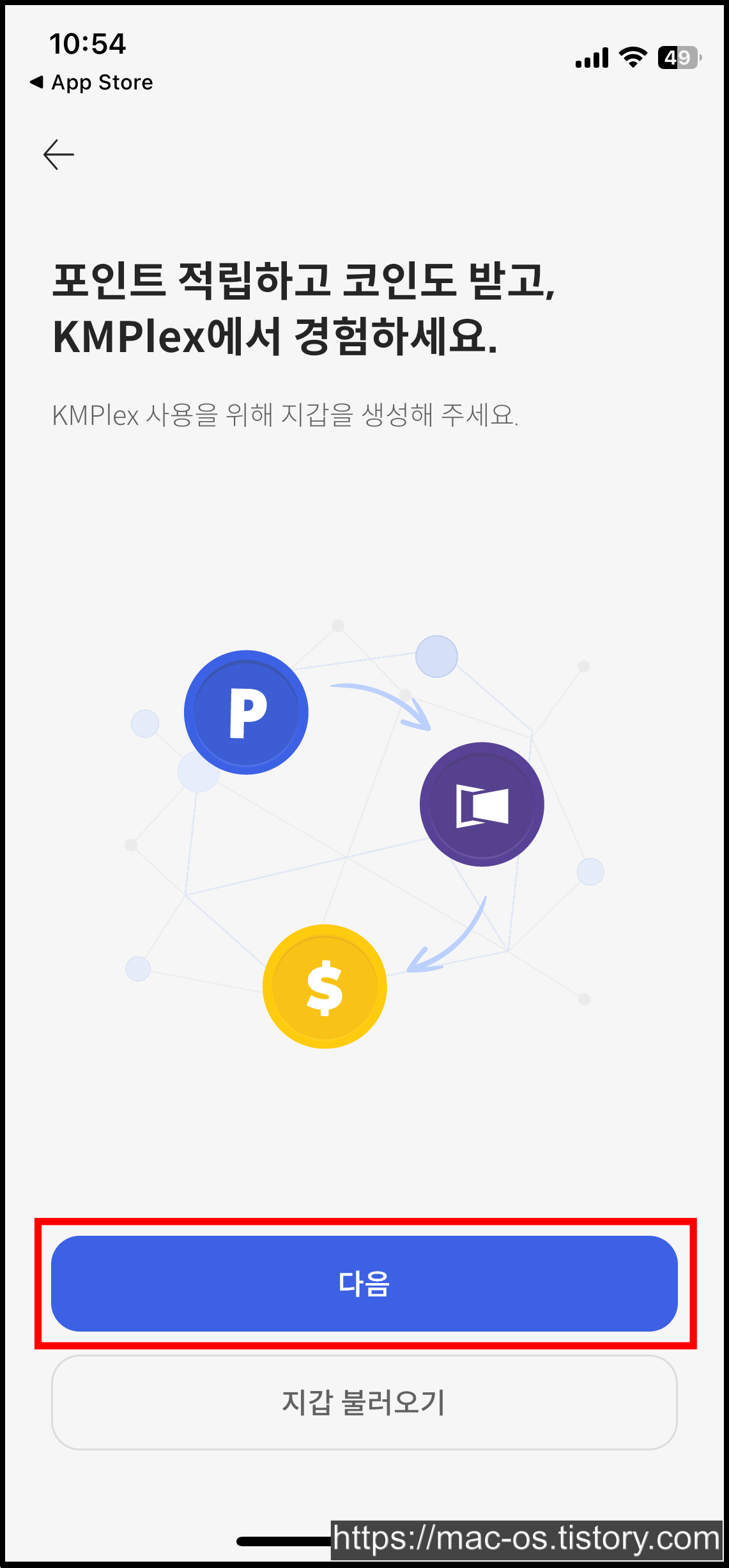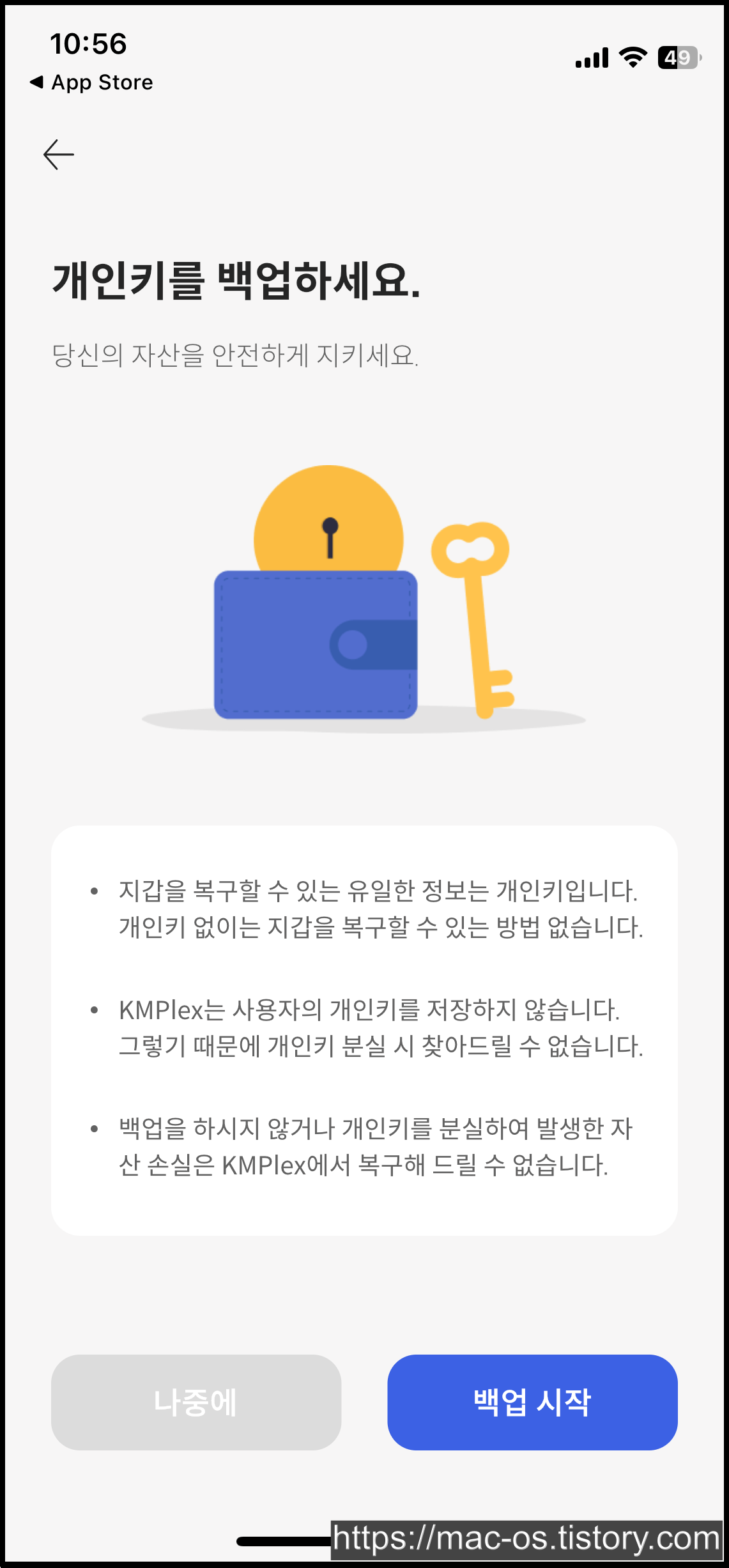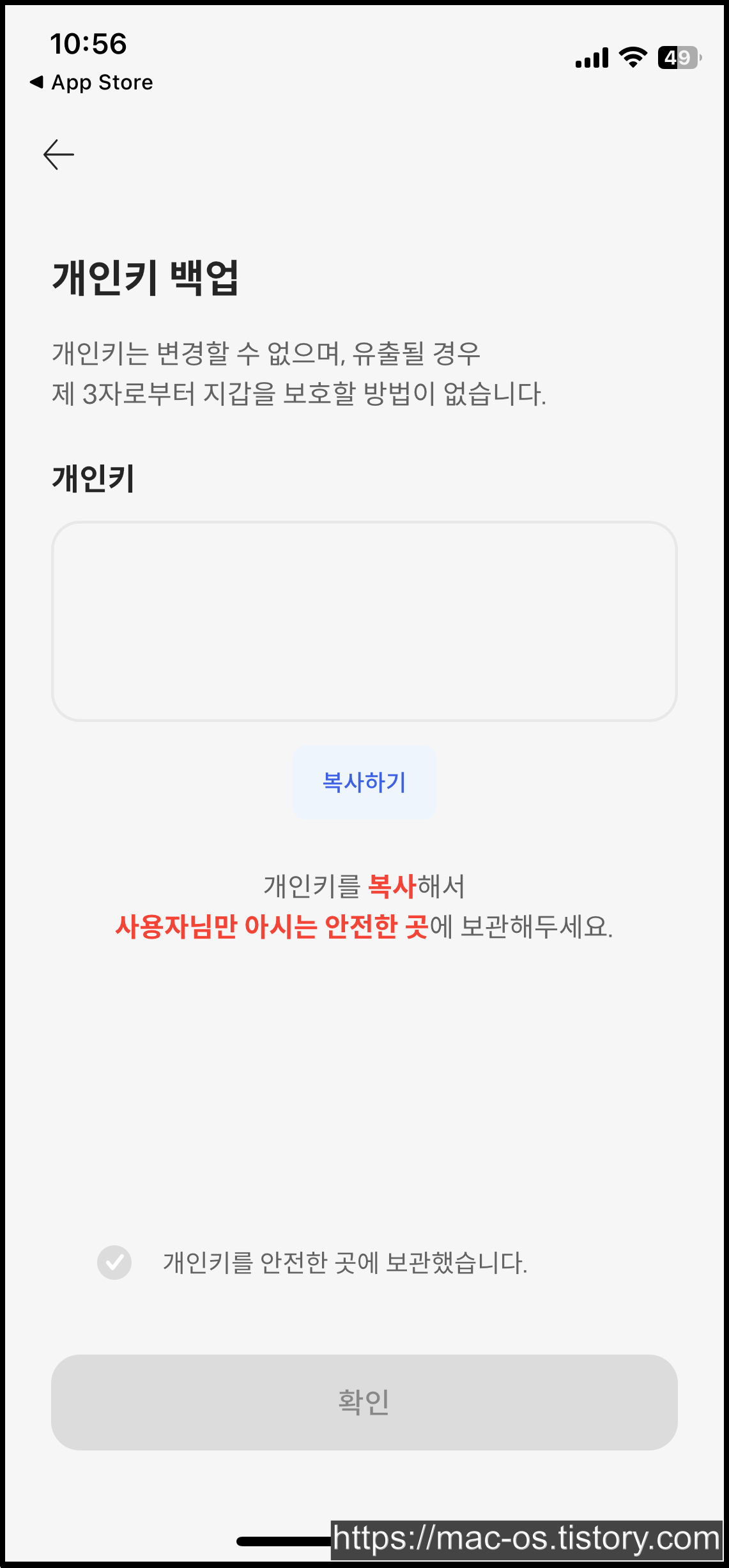 KM플레이어 지갑 생성 후 앱을 삭제했을 때, 이 개인키로 로그인할 수 있는데요. 개인키는 다른 사람이 보지 못하도록 따로 저장해두세요.