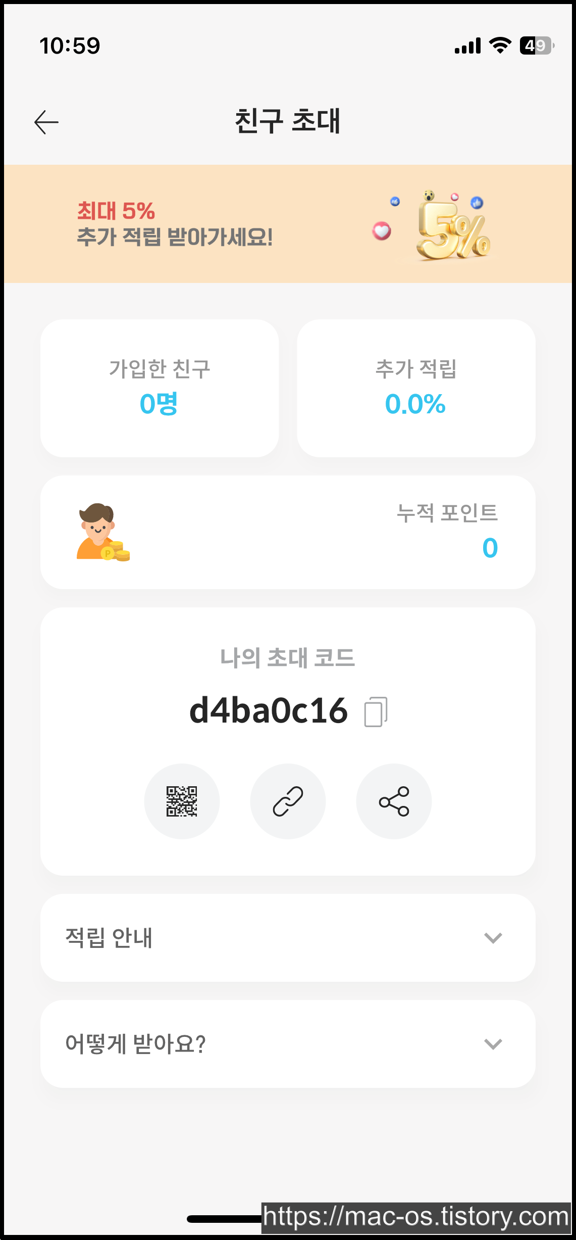 친구를 초대하면 최대 5% 무제한으로 추가 적립을 받을 수 있으며, 첫 초대는 1%의 추가 혜택이 제공됩니다. 한명 초대할 때마다 0.1%씩 추가 혜택도 있구요.