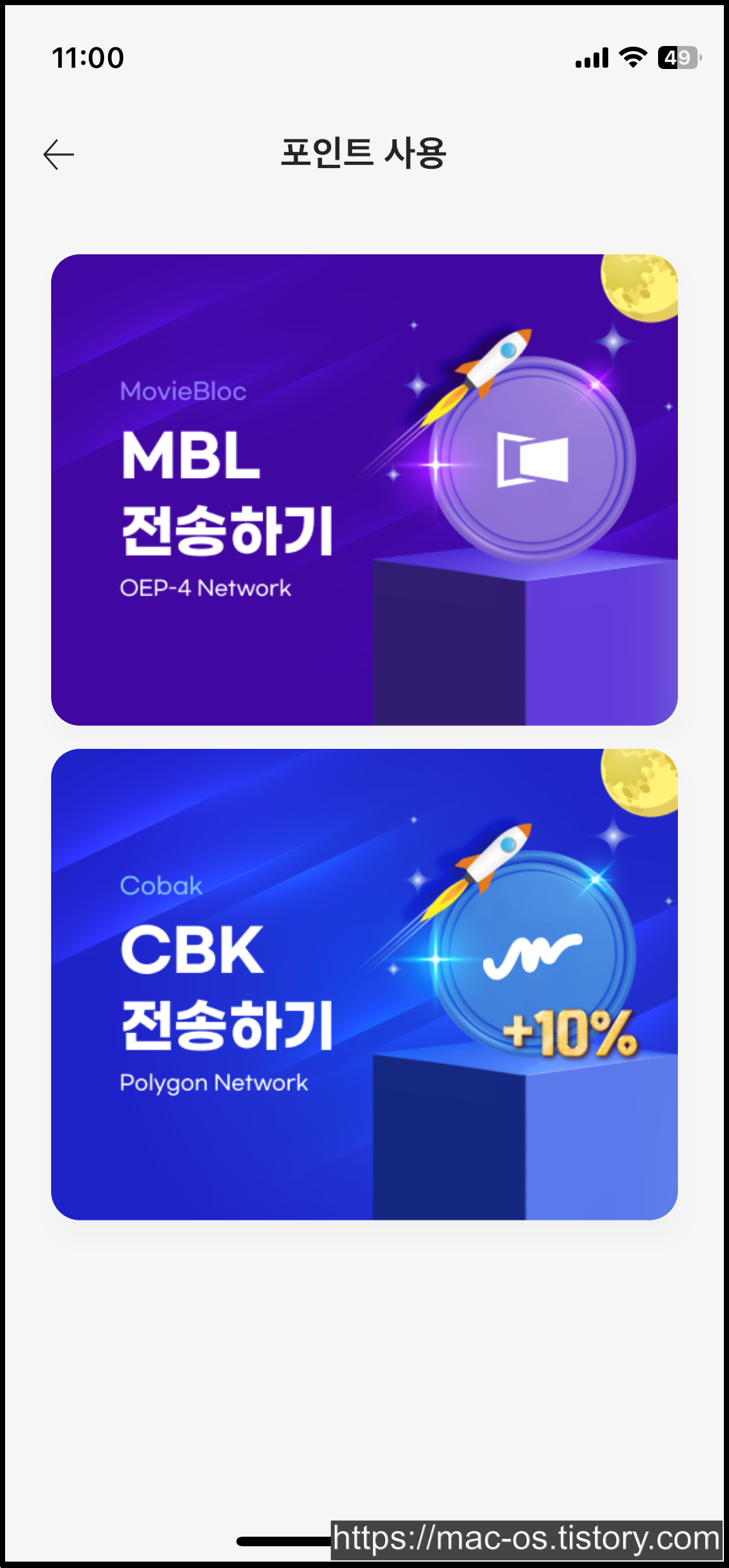 KM플레이어에서 얻은 포인트와 KMP는 MBL과 CBK라는 가상화폐로 교환하여 사용하실 수 있습니다. MBL(무비블록)기준 교환비율은 1,000P = 2.6MBL 정도라고 하네요.