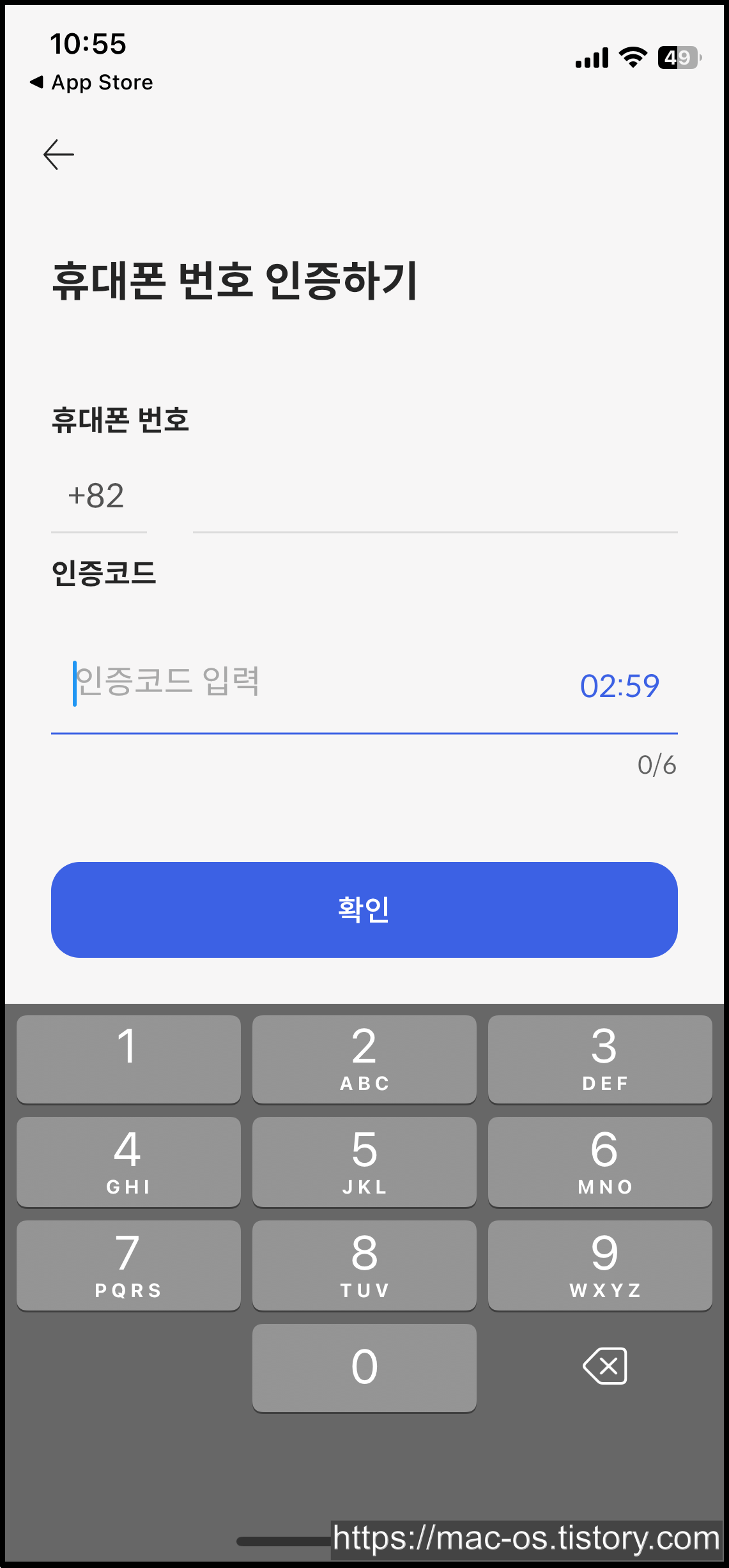 인증코드 6자리를 입력하면 휴대폰 번호 인증이 완료됩니다.