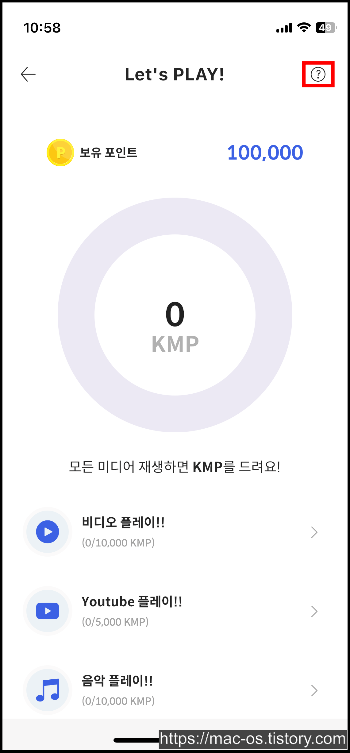 KM플레이어에는 포인트가 2가지로 나뉩니다. 우선 위에서 소개드린 '포인트'와 'KMP'라는 것이 있는데요. KMP는 휴대폰에 있는 비디오와 음악을 듣거나, 유튜브에서 영상을 시청하면 얻을 수 있는 포인트입니다.