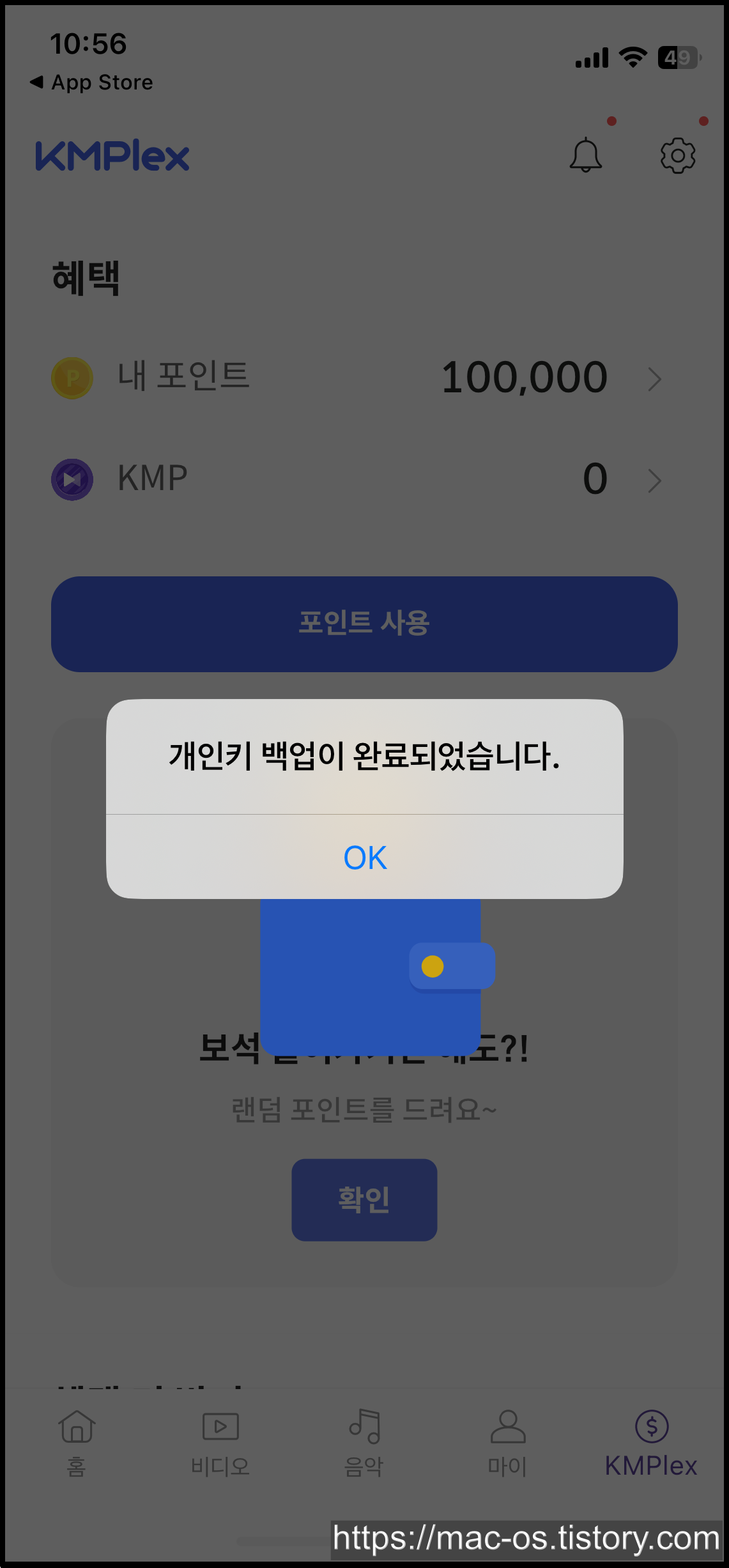 개인키 백업을 마치면 10만 포인트가 지급됩니다.