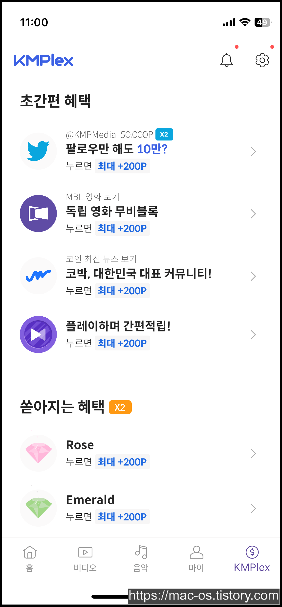 [KM Plex]에서 아래로 화면을 내려보면 초간편 혜택과 쏟아지는 혜택이라는 것이 있는데요. 초간편 혜택에서는 트위터 팔로우, 영상 시청, 뉴스 보기 등을 통해 포인트를 얻을 수 있으며, 쏟아지는 혜택에서는 클릭만 해도 포인트를 받으실 수 있습니다.