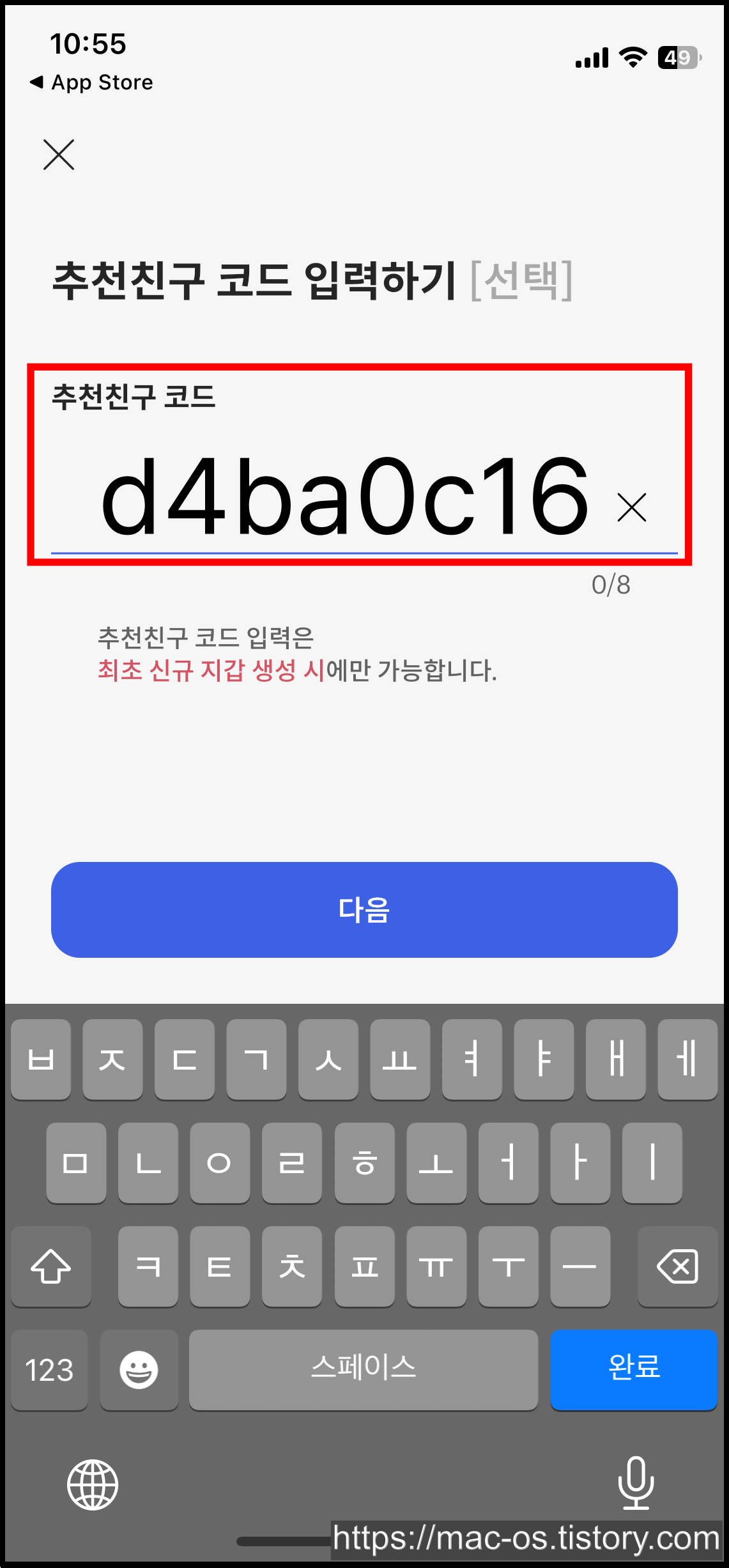 휴대폰 번호 인증 후 추천친구 코드를 입력할 수 있는데요. 여기서 d4ba0c16를 복사해서 붙여넣기해주세요. 그리고 PIN 6자리를 설정해줍니다.