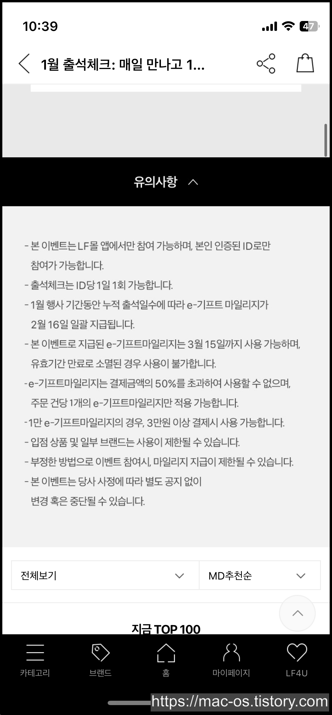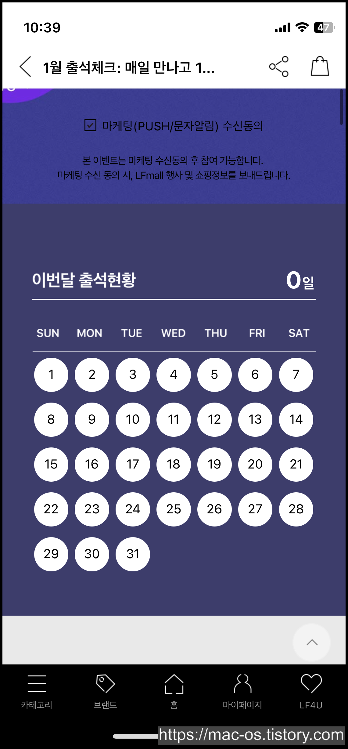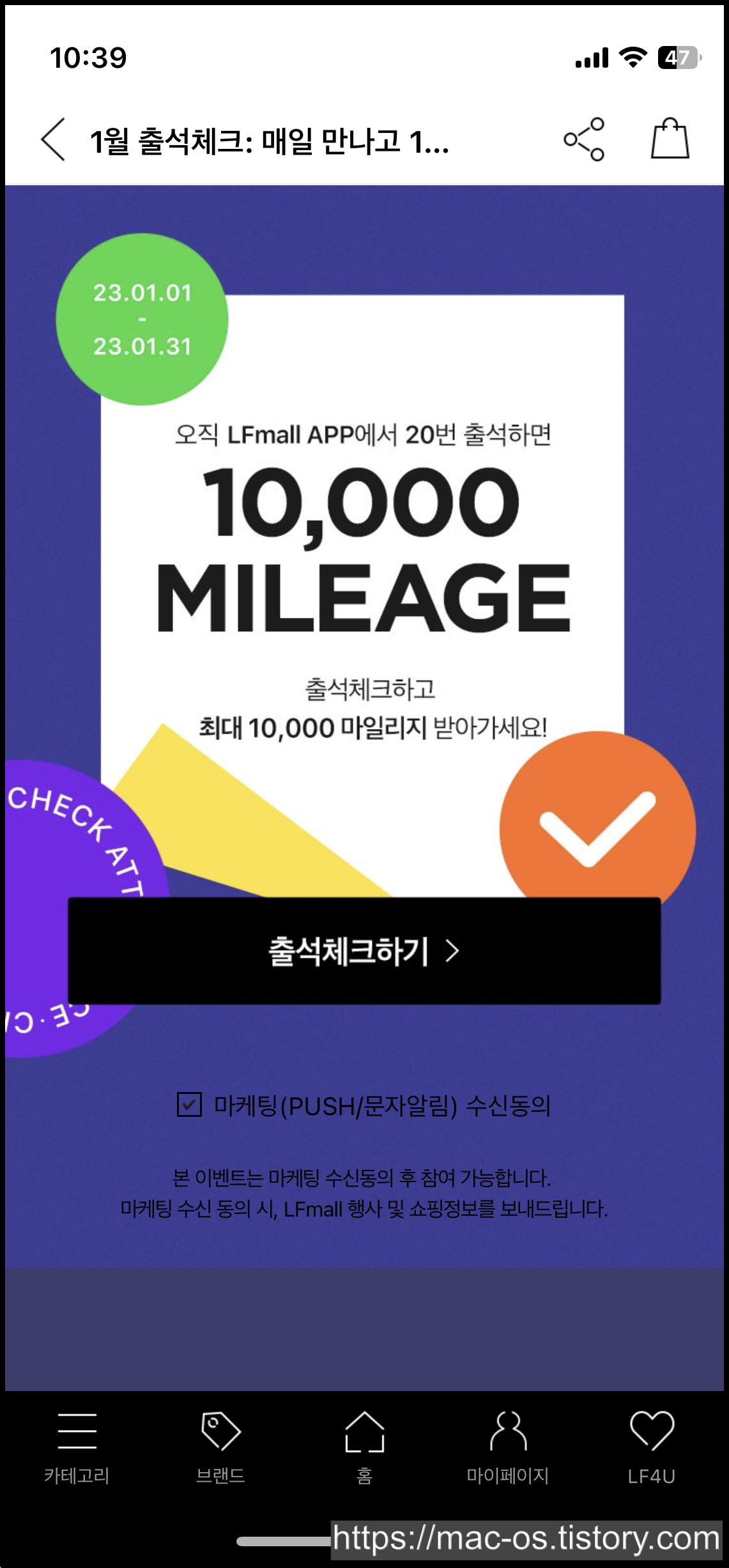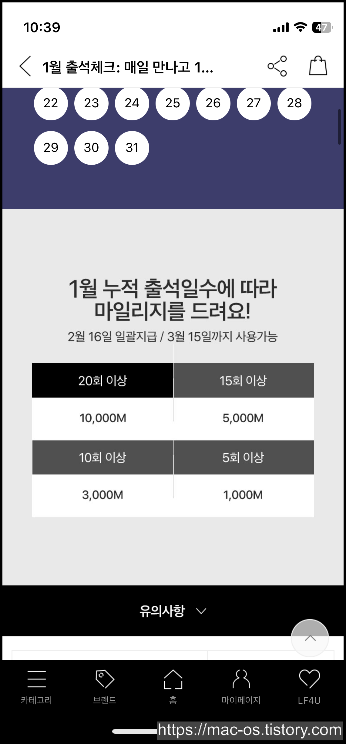 - LF몰 앱에서 매일 출석체크가 가능한데, 달마다 누적 출석일수에 따라 마일리지가 지급됨. 20회 이상 출석 시 1만 마일리지 지급