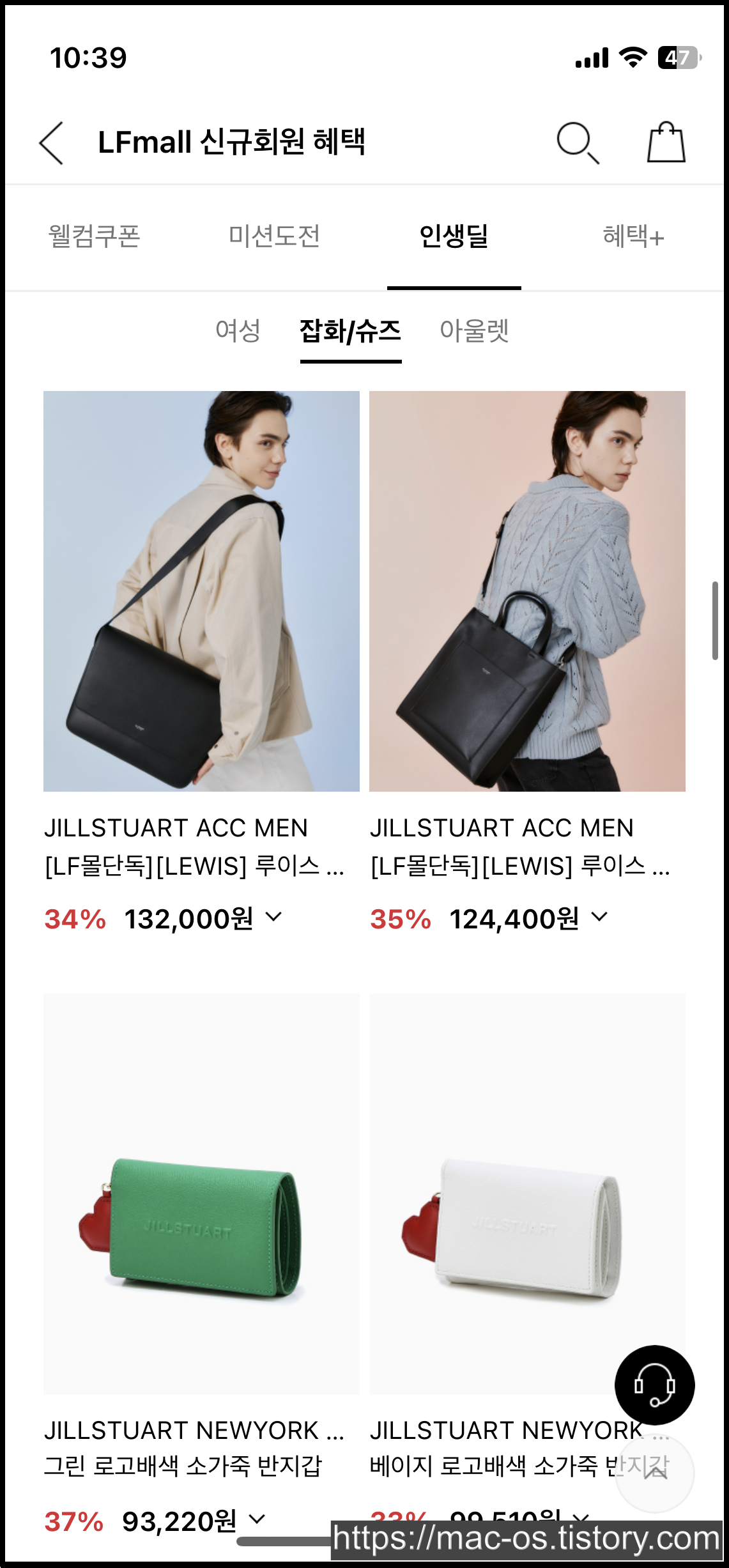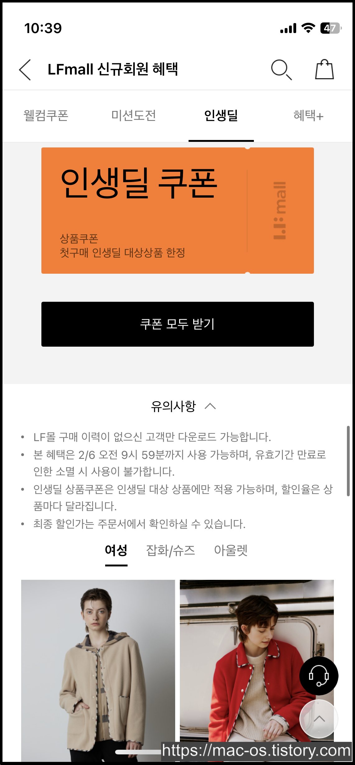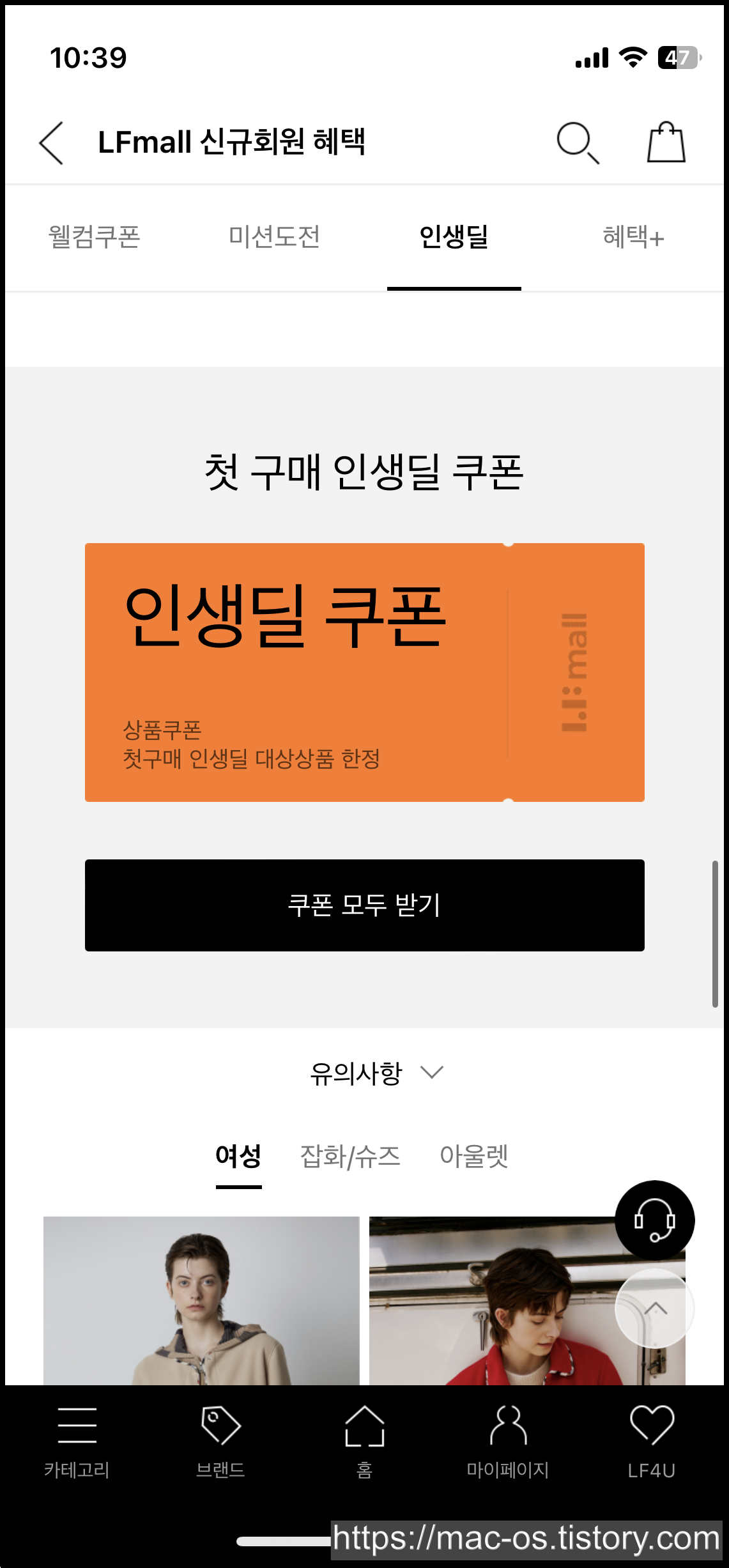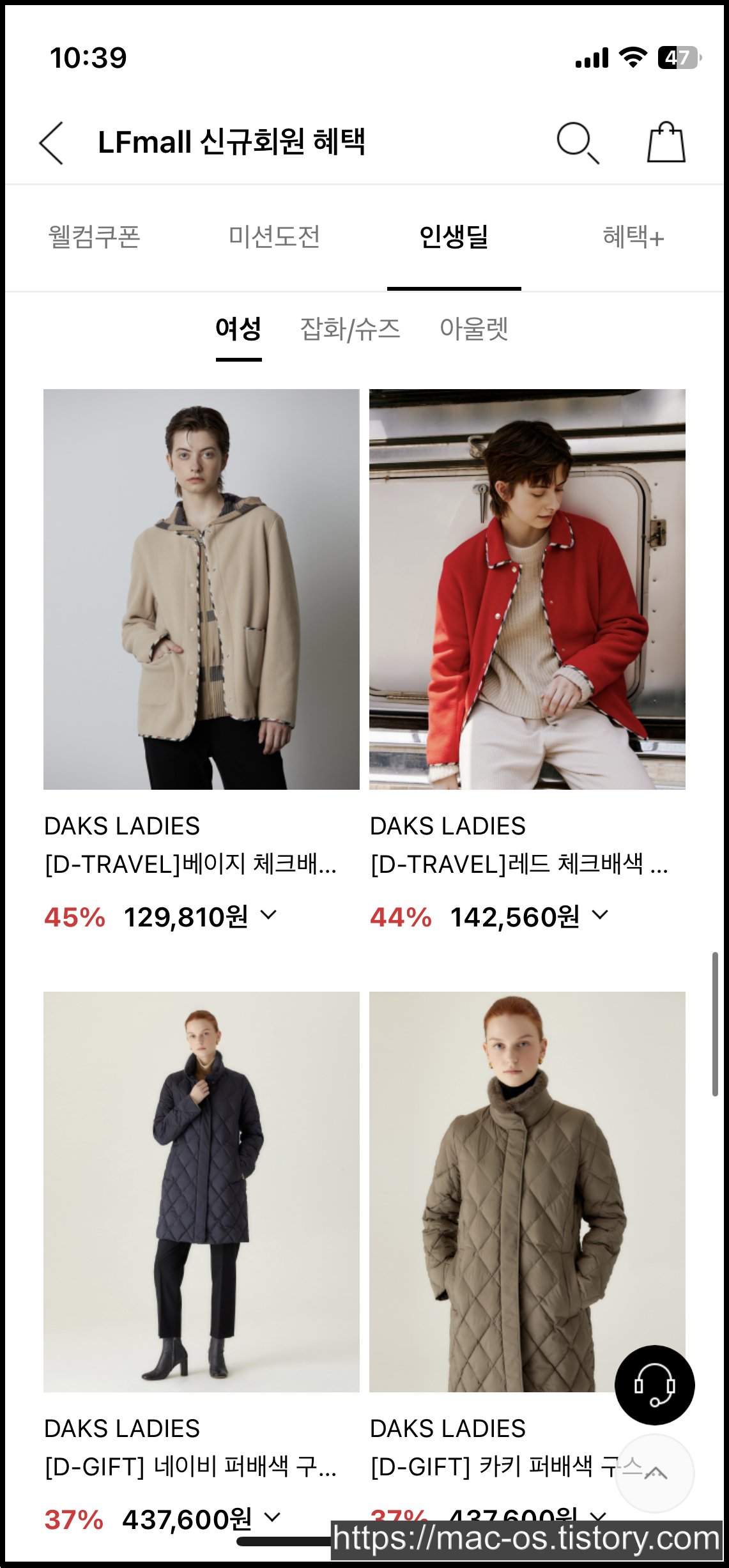 - 첫구매 인생딜 쿠폰 발급, 해당 쿠폰으로 인생딜 여성, 잡화/슈즈, 아울렛 카테고리의 상품을 할인된 가격으로 구매할 수 있음