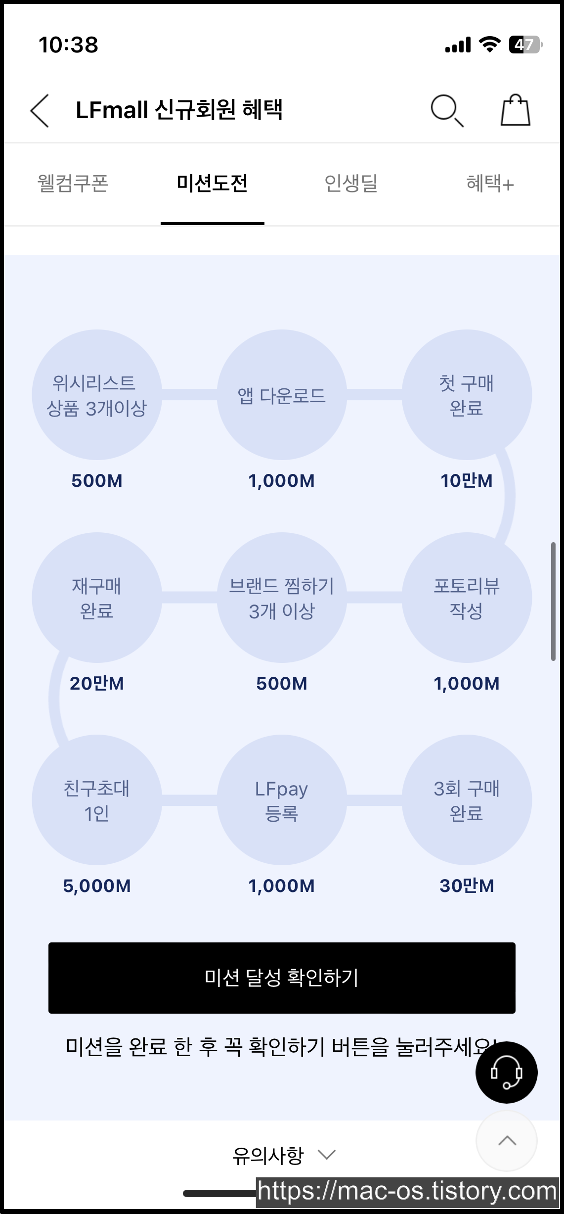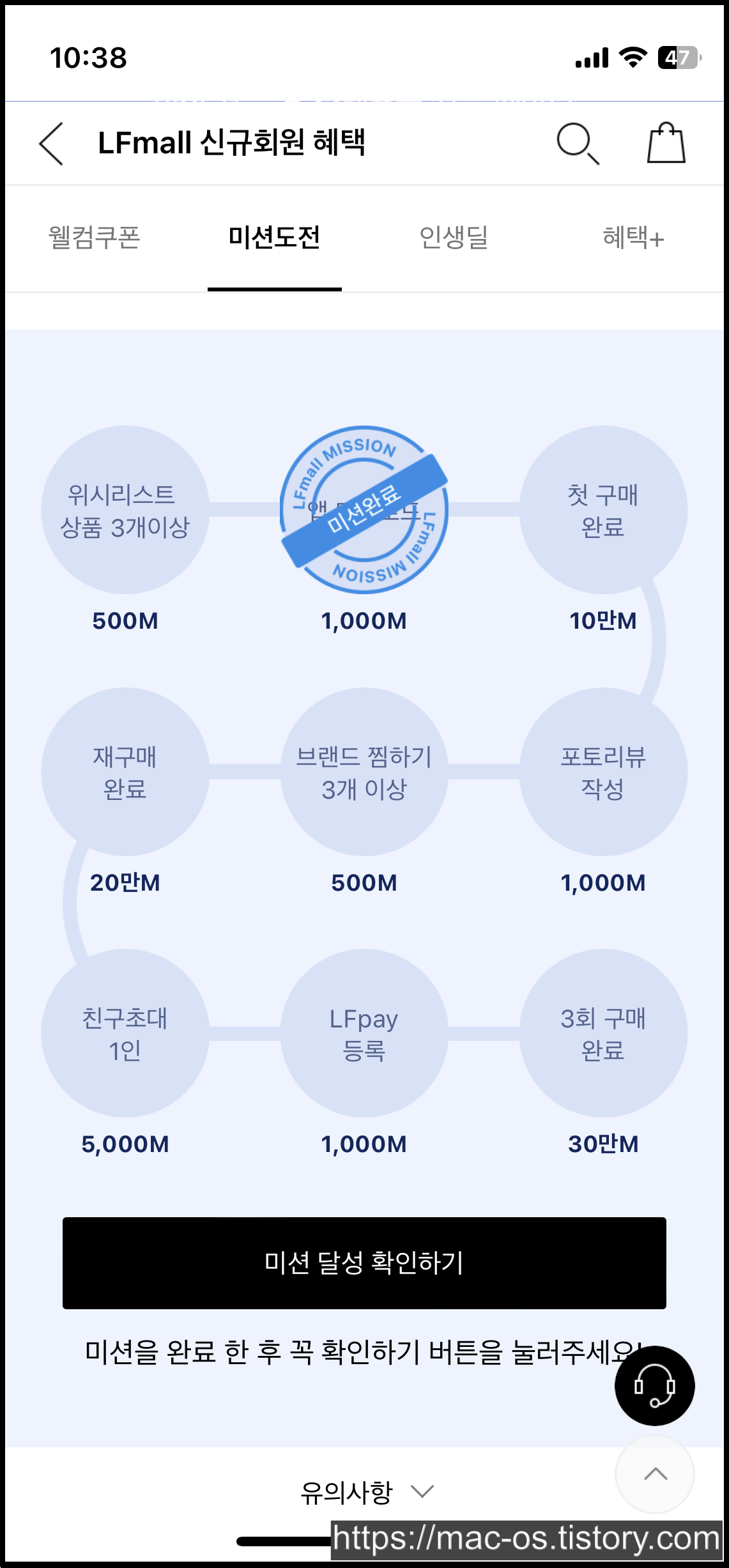 - 이벤트 페이지에서 위시리스트 상품 3개 이상, 앱 다운로드, 첫 구매 등의 미션을 완료하면 최대 60만 마일리지 적립 혜택 제공