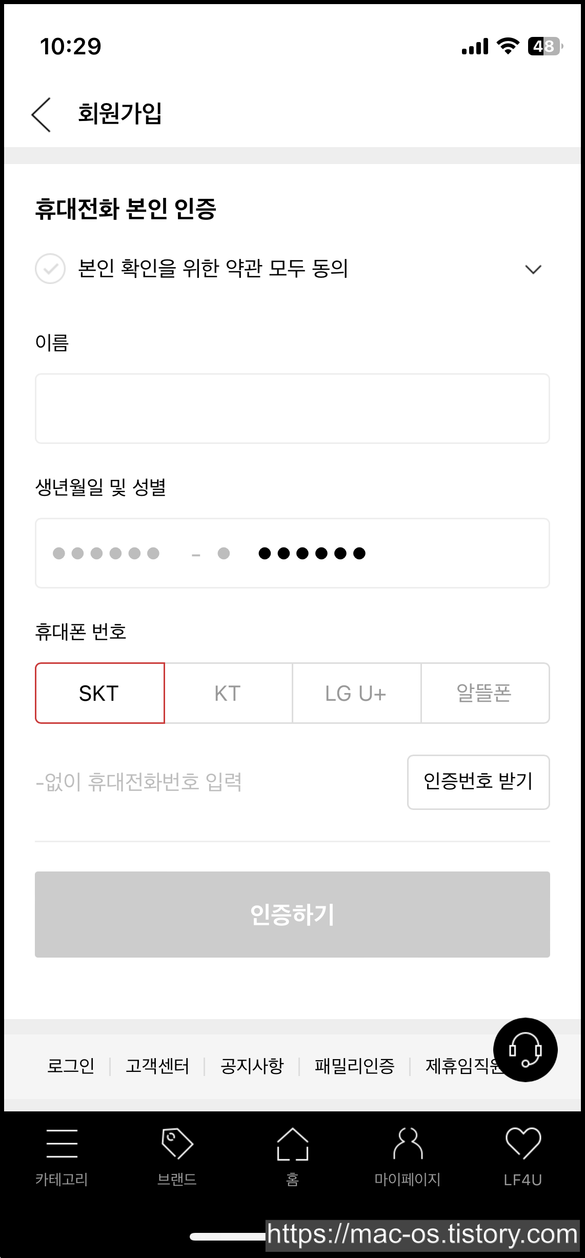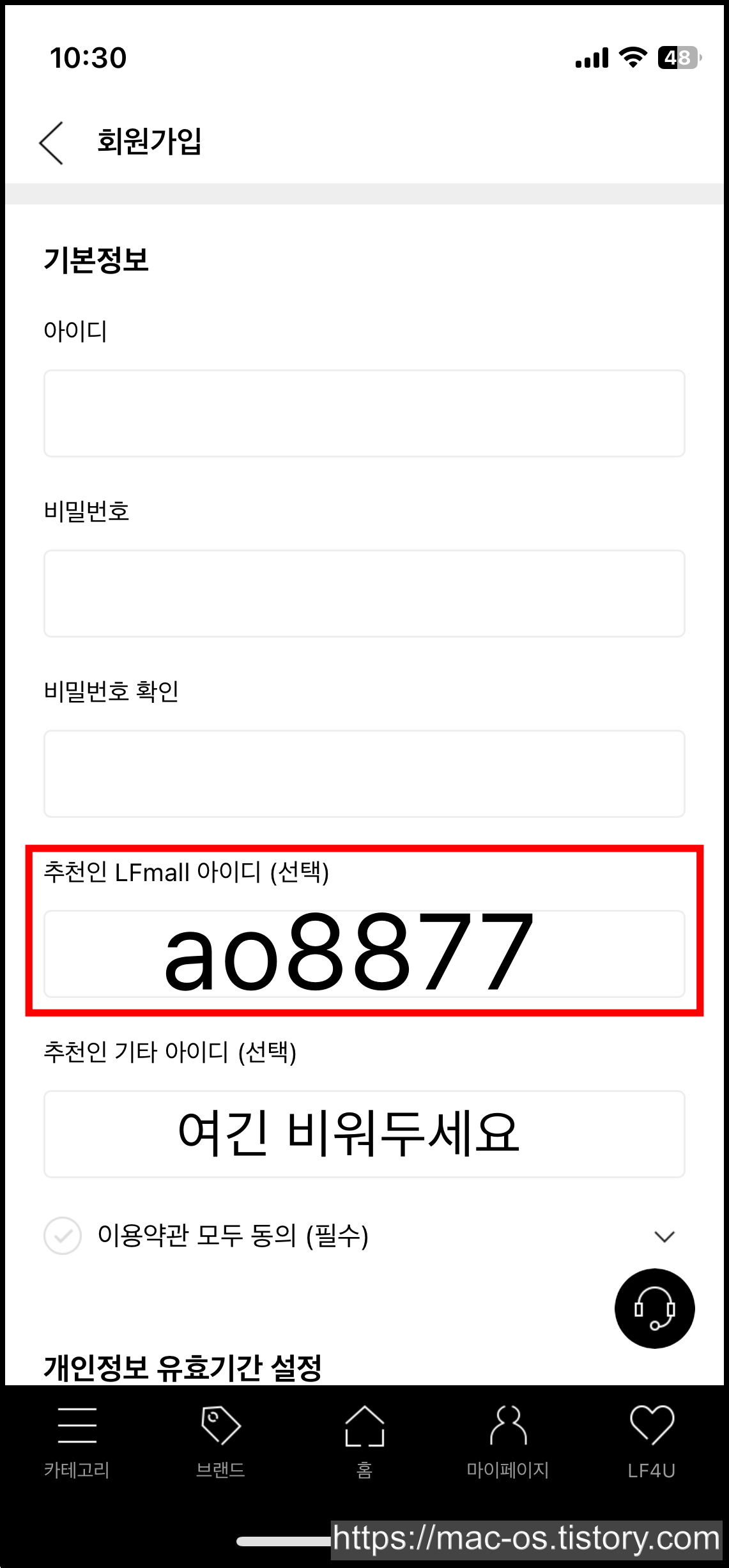 일반 회원가입 페이지에서 휴대전화 본인인증 후 추천인 LF몰 아이디를 입력하실 수 있습니다. 여기에 ao8877을 입력하고 가입하시면 신규회원에게 5,000마일리지가 지급됩니다. 참고로 하단의 추천인 기타 아이디(선택)은 비워두고 가입하셔도 무방합니다.