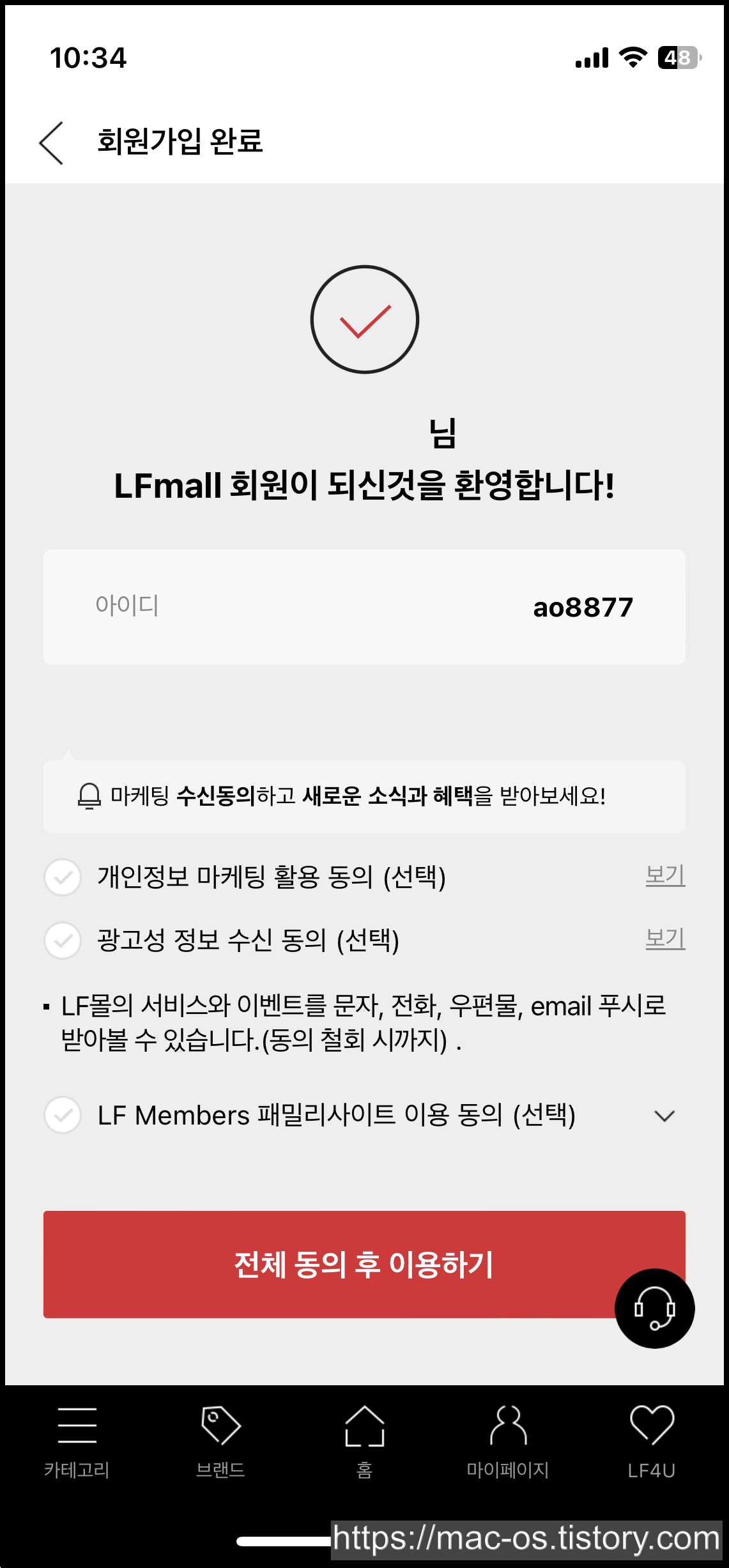 아이디와 비밀번호 등 회원정보 입력을 마치면 LF몰 회원가입이 완료됩니다.