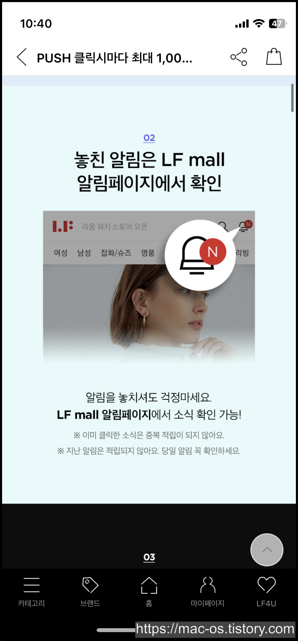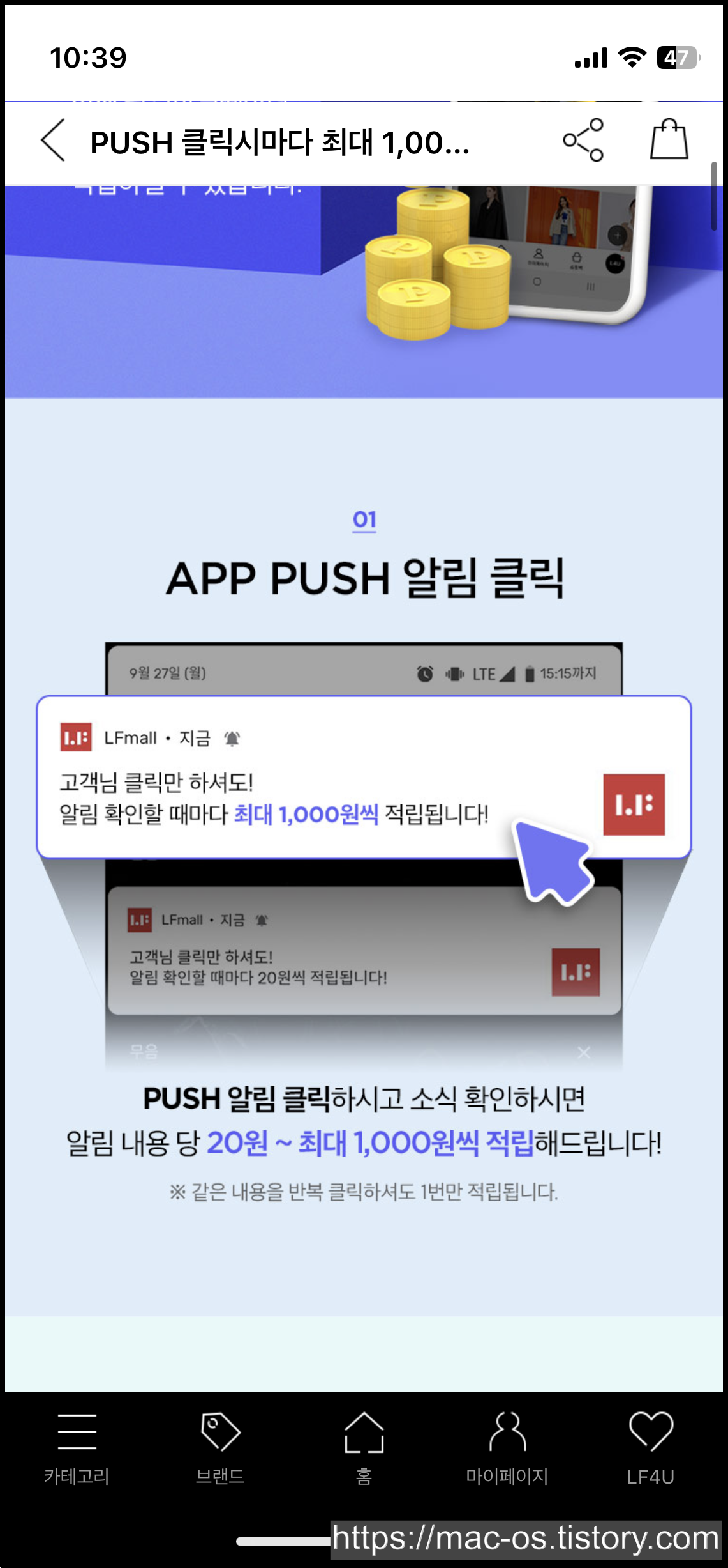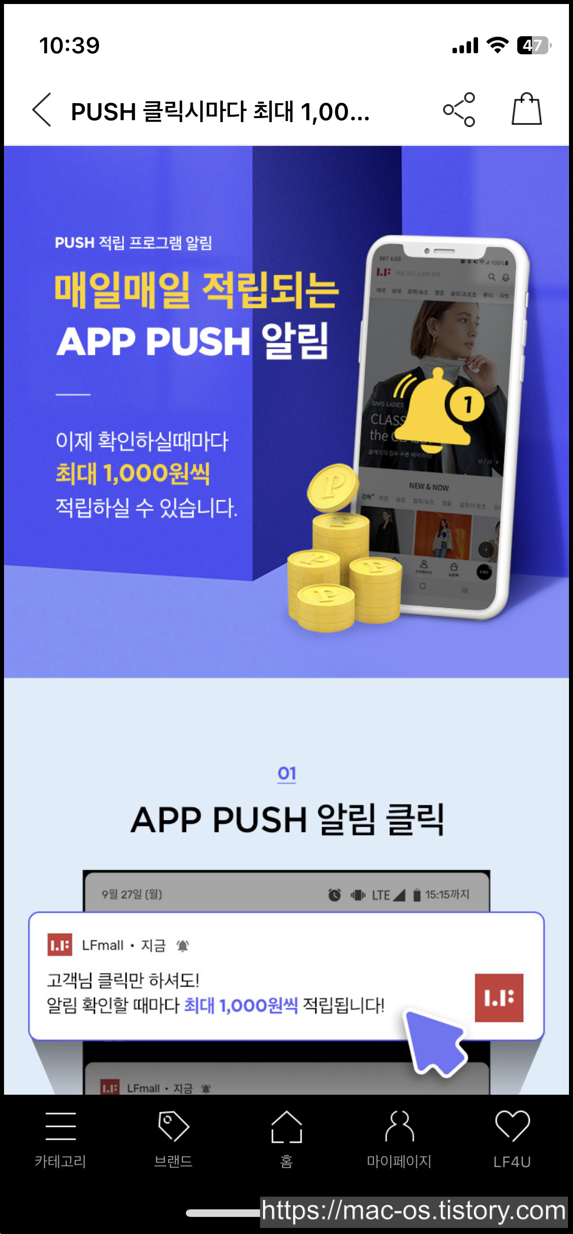 - LF몰 APP푸시로 가끔 휴대폰 상단바에 알림이 오는데, 알림 내용 당 20원 ~ 최대 1,000원씩 적립 가능