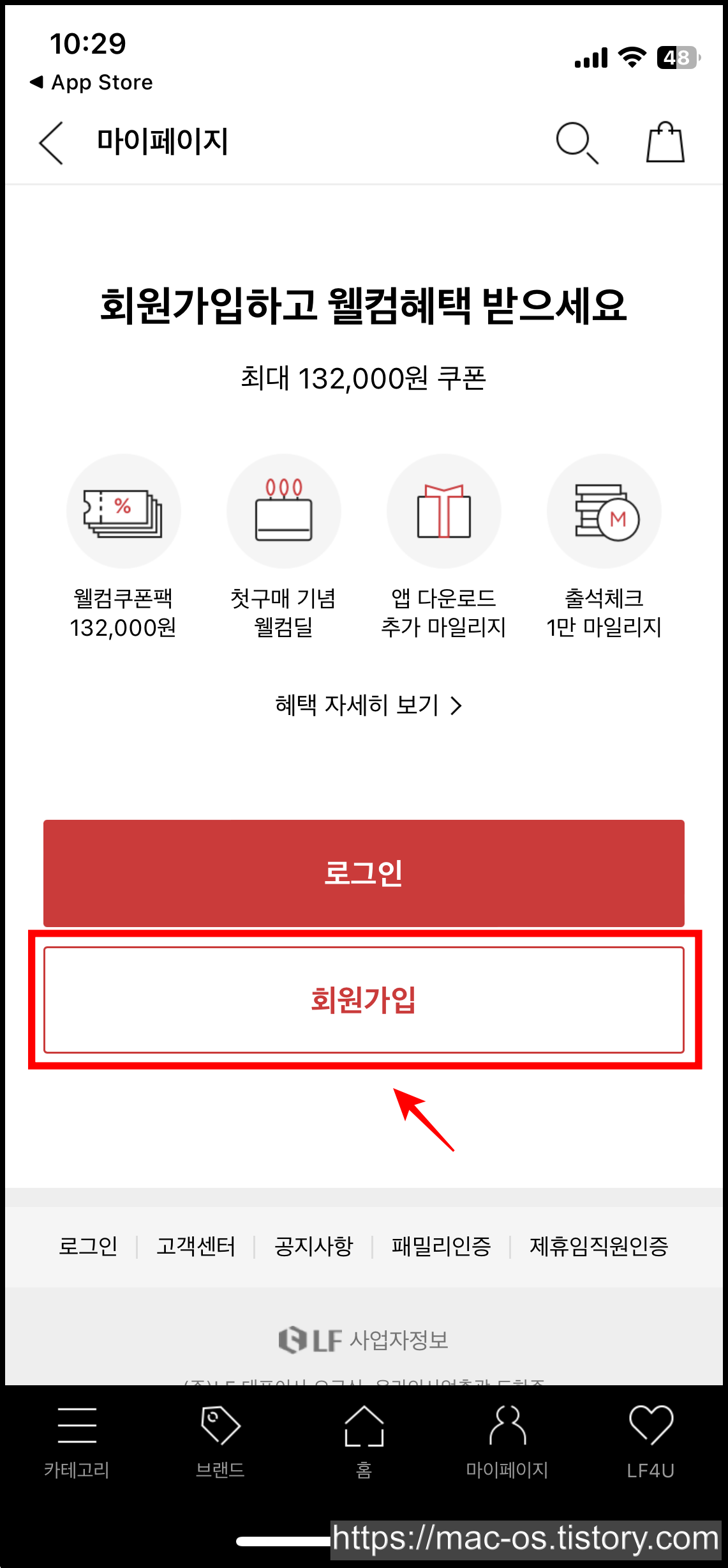 LF몰은 앱스토어 또는 구글 플레이 스토어에서 설치하실 수 있습니다. 앱 설치 이후 [마이페이지]로 이동하여 회원가입을 진행합니다.