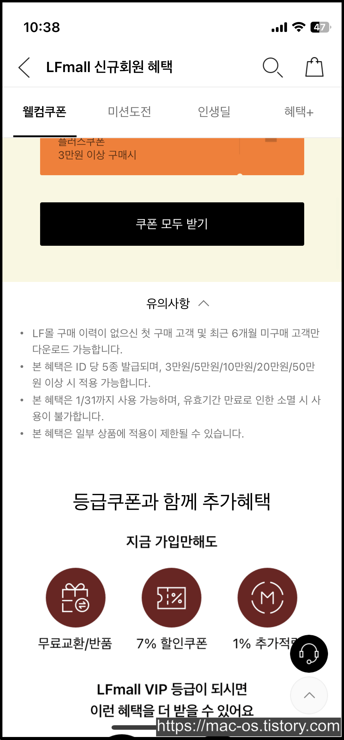 - 지금 가입하면 무료교환/반품, 7% 할인쿠폰, 1% 추가적립 혜택 제공