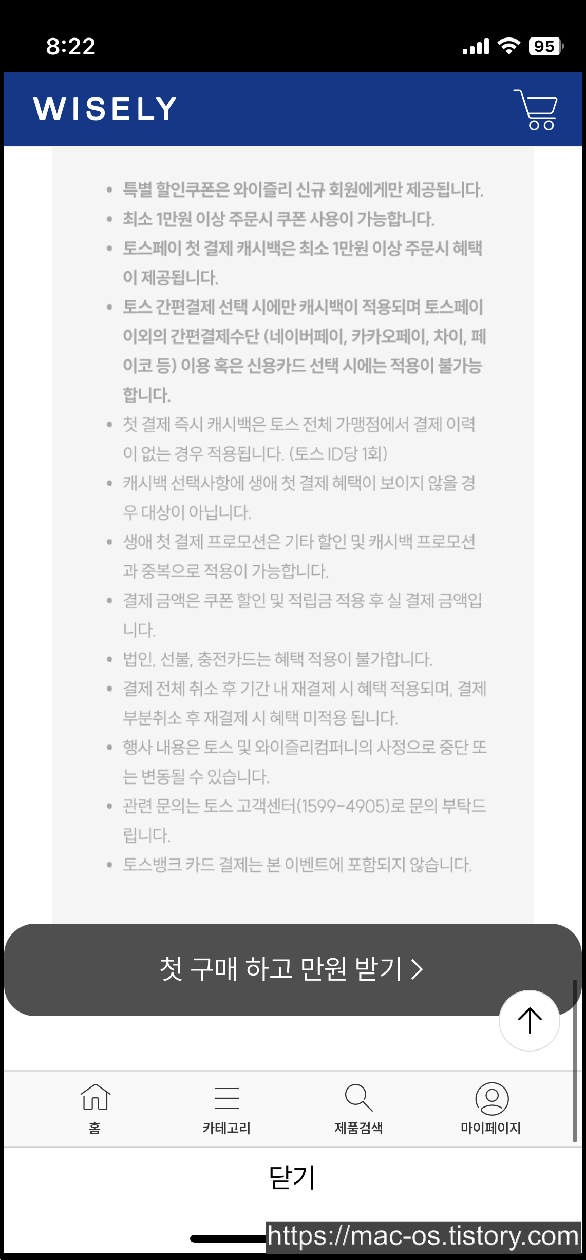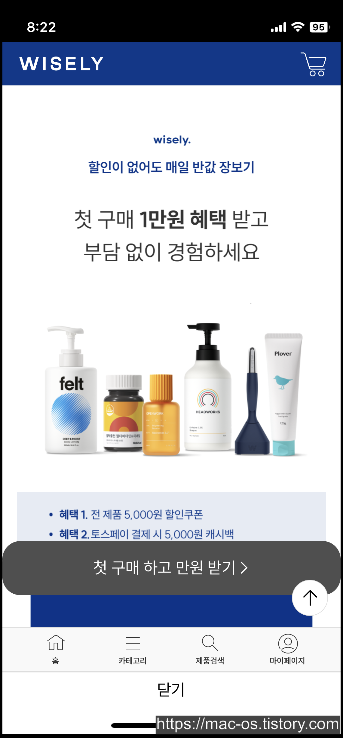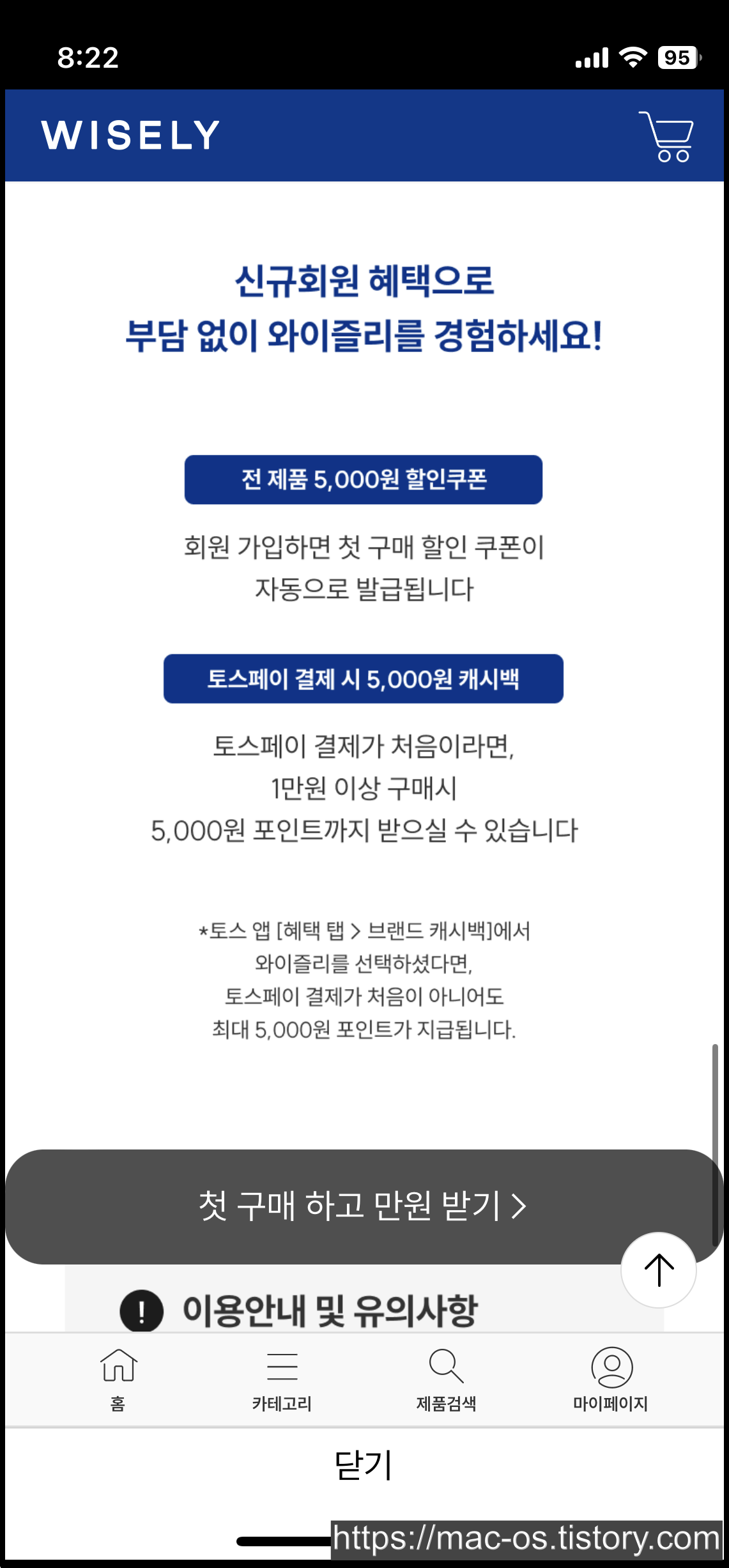 와이즐리에서 첫 구매 1만원 혜택을 받을 수 있습니다. 아까 받은 5천원 할인 쿠폰과 토스페이 결제 시 5천원 캐시백을 합해 총 1만원 혜택이 제공됩니다.