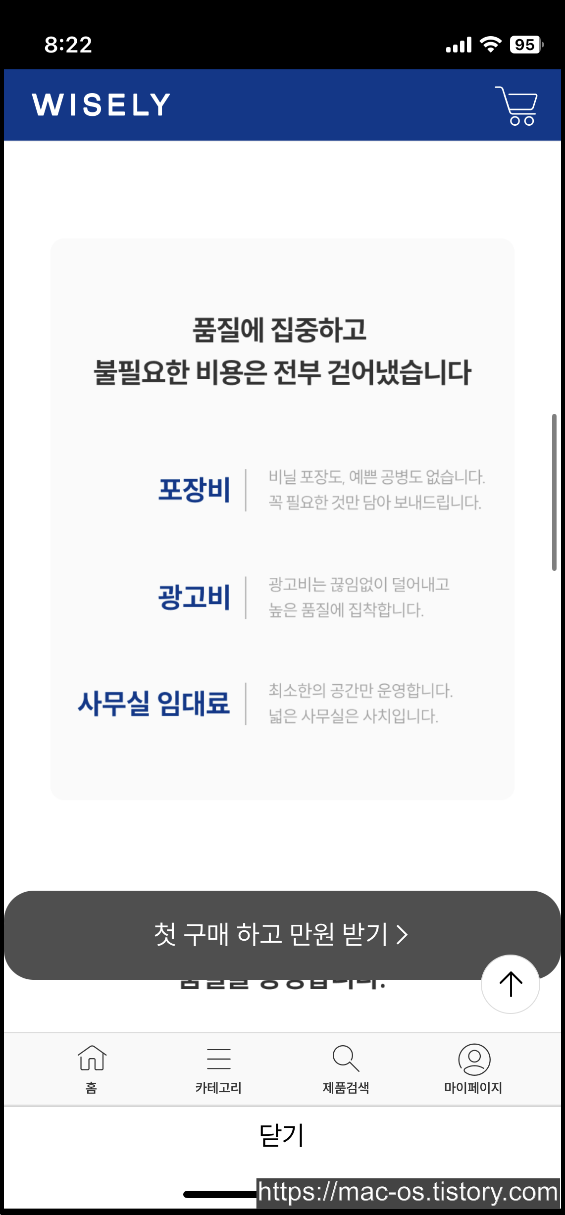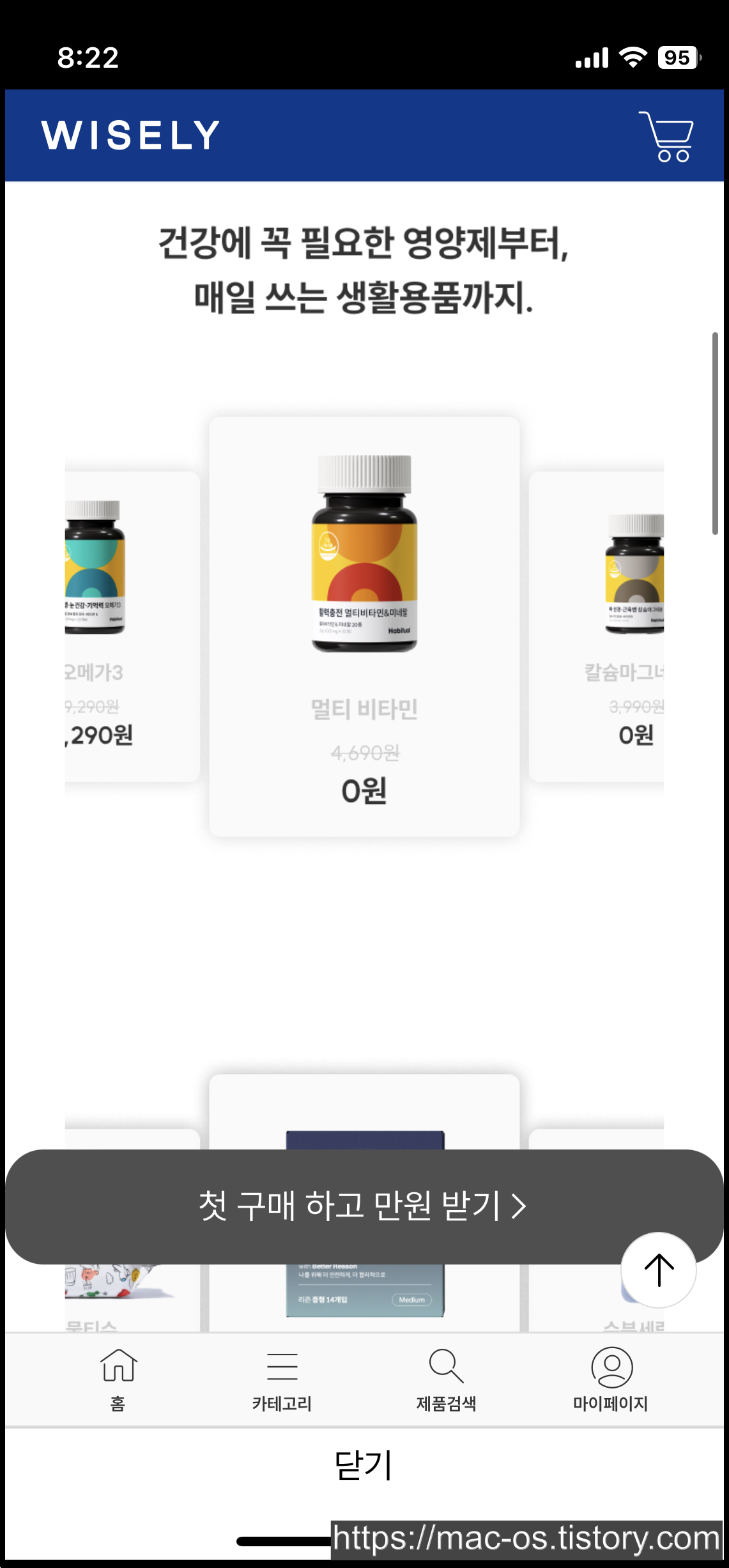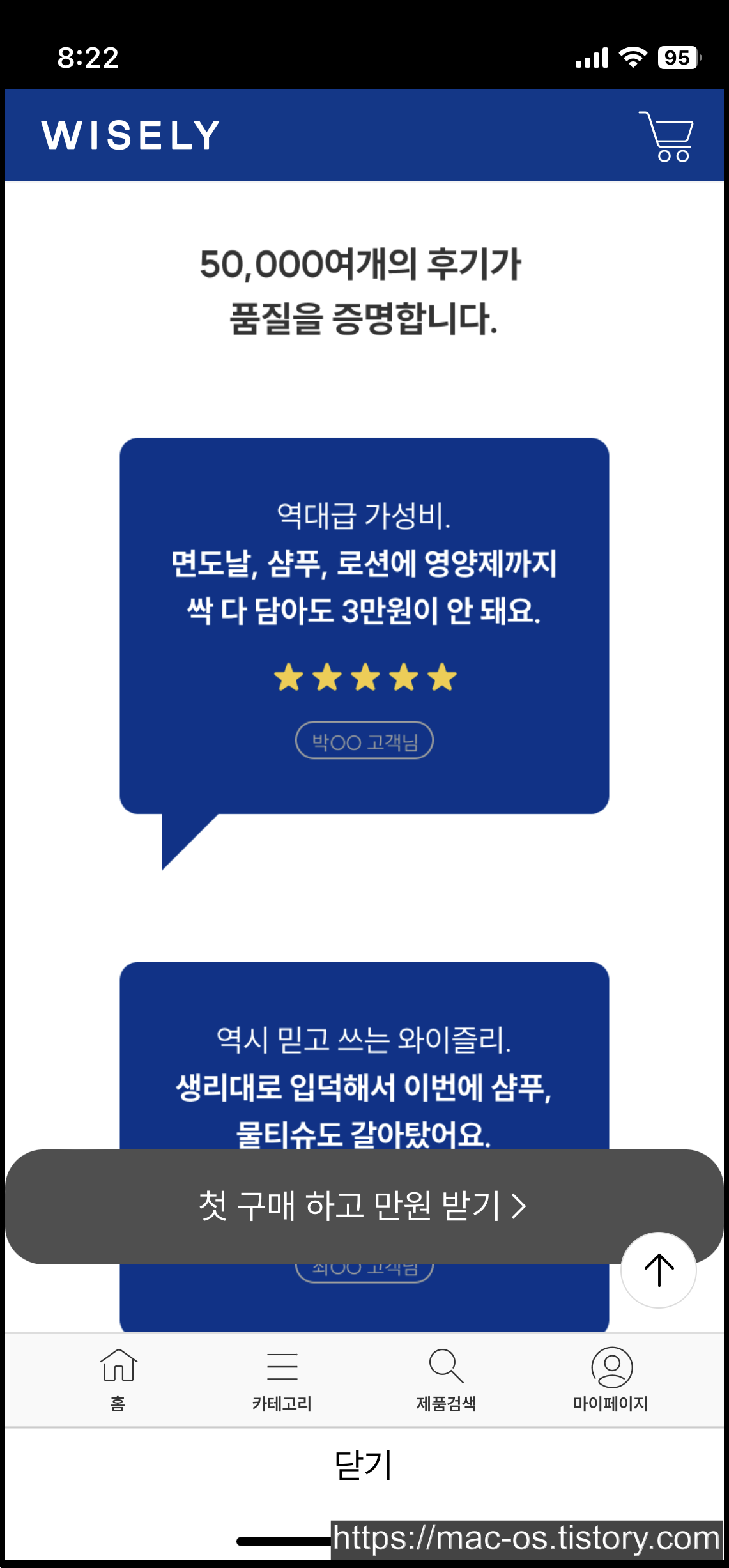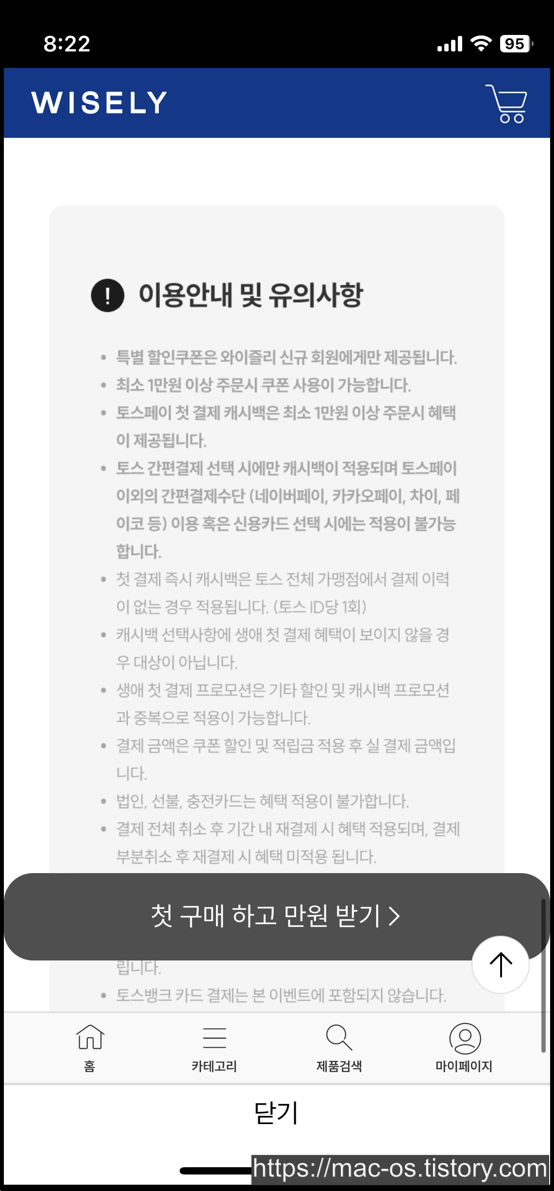 와이즐리에서 첫 구매 1만원 혜택을 받을 수 있습니다. 아까 받은 5천원 할인 쿠폰과 토스페이 결제 시 5천원 캐시백을 합해 총 1만원 혜택이 제공됩니다.