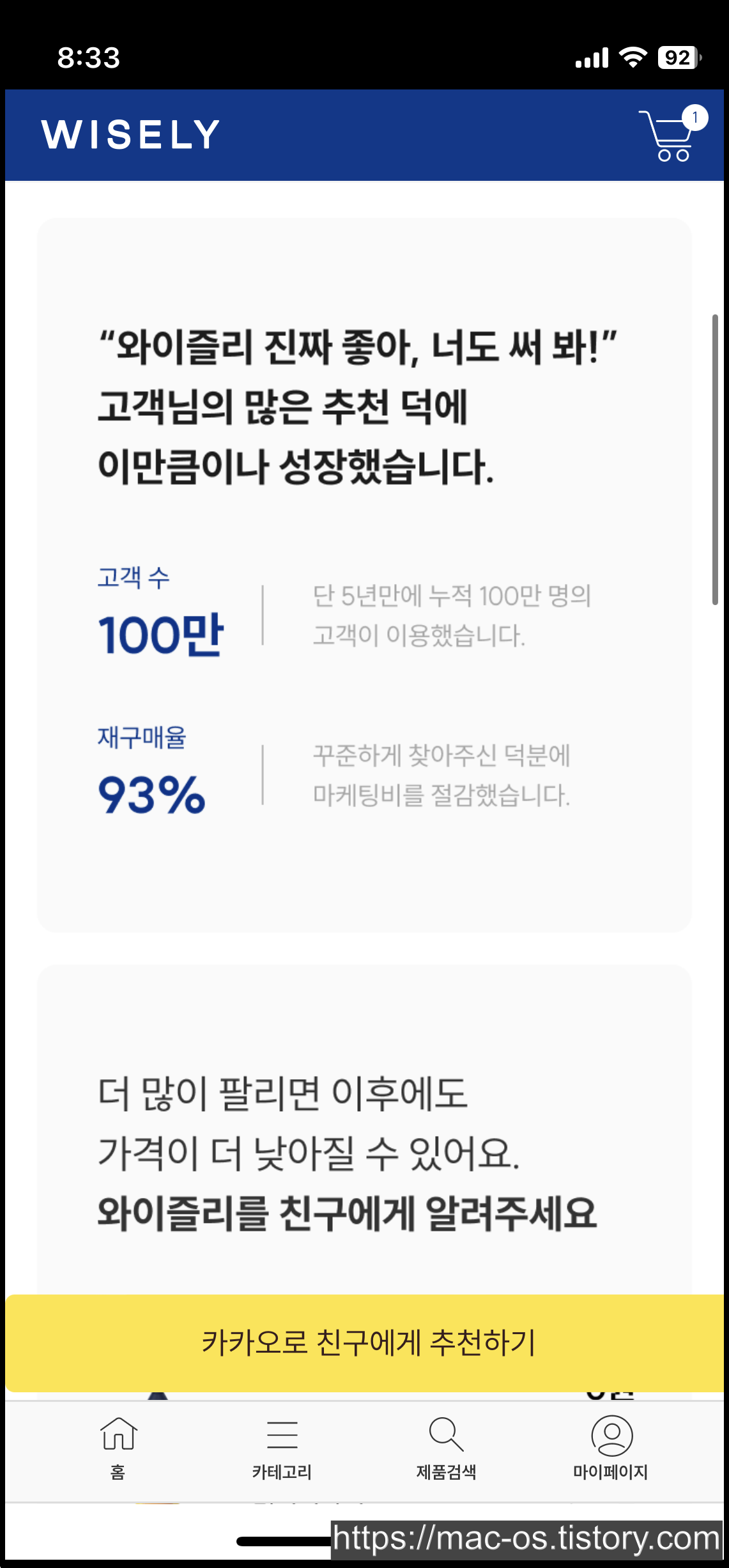 와이즐리 친구초대 이벤트에 대해 살펴보겠습니다. 와이즐리는 5년만에 누적 100만 명의 고객이 이용했으며, 재구매율 93%를 기록하여 마케팅비를 절감했다고 하네요.