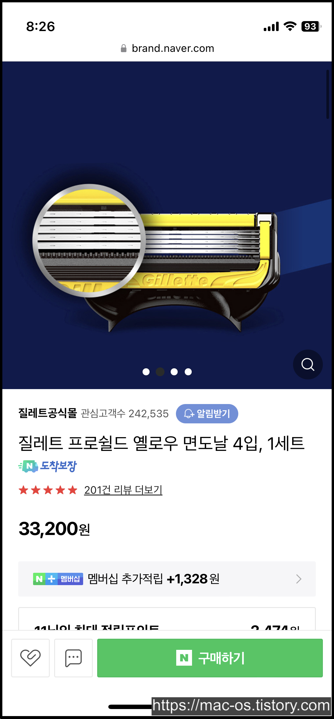 왼쪽 사진은 질레트 공식 쇼핑몰에서 판매하는 면도날 4입의 가격입니다. 면도날 4개가 33,200원인데 1개의 가격을 계산해보면 8,300원입니다.