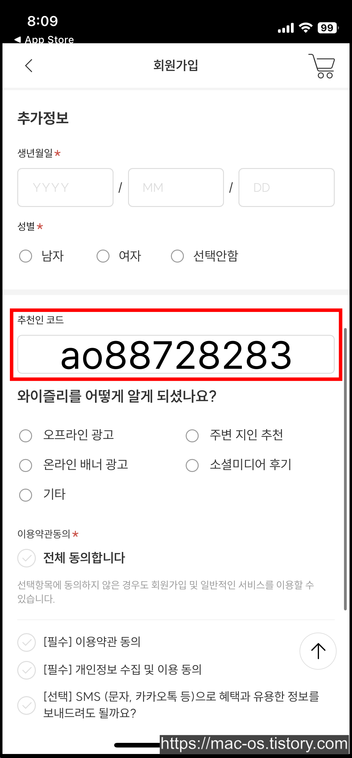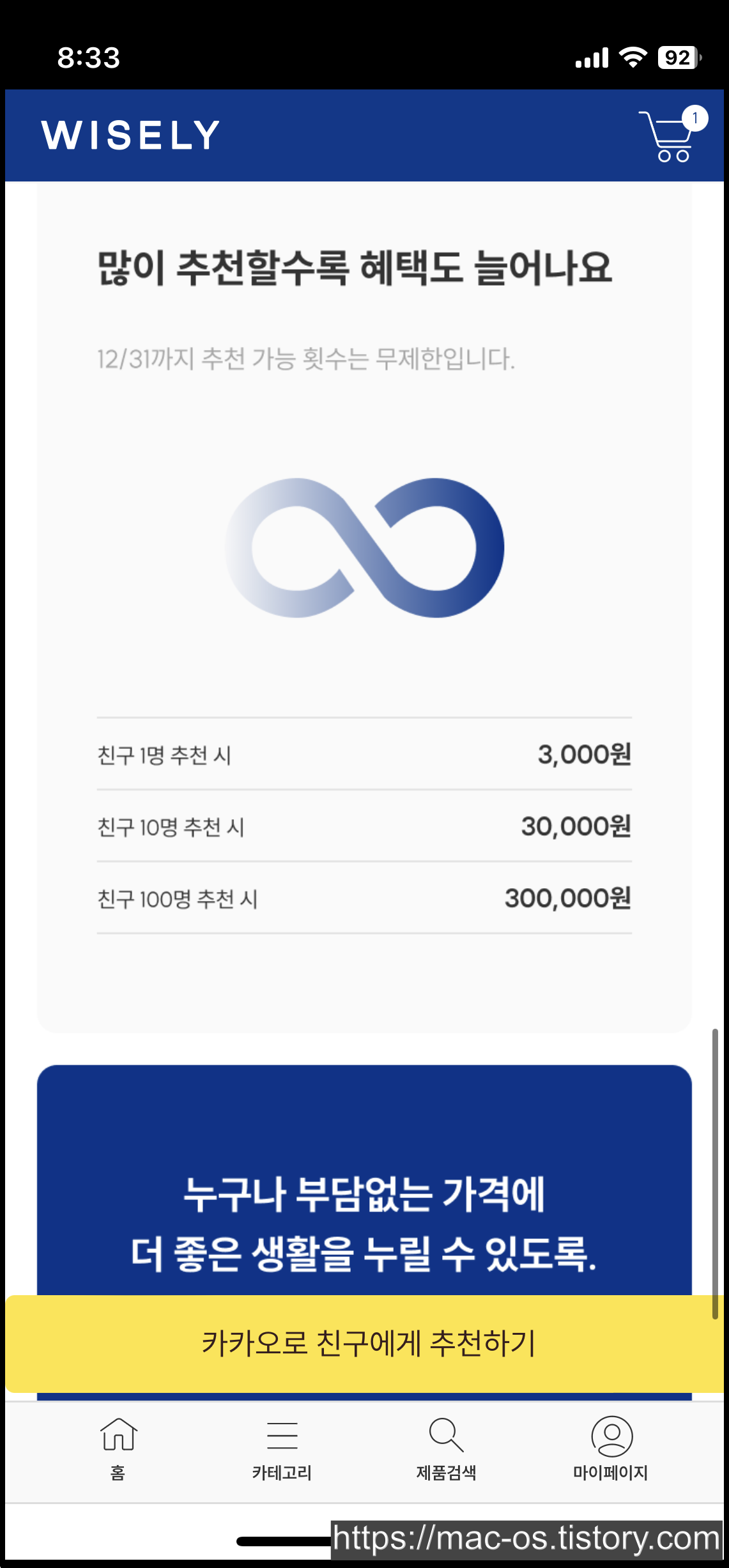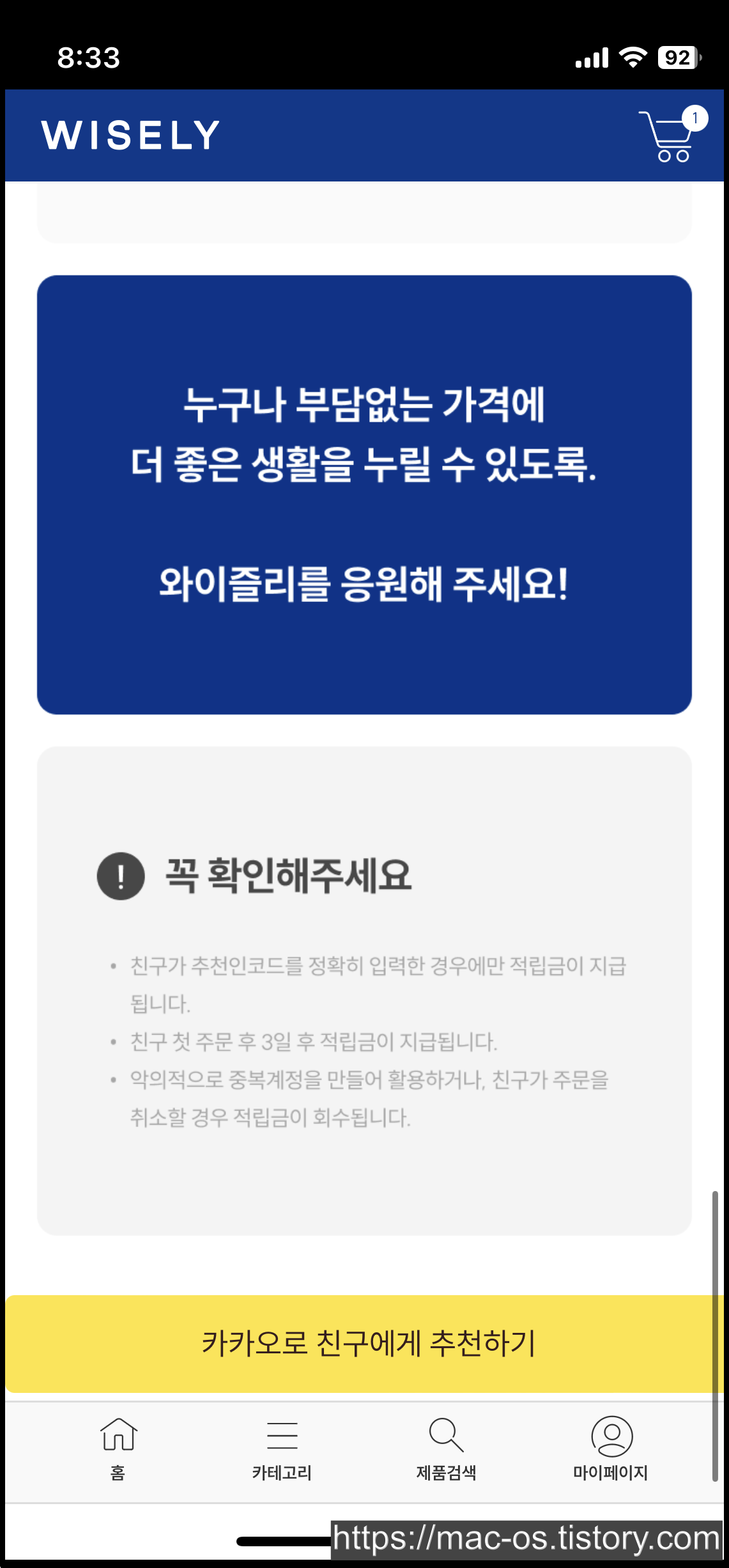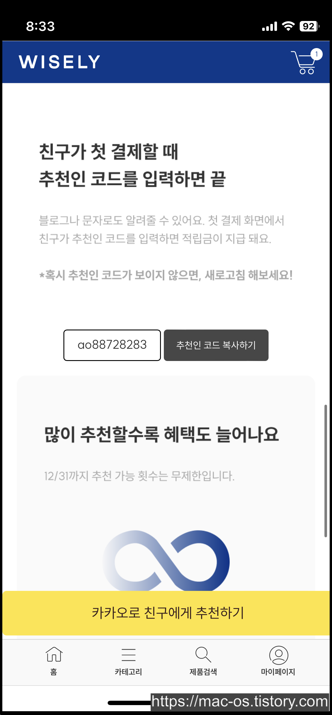 여기에는 첫 결제할 때 추천인 코드를 입력하면 된다고 되어 있지만, 아마 회원가입 페이지에서 추천인 코드를 입력해도 될 것 같네요. 회원가입할 때 입력하지 못한 분들은 첫 결제 페이지에서 추천인 코드 입력 창이 뜨는 것 같습니다.