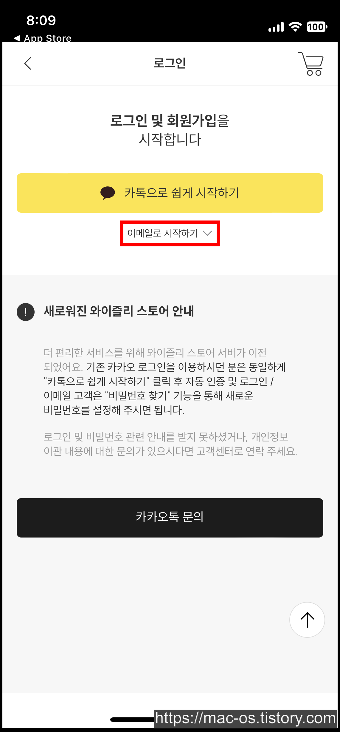회원가입은 카카오 계정 간편 로그인 또는 이메일 가입 중 하나를 선택하여 진행할 수 있습니다.