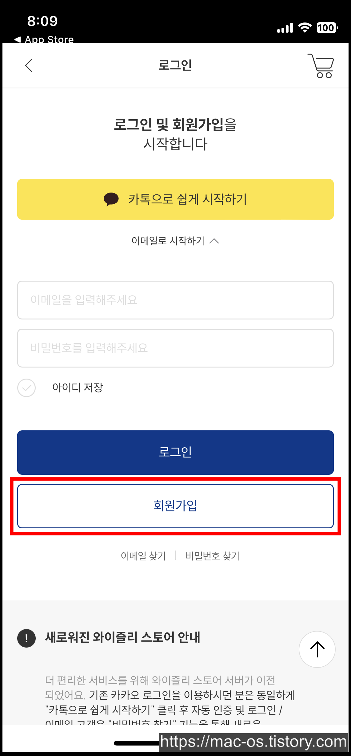 와이즐리는 웹사이트 또는 앱스토어에서 설치하여 앱으로 이용할 수 있습니다. 앱 설치 이후 마이페이지로 이동하여 회원가입을 진행합니다.
