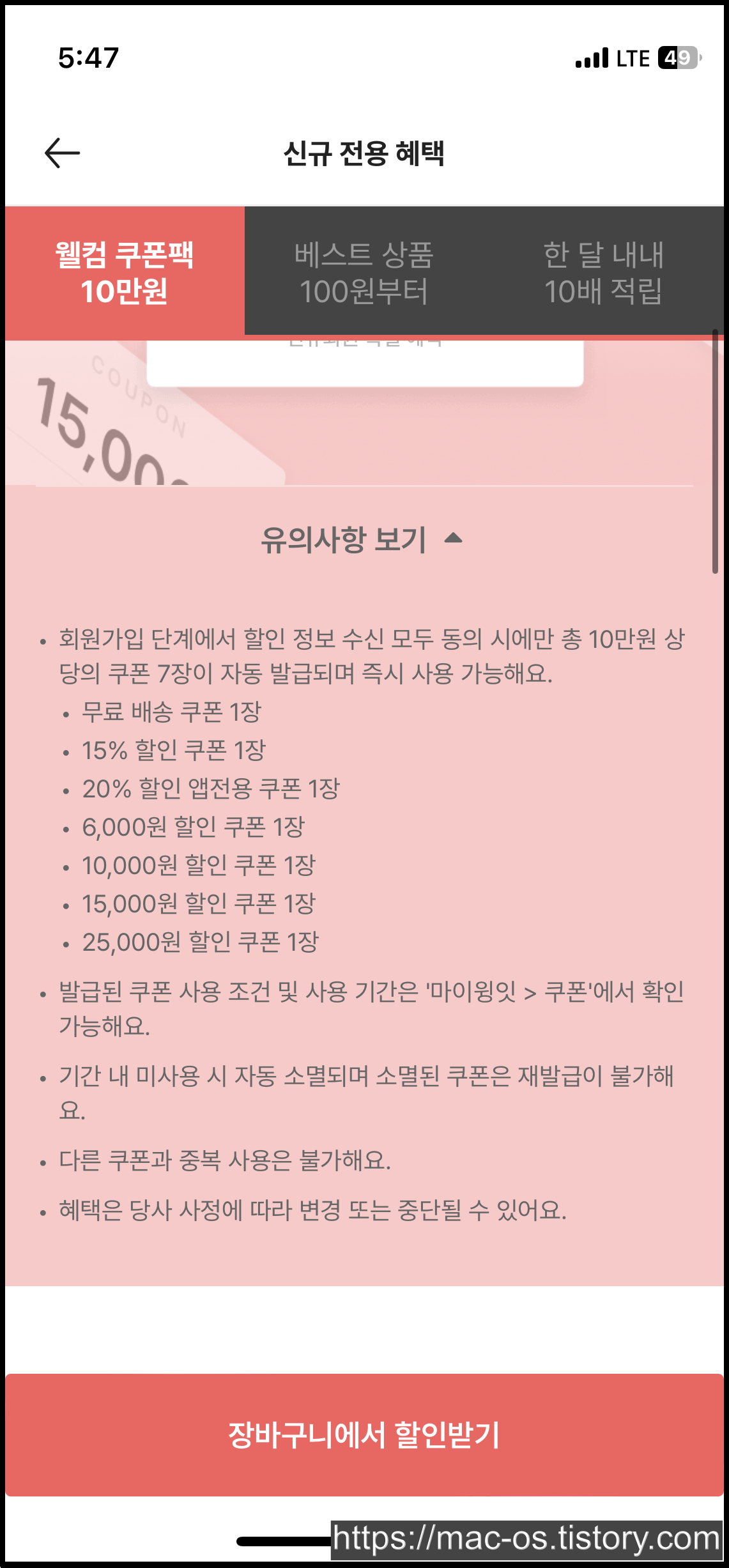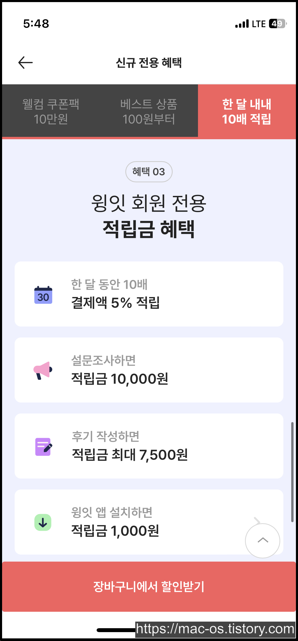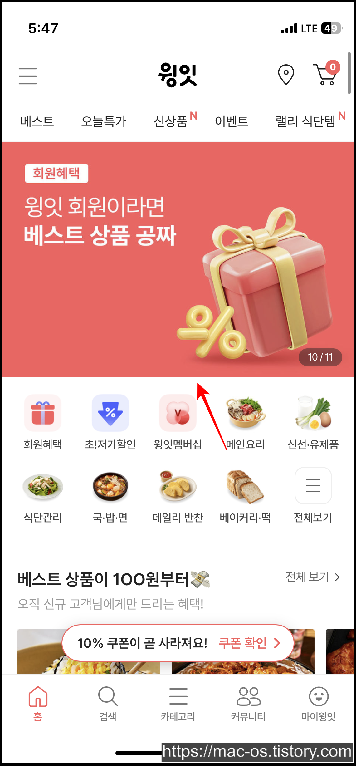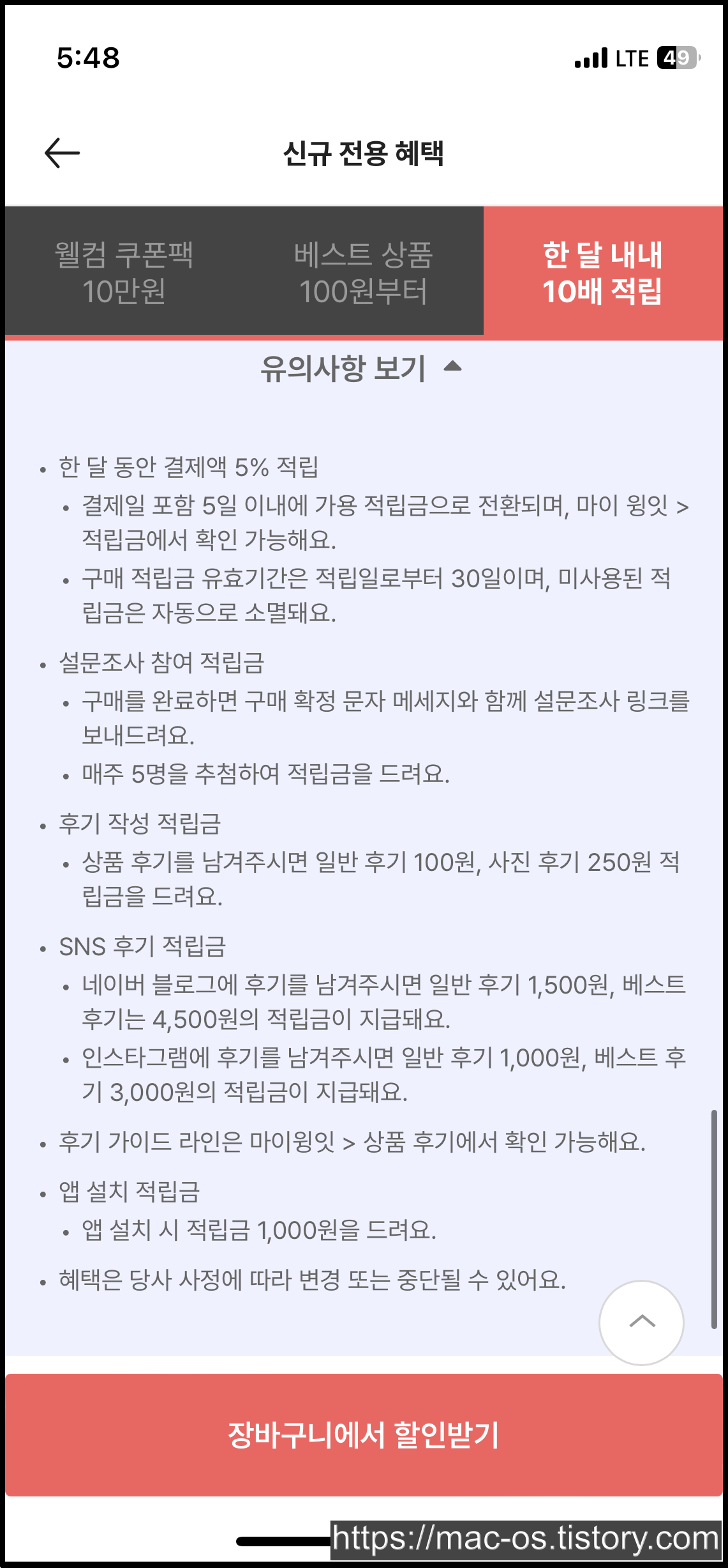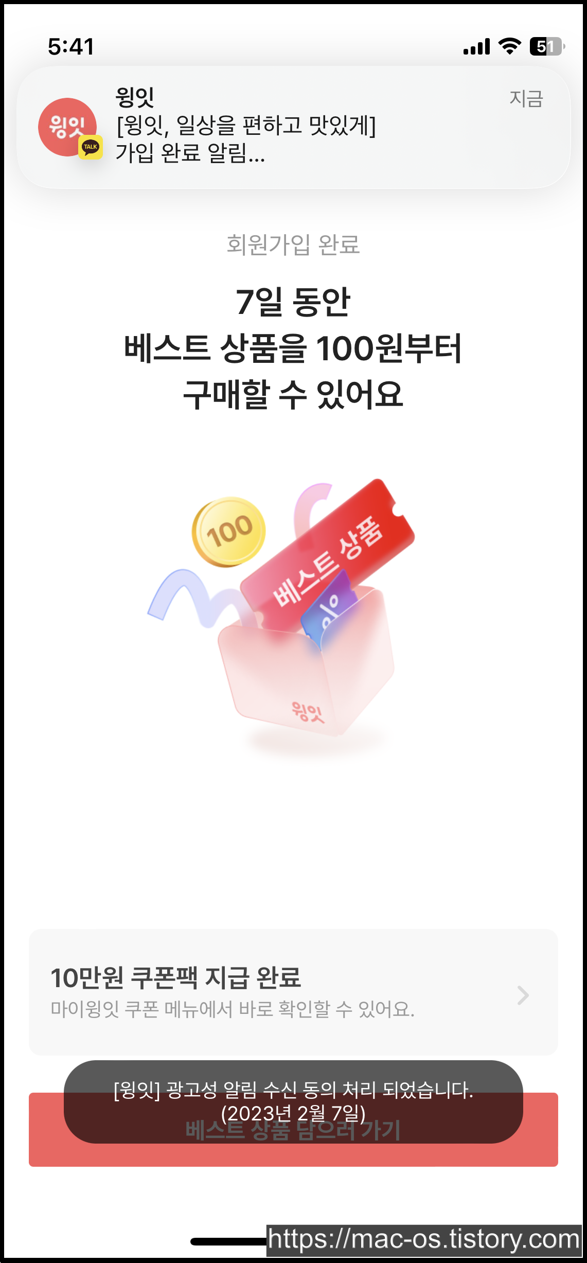 회원가입을 마치면 앱설치 보상적립금 천원과 앱전용쿠폰 장바구니 10%할인 쿠폰이 지급되어 있습니다.