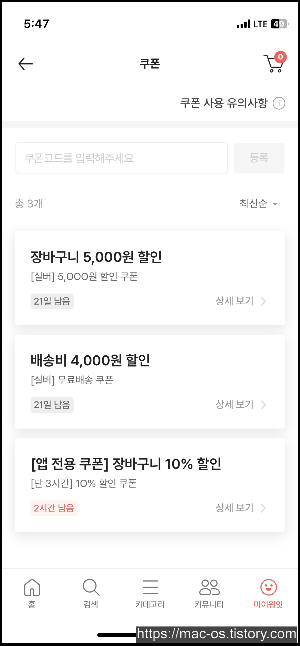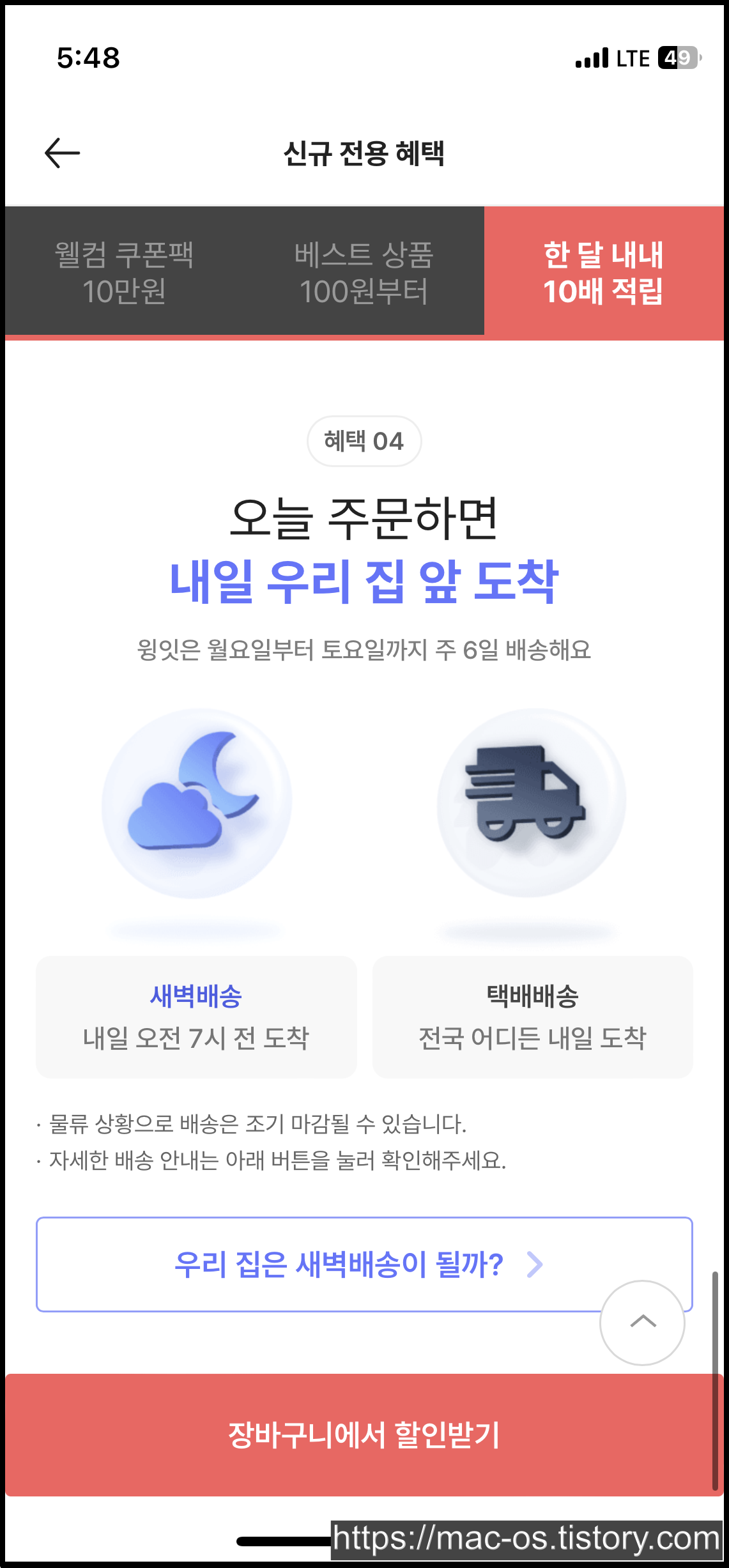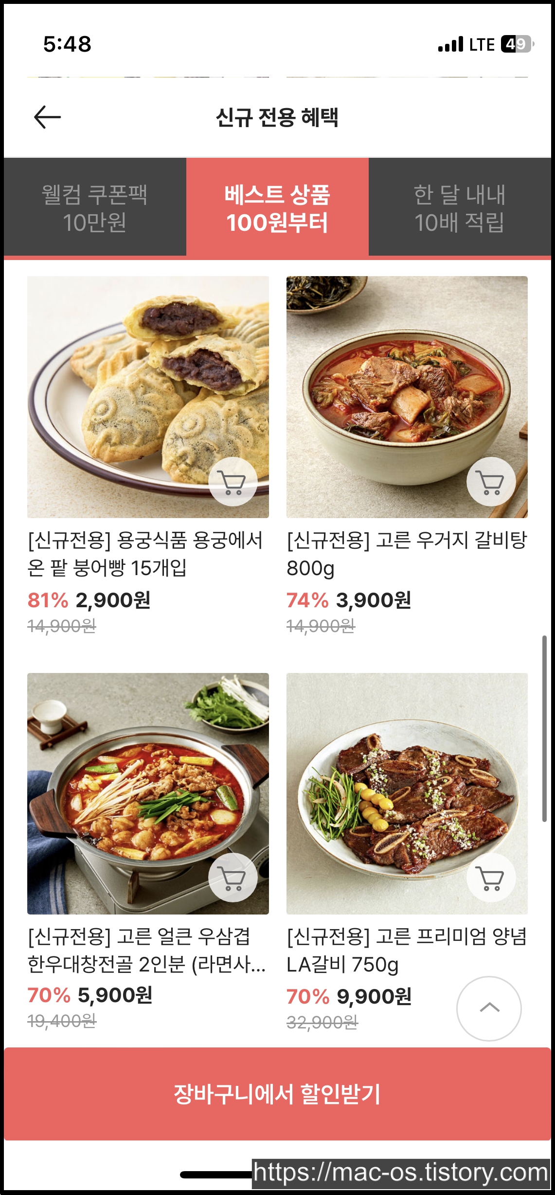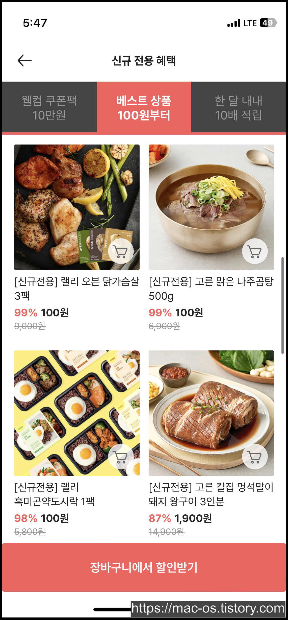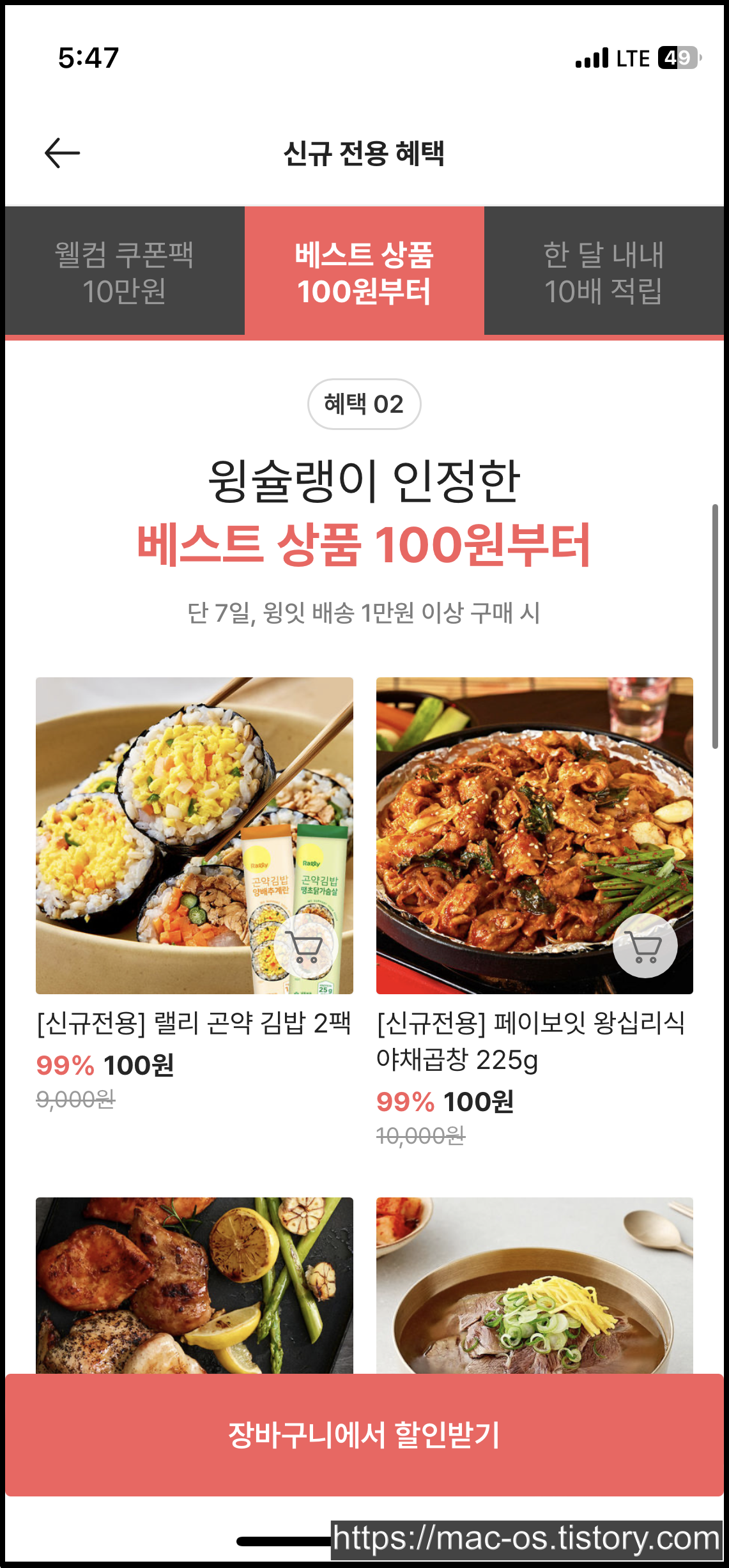 회원가입을 마치면 앱설치 보상적립금 천원과 앱전용쿠폰 장바구니 10%할인 쿠폰이 지급되어 있습니다.