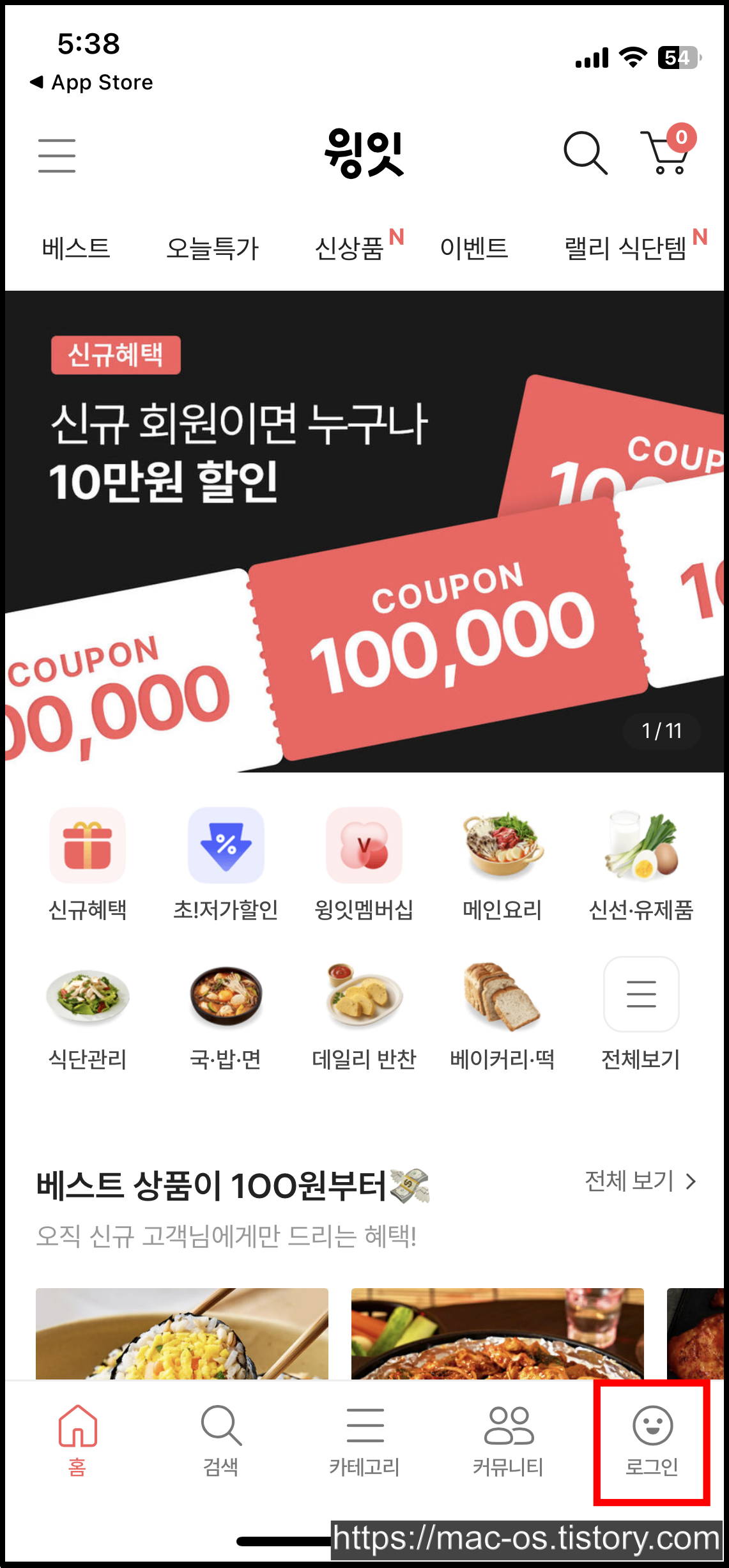 현재 신규 회원가입 시 10만원 웰컴팩과 첫구매 100원 상품 등의 이벤트를 진행하고 있으며, 앱 설치 시 적립금 1,000원, 추천인 입력 후 첫구매 시 3,000원을 추가로 받을 수 있습니다.