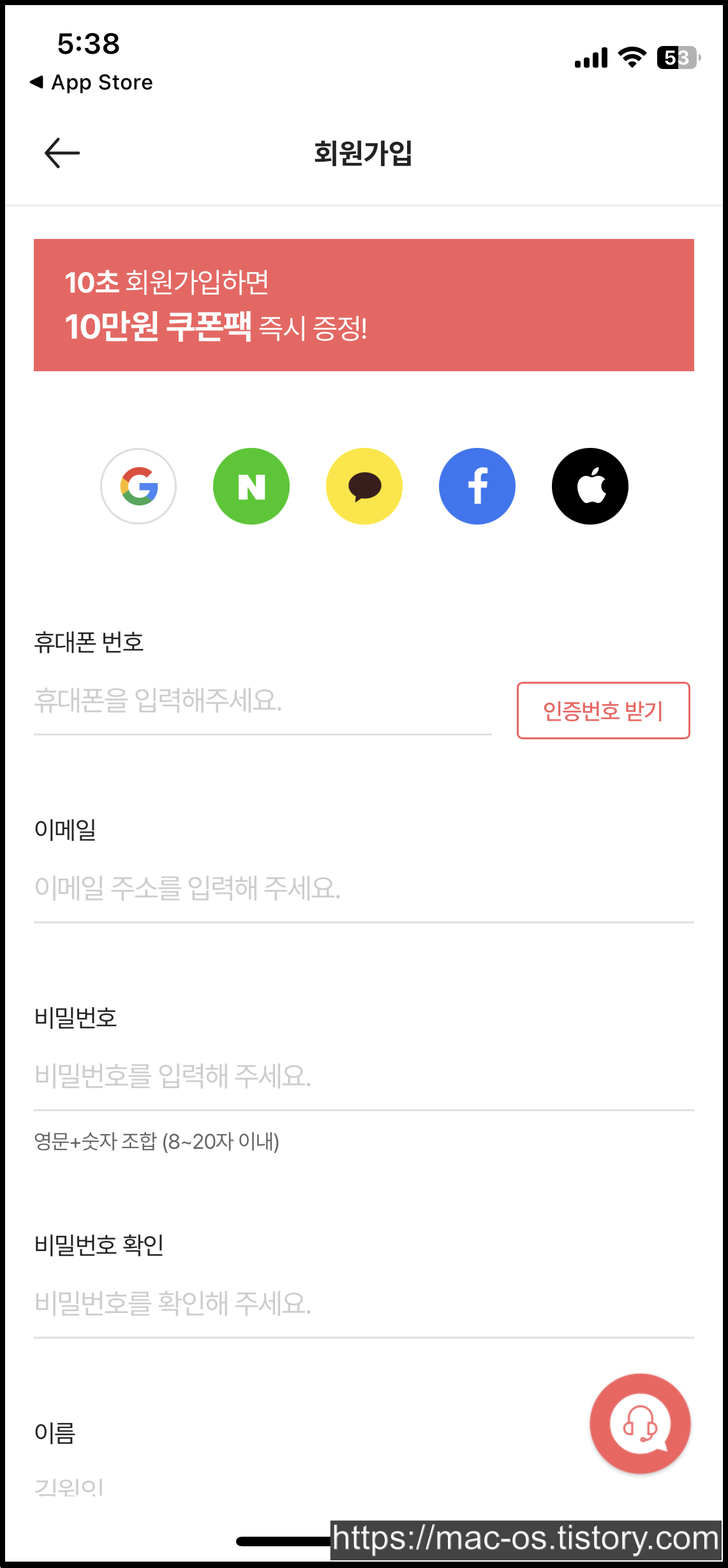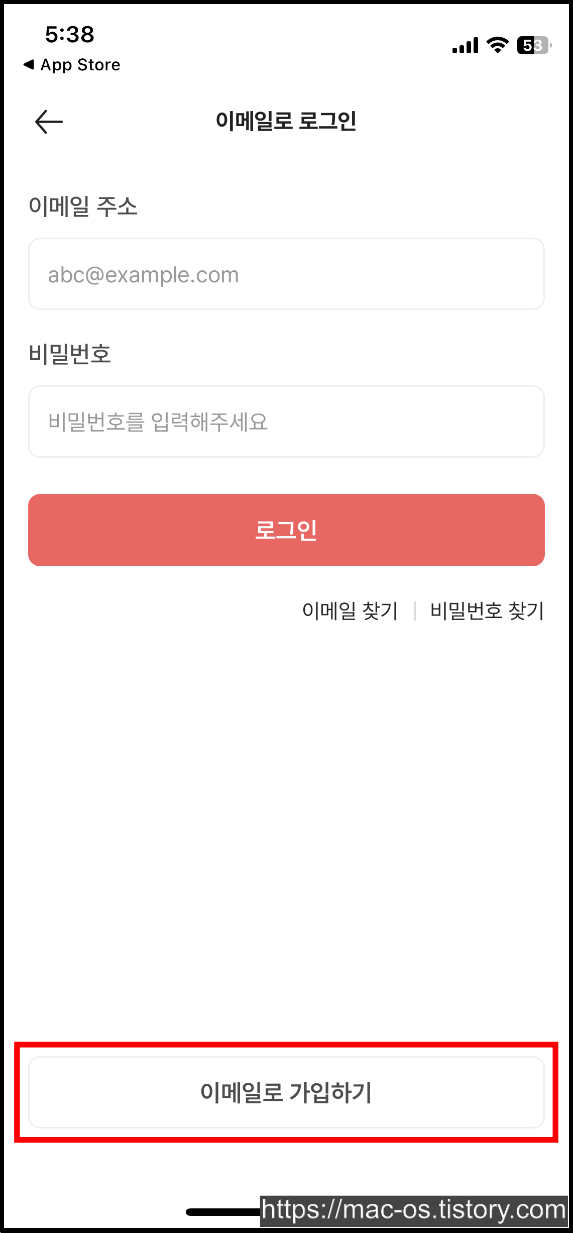 로그인 탭에서 로그인/회원가입으로 이동해 회원가입을 진행합니다.