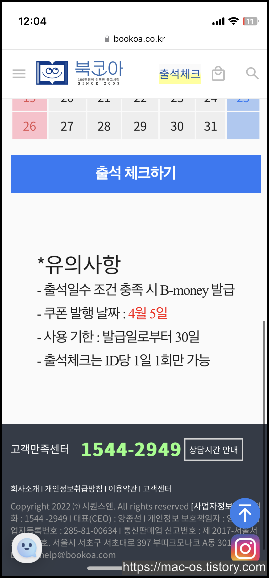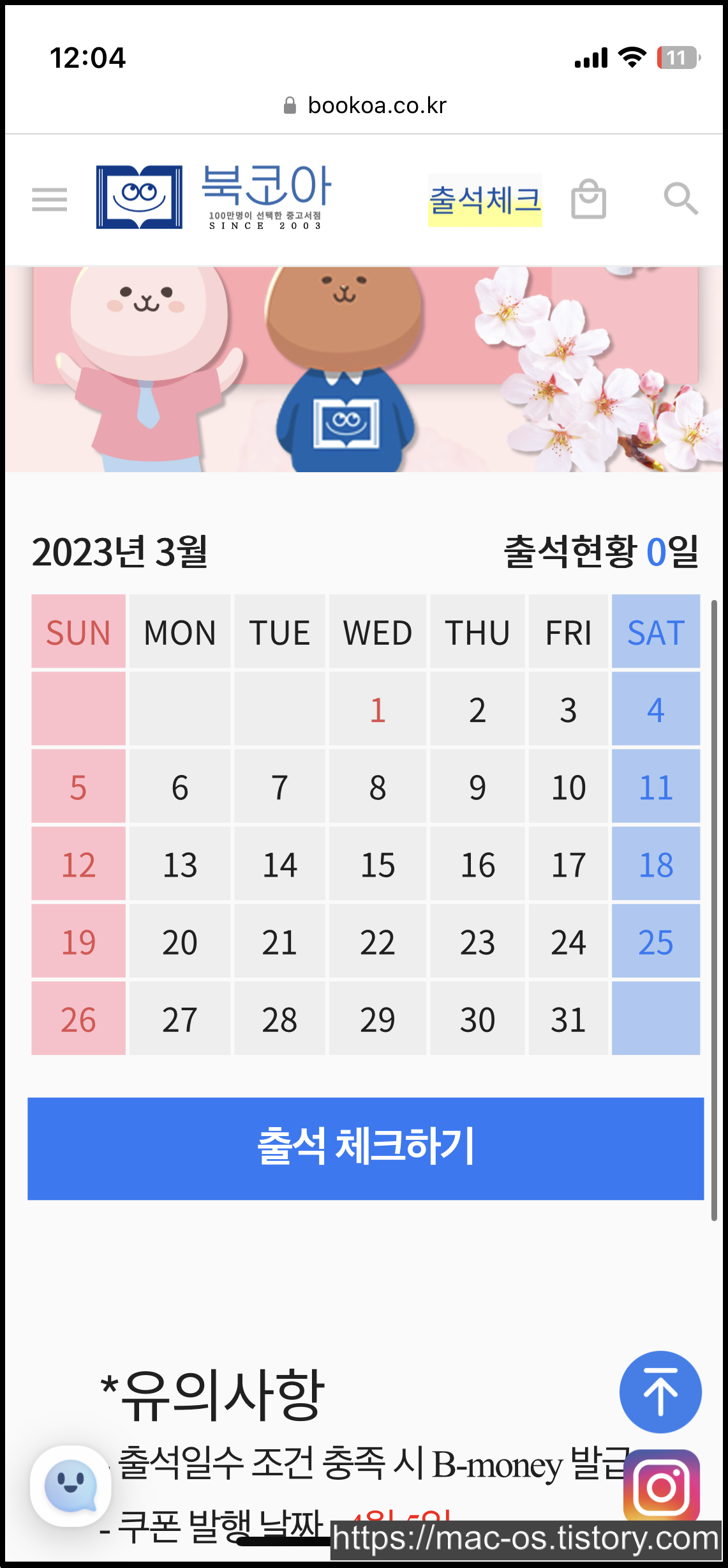출석 체크하기 버튼을 누르면 출석할 수 있다. 출석일수 조건을 충족하면 B머니가 발급되며, 쿠폰 발행 날짜는 다음달 초에 지급되는 듯하다.
