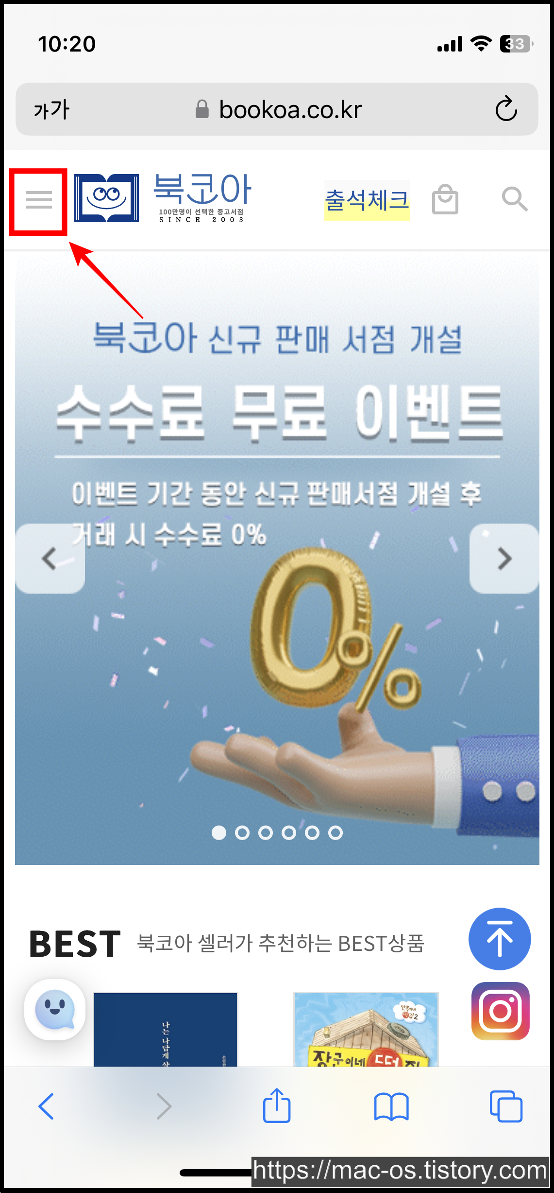 북코아는 네이버 검색창에서 검색해서 사이트로 이동할 수 있다. 북코아 사이트로 이동한 뒤 좌측 상단의 더보기 메뉴를 클릭한다.