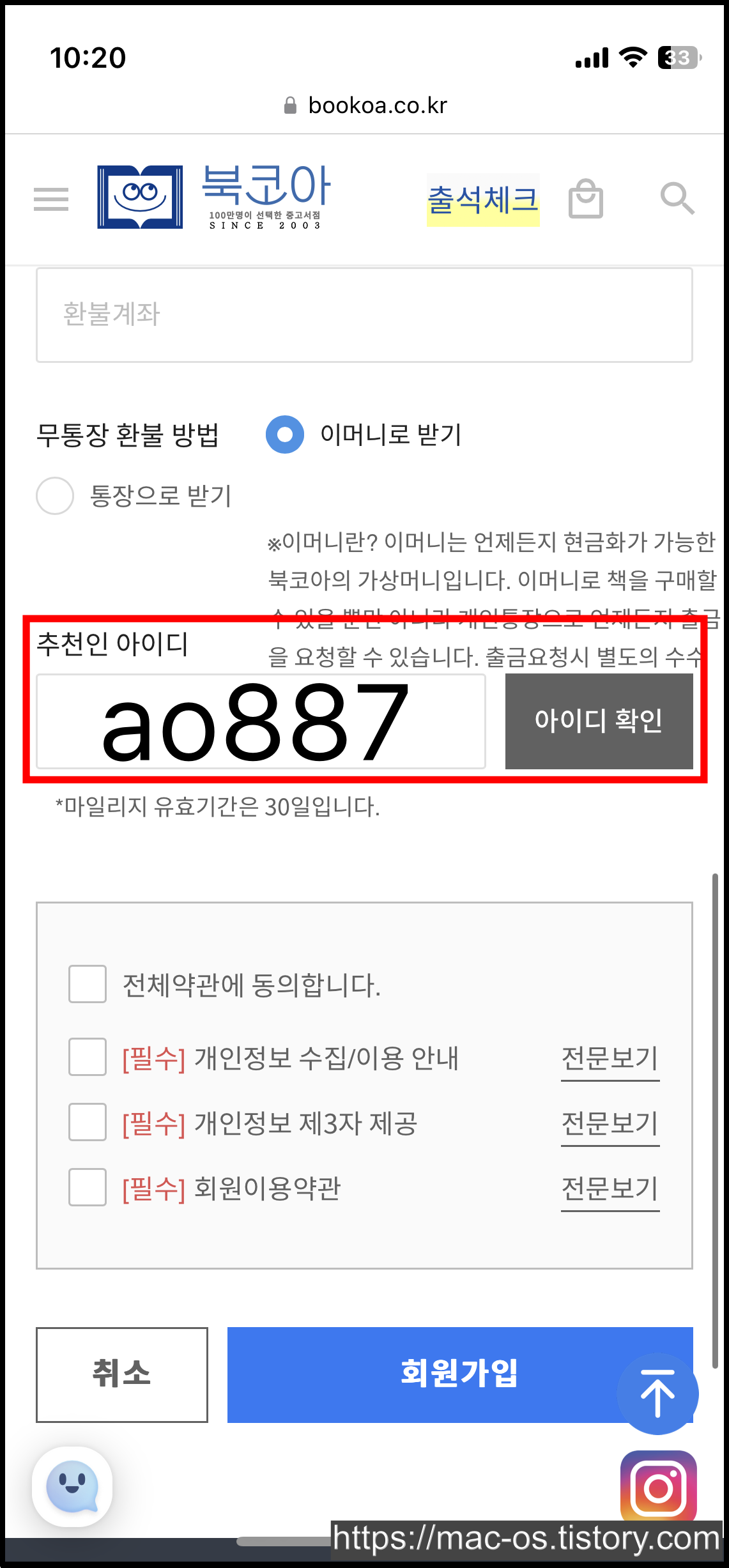 가입 페이지 하단에서 추천인 아이디를 입력할 수 있다. 추천인 아이디는 ao887을 입력하면 B머니 1,000P를 받을 수 있다.