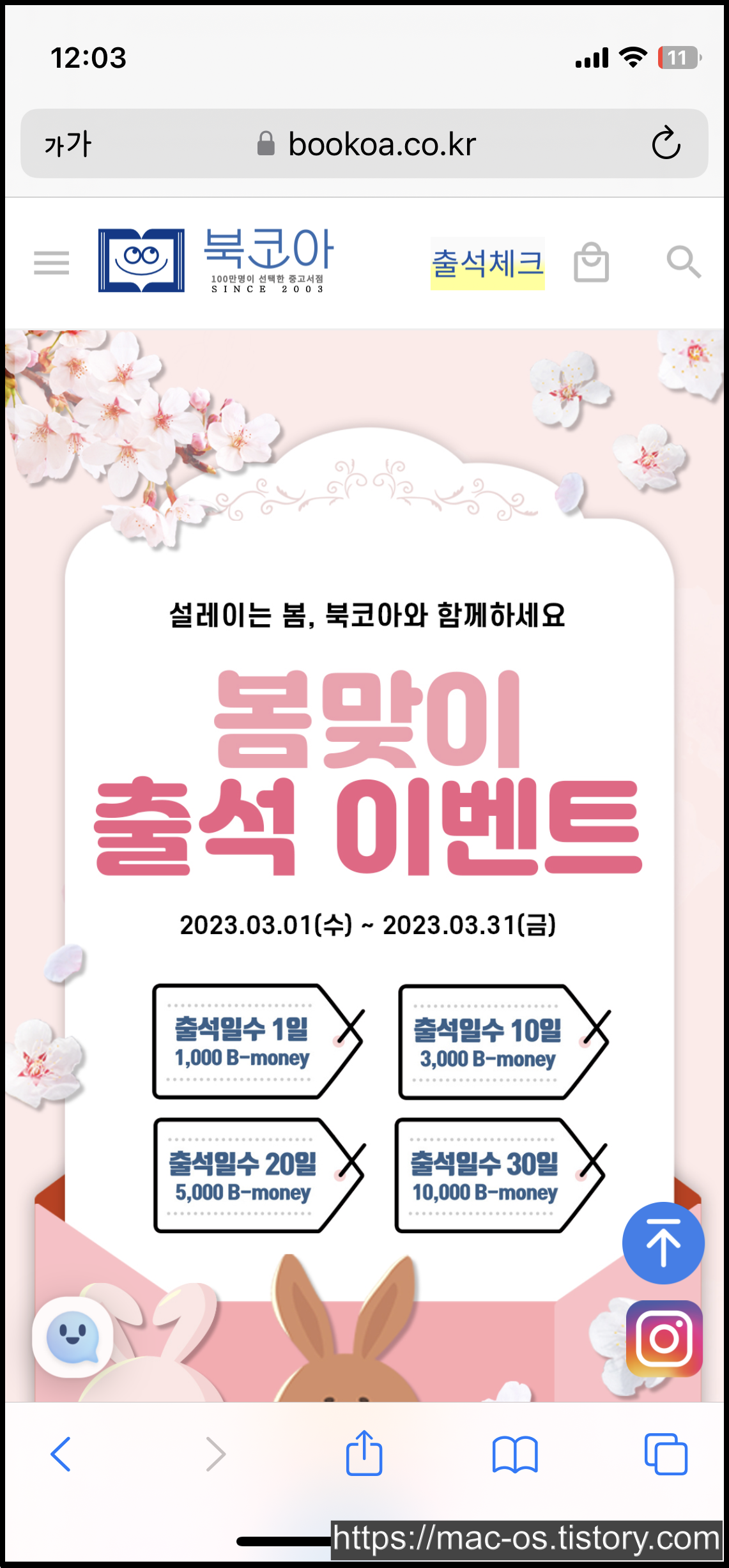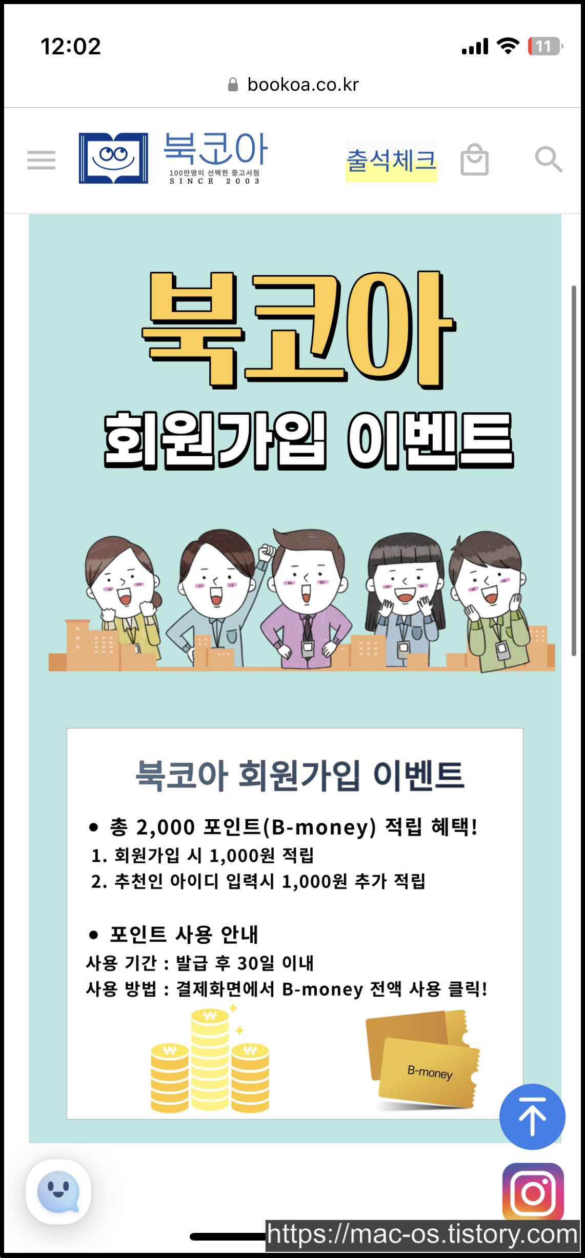북코아에서 상시 진행하고 있는 회원가입 이벤트다. 회원가입 시 1,000원, 추천인 아이디 입력 시 1,000원을 추가로 적립받을 수 있다. 포인트는 적립일로부터 30일간 유효하며 결제화면에서 현금처럼 사용할 수 있다.