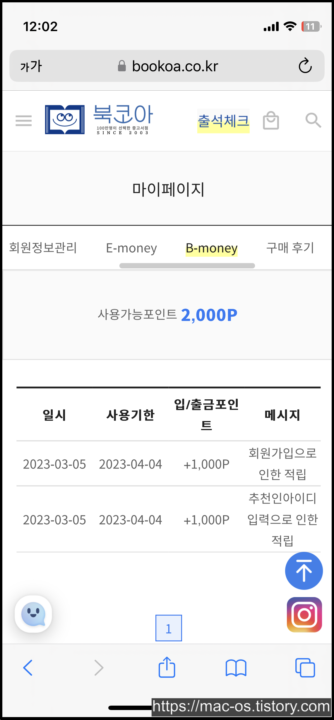 회원가입 후 B머니 적립내역을 살펴보면 회원가입과 추천인 입력 보상으로 각각 1,000P가 적립된 것을 확인할 수 있다.