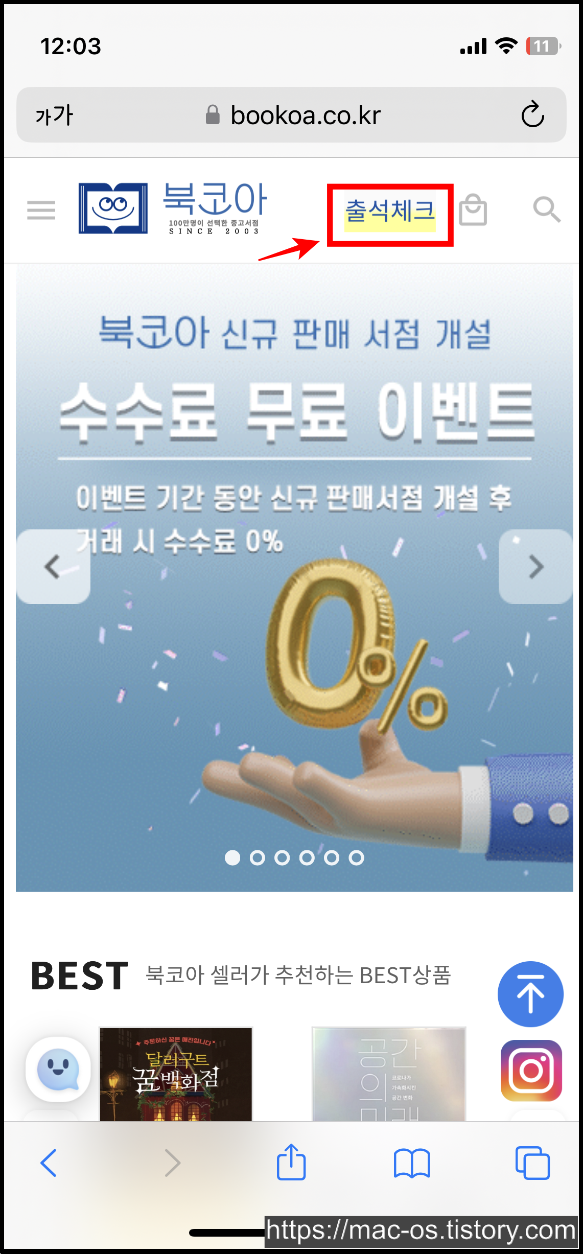 북코아에서는 출석체크로 포인트를 받을 수도 있다. 출석일수 1일, 10일, 20일, 30일에 따라 각각 1,000P, 3,000P, 5,000P, 10,000P가 지급된다.