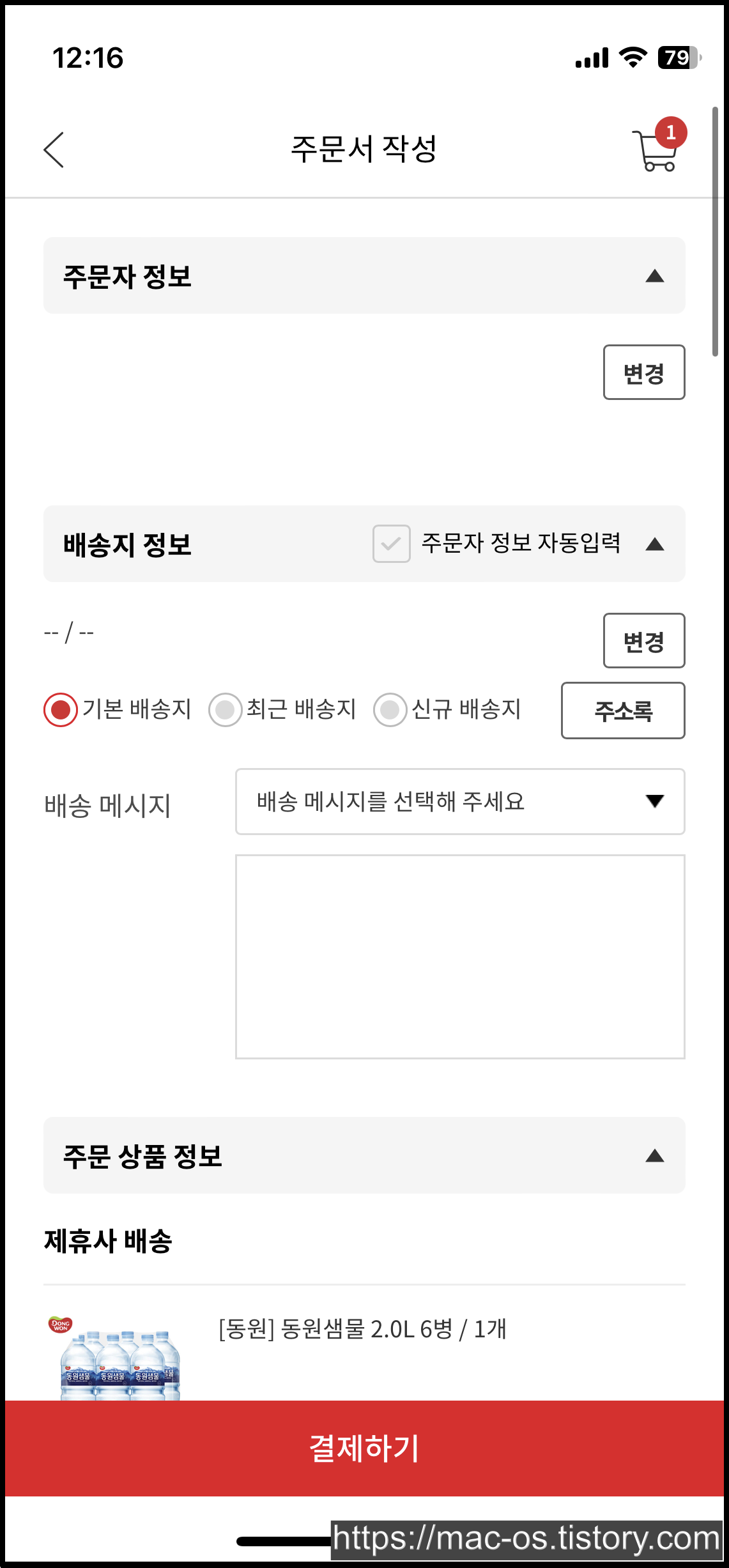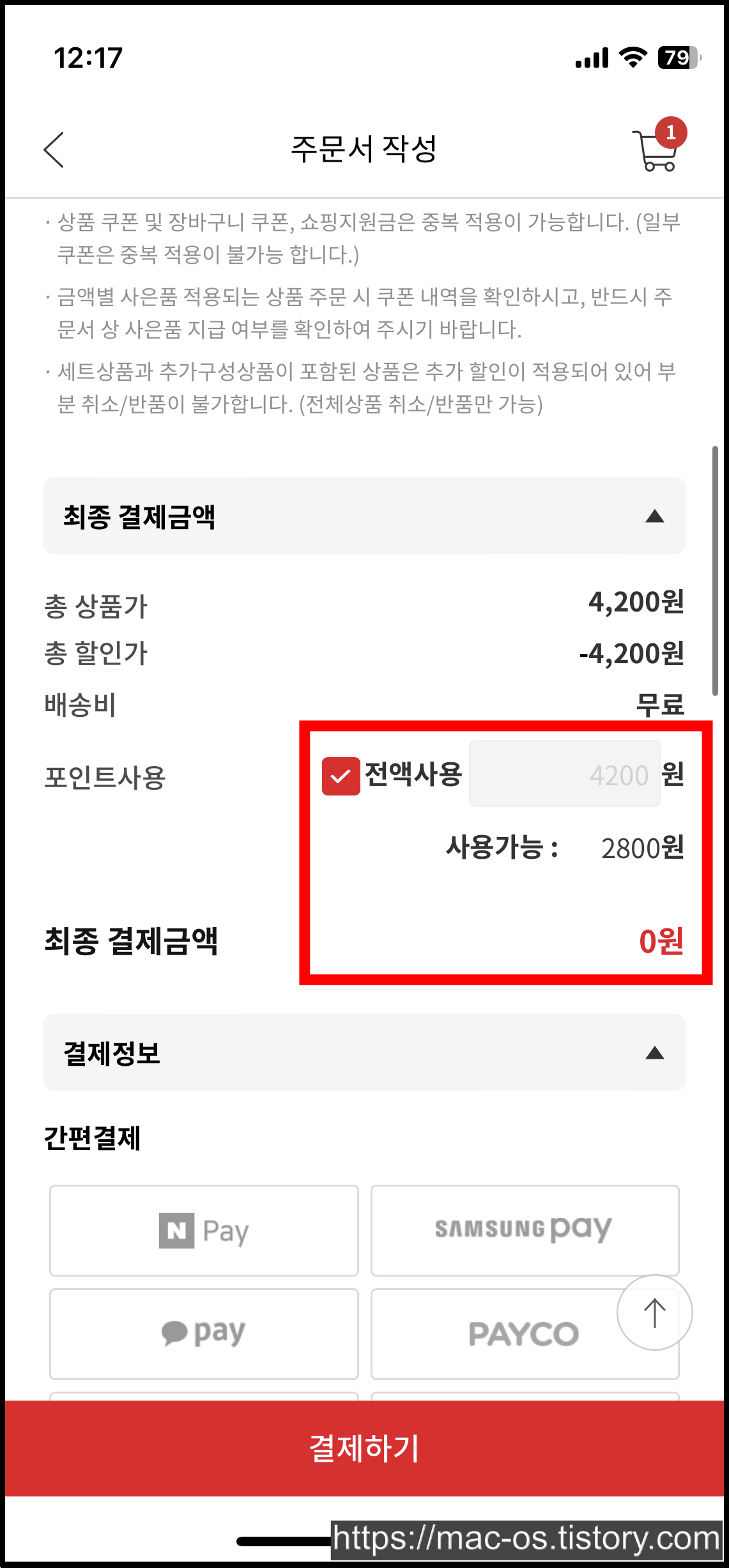 가입 직후 받은 7,000원을 어떻게 사용할 수 있을지 확인하려고 아무 상품이나 장바구니에 넣고 결제 화면으로 이동해봤다.