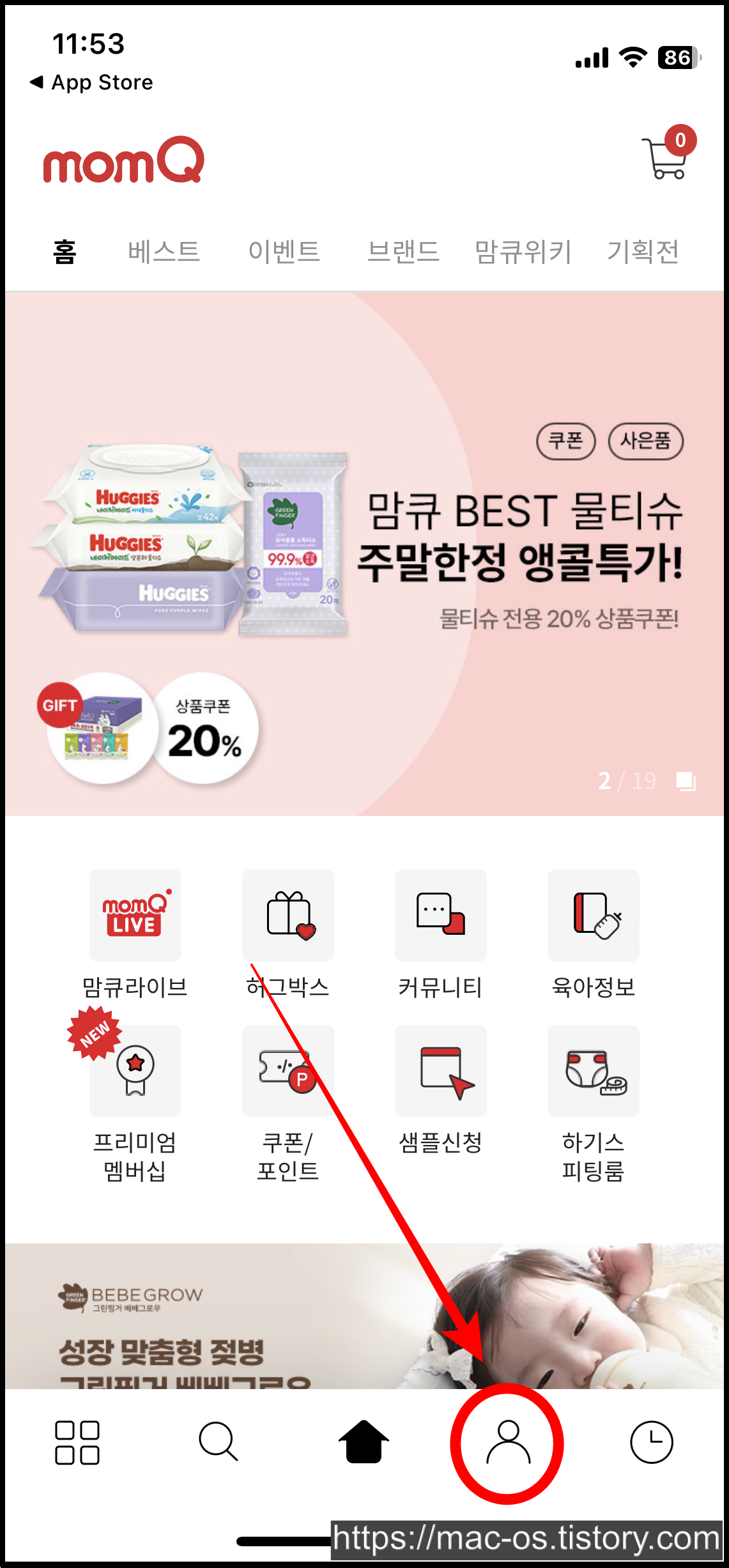 맘큐는 앱스토어나 구글 플레이 스토어에서 설치할 수 있다. 설치 후 하단 프로필 탭을 터치