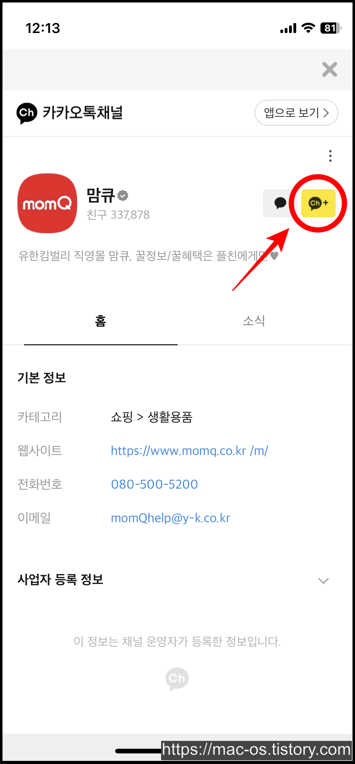 이벤트 페이지에서 맘큐 카카오플친 배너를 터치하면 우측 화면과 같이 이동하게 되는데, 카카오톡 플러스 친구 추가를 하면 17% 할인 쿠폰을 받을 수 있다.