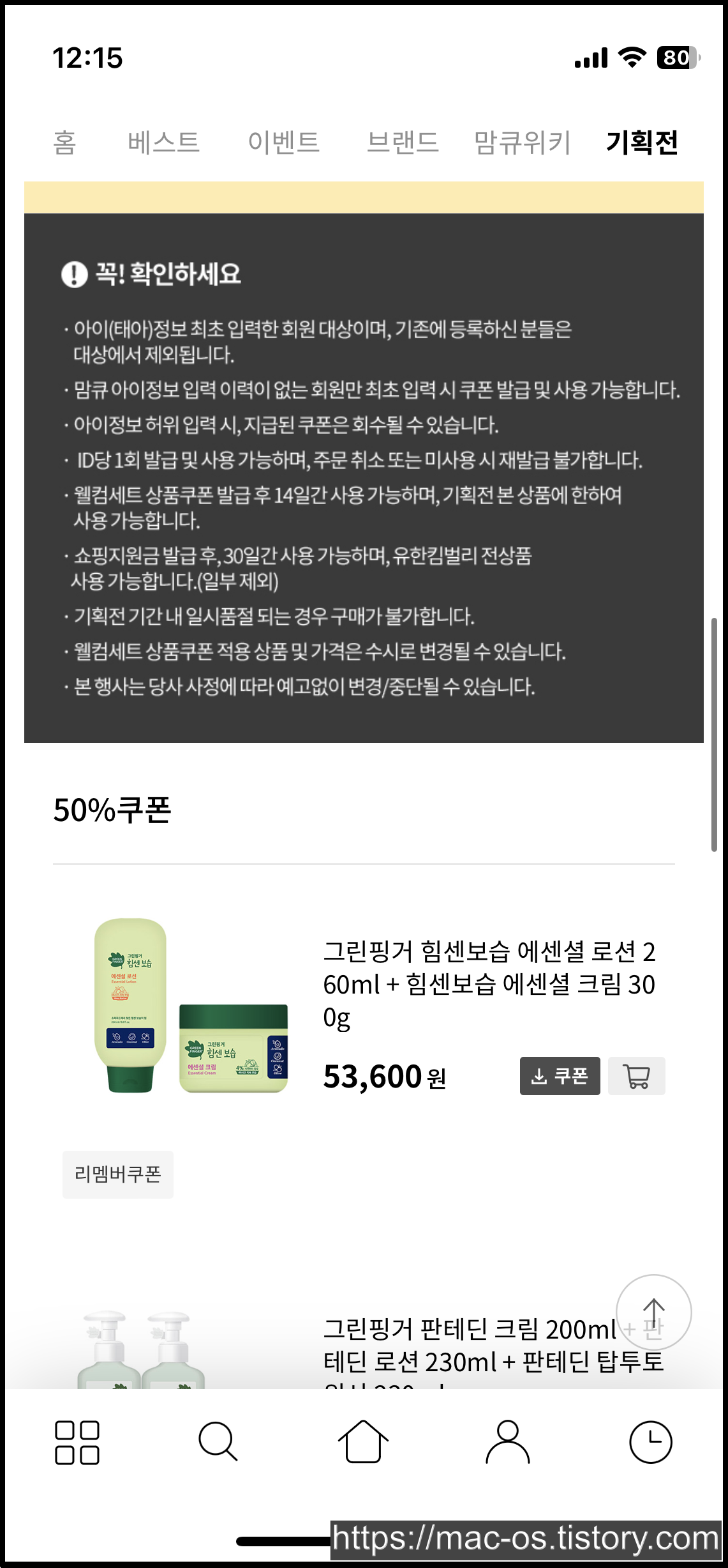아이정보를 입력하지 않은 누구나 참여할 수 있으며, 50%, 40%, 30% 쿠폰 별로 사용할 수 있는 상품이 정해져 있는 것 같다.