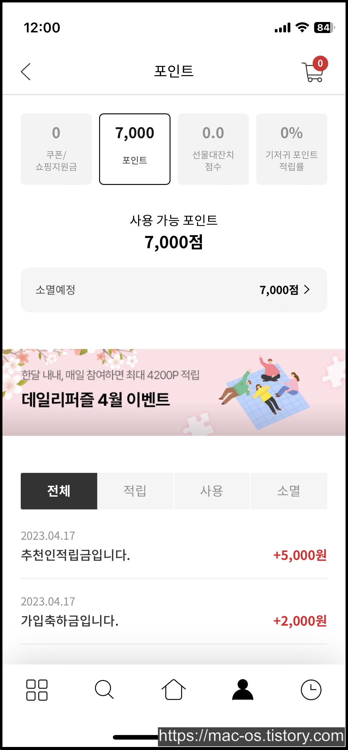 회원가입 후 포인트 적립내역 페이지로 이동해보면 추천인 적립금과 가입 축하금으로 총 7,000원이 적립된 것을 볼 수 있다.